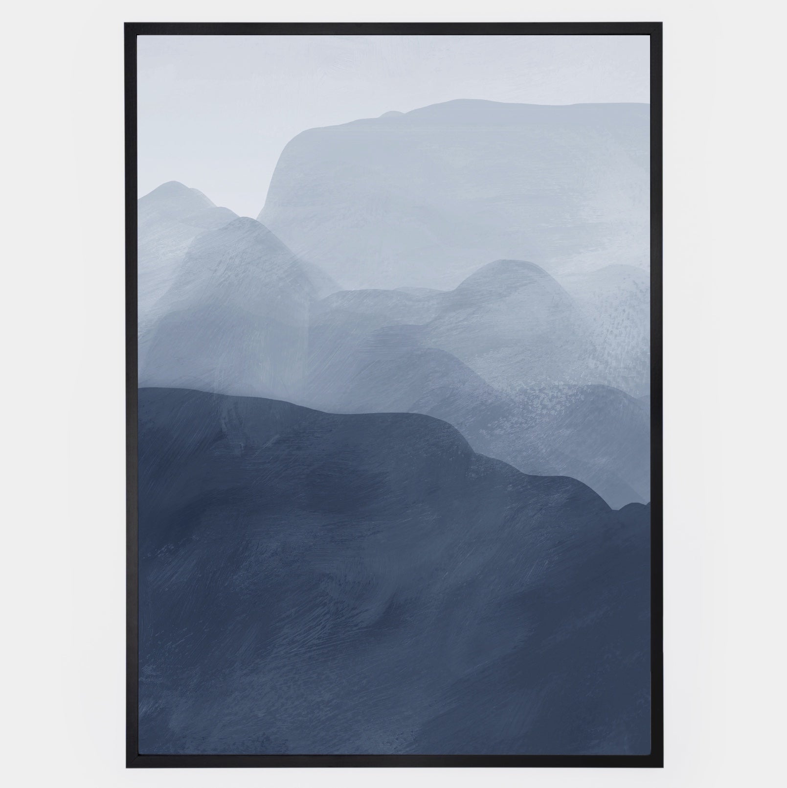 Poster with abstract graphics of blue mountains "Blue Mountains" No. 1. The poster is sold without a frame, with the option to order a thin wooden frame with a thickness of 1.2 cm. There are three color options to choose from - white , black and oak design.