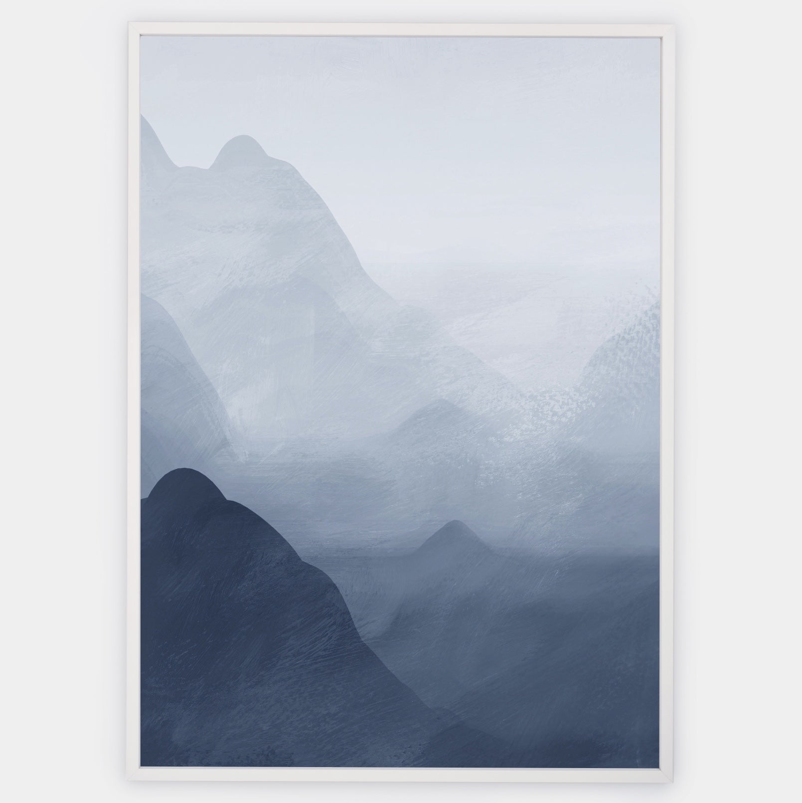 Poster with abstract graphics of blue mountains "Blue Mountains" No. 2. The poster is sold without a frame, with the option to order a thin wooden frame with a thickness of 1.2 cm. There are three color options to choose from - white , black and oak design.