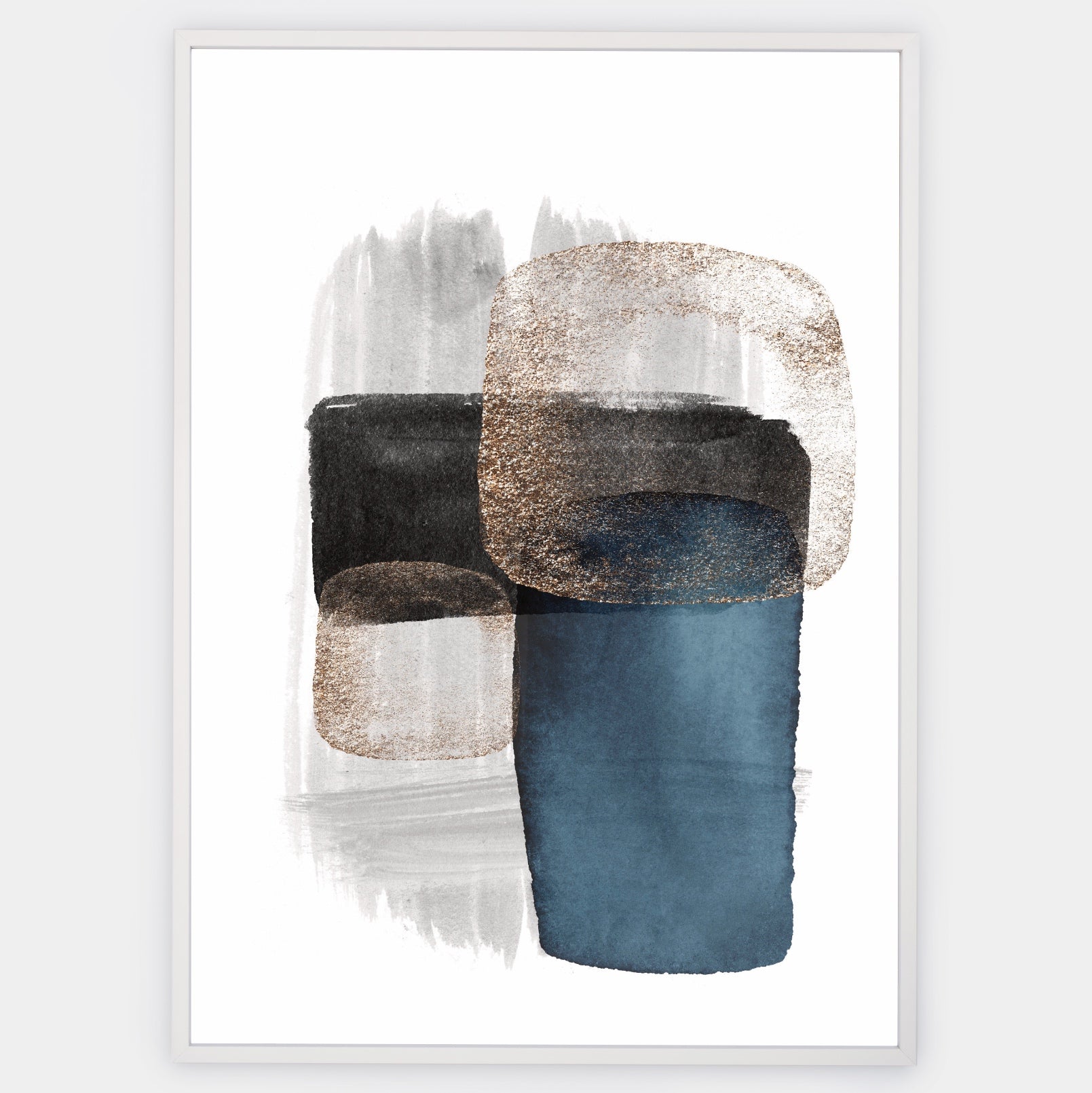 Poster with abstract graphics in gold and blue "Gold Touch" No. 1. The poster is sold without a frame, with the option to order a thin wooden frame with a thickness of 1.2 cm. There are three color options to choose from - white , black and oak design.