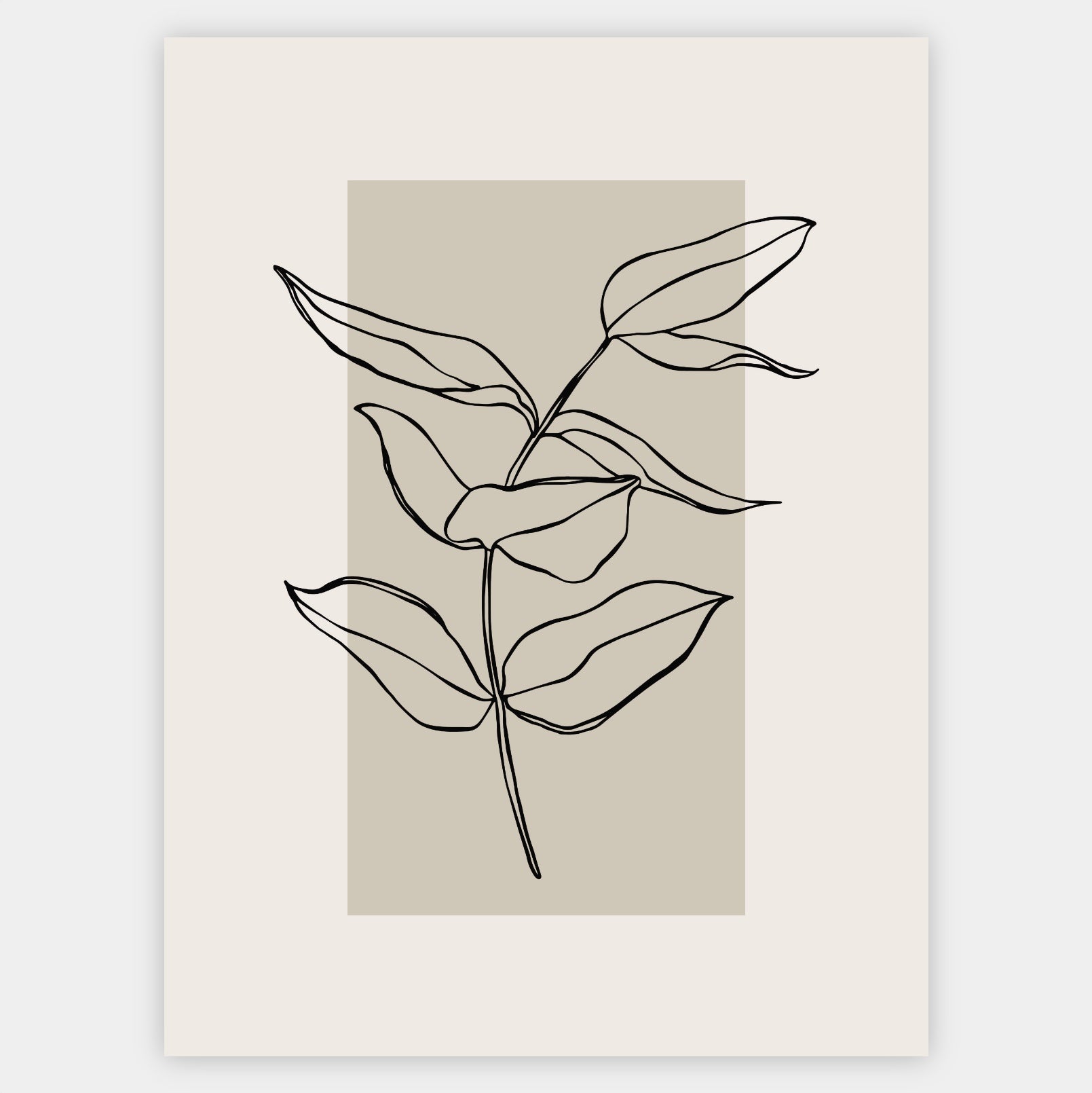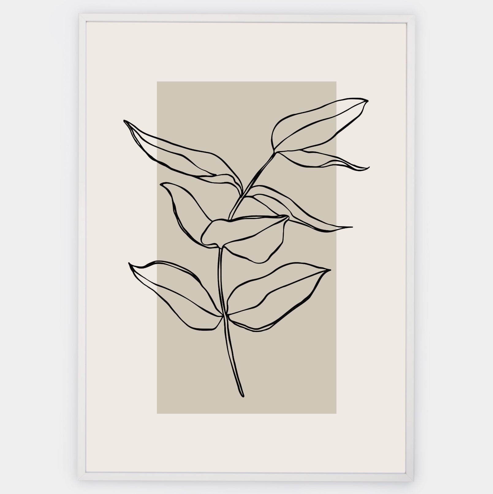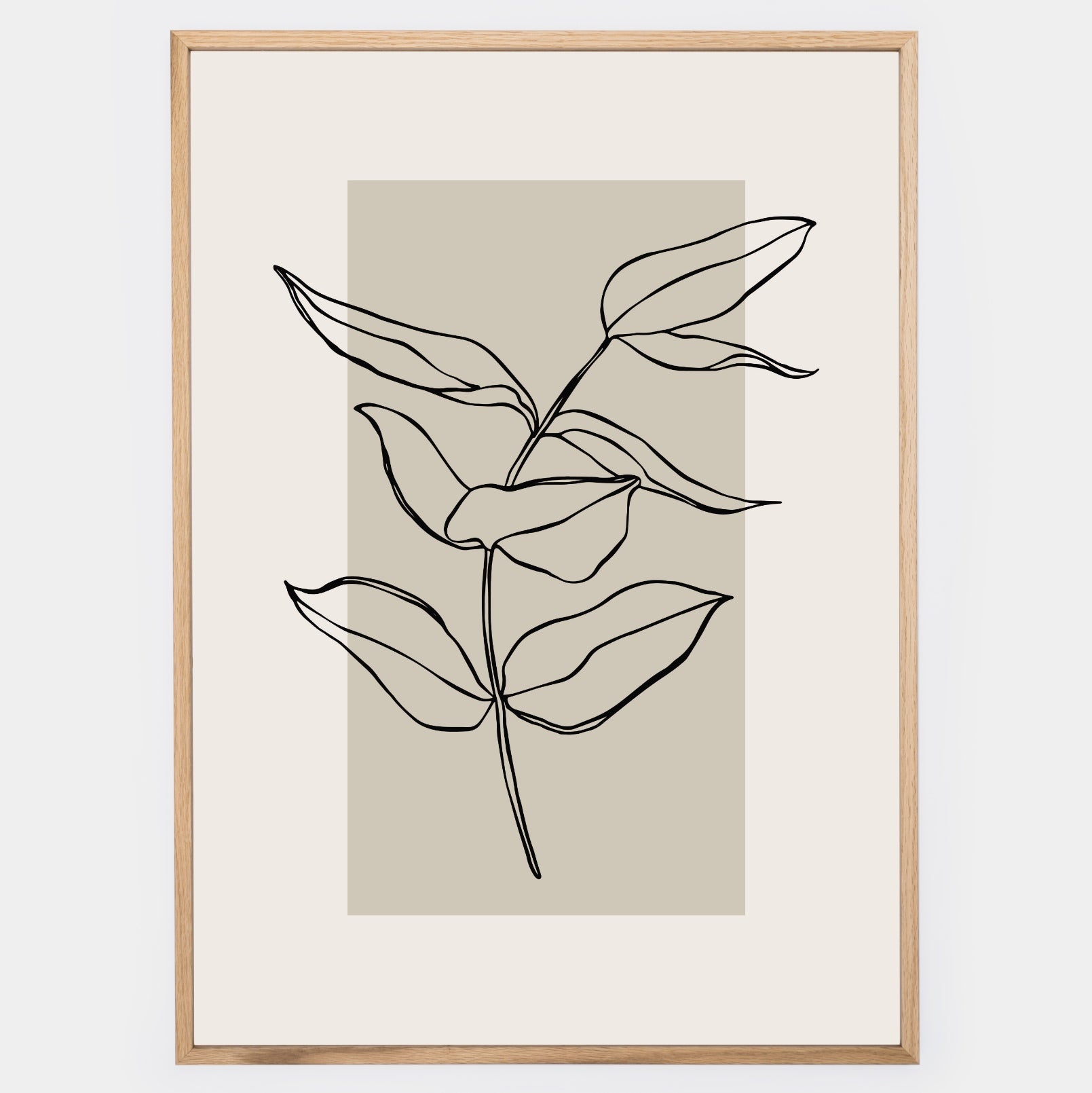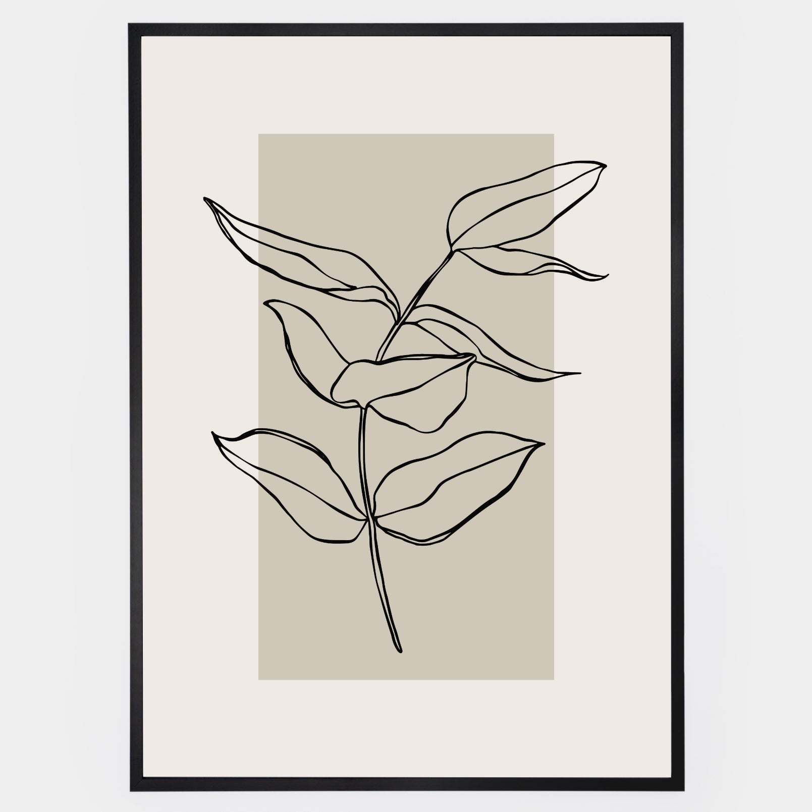 Boho poster with graphics of overlapping leaves on a beige background. The poster is sold without a frame, with the option to order a thin wooden frame with a thickness of 1.2 cm. There are three color options to choose from - white , black and oak design.