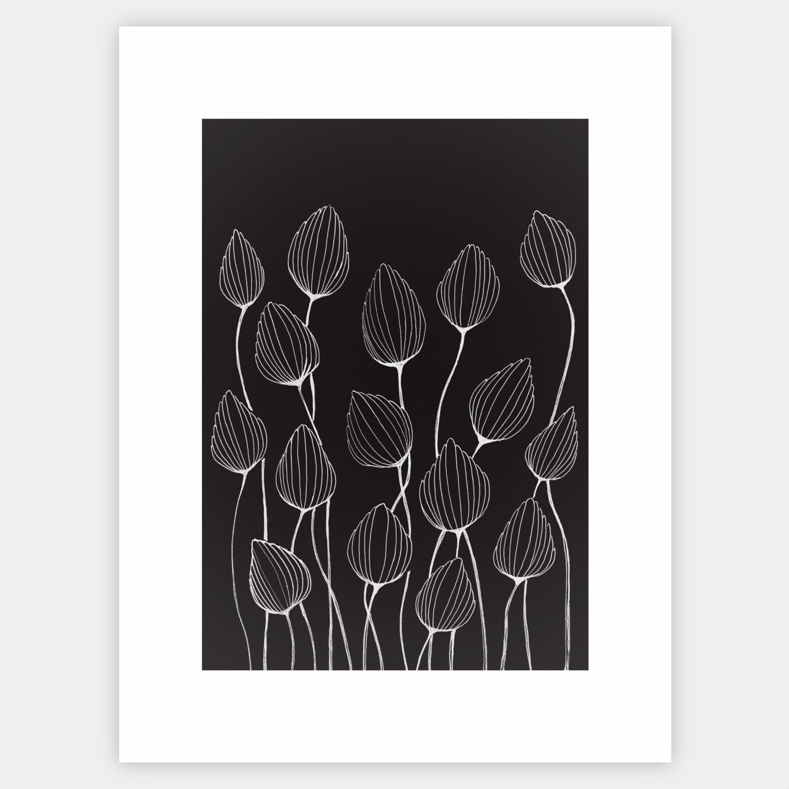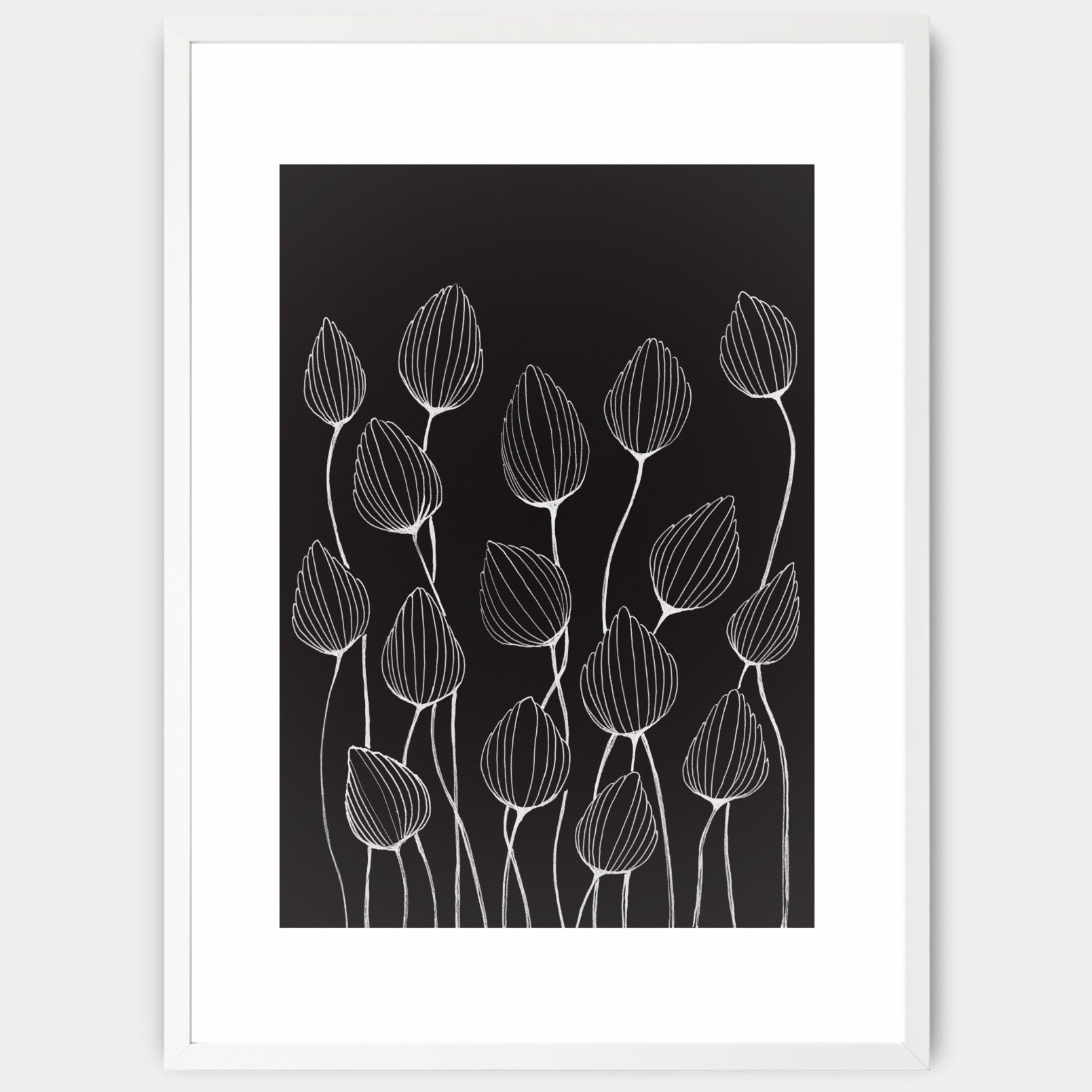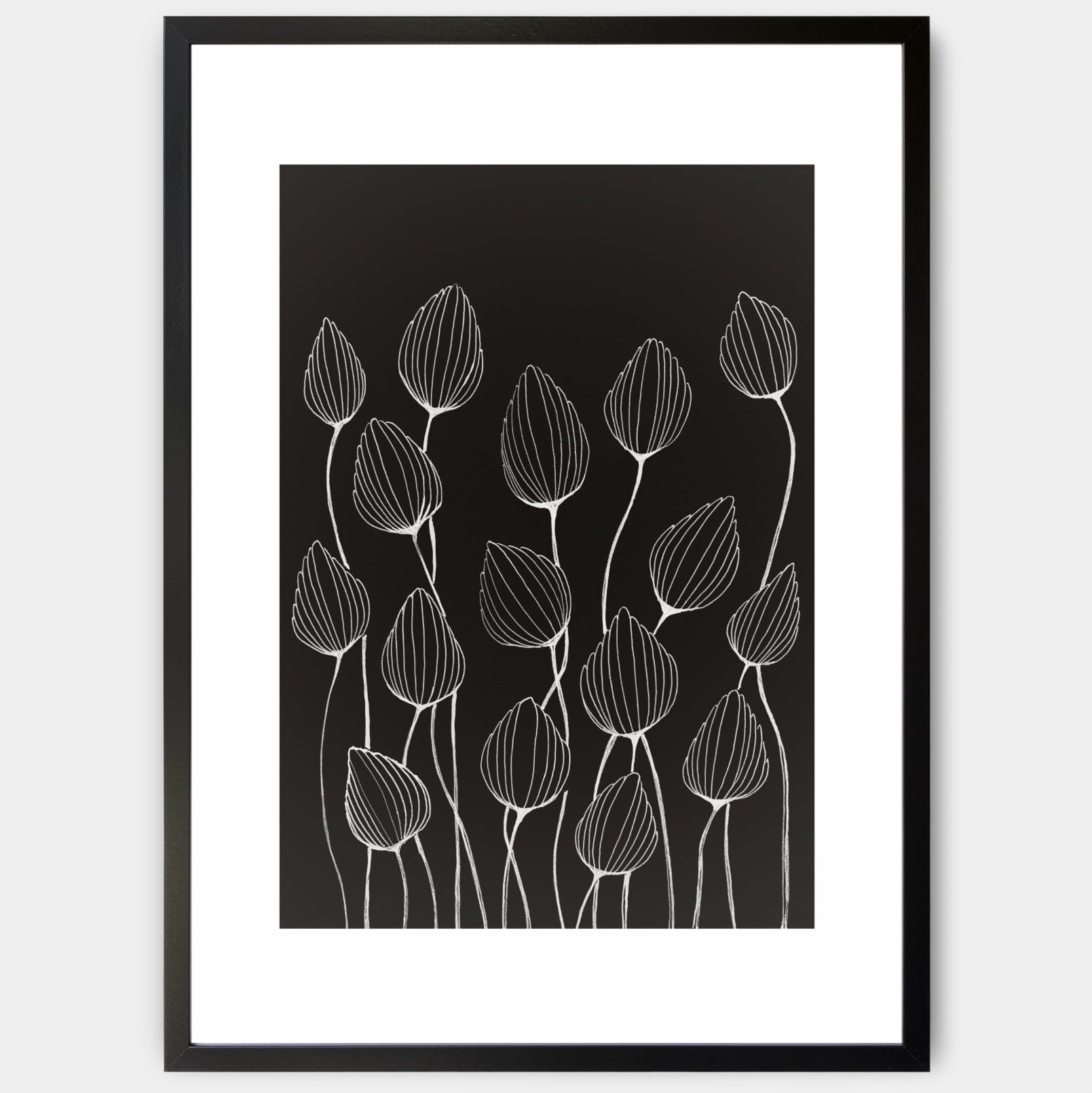 A poster with a flower bud motif on a black background. An elegant white border is part of the print, designed so that the print can be supplemented with a standard passe-partout. The poster is sold without a frame, with the option to order a thin wooden frame with a thickness of 1.2 cm. There are three color options to choose from - white , black and oak design.