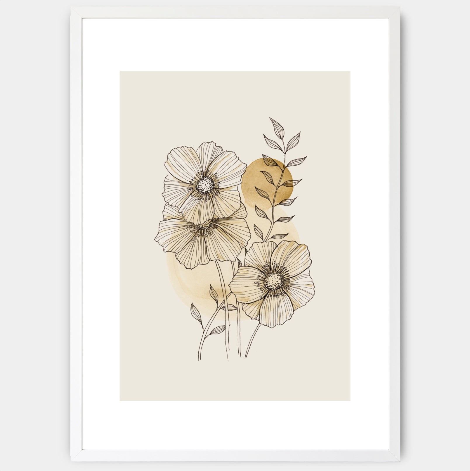 A floral poster in beige and gold. An elegant white border is part of the print, designed so that the print can be supplemented with a standard mount. The poster is sold without a frame, with the option to order a thin wooden frame with a thickness of 1.2 cm. There are three color options to choose from - white , black and oak design.