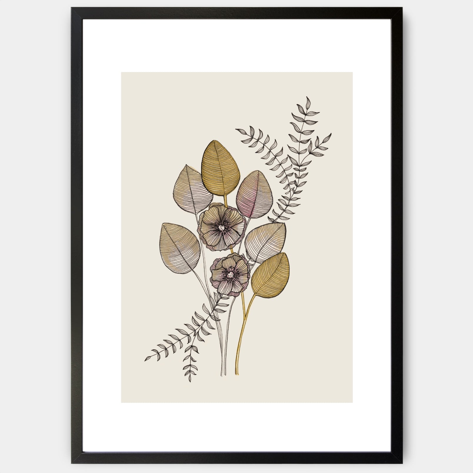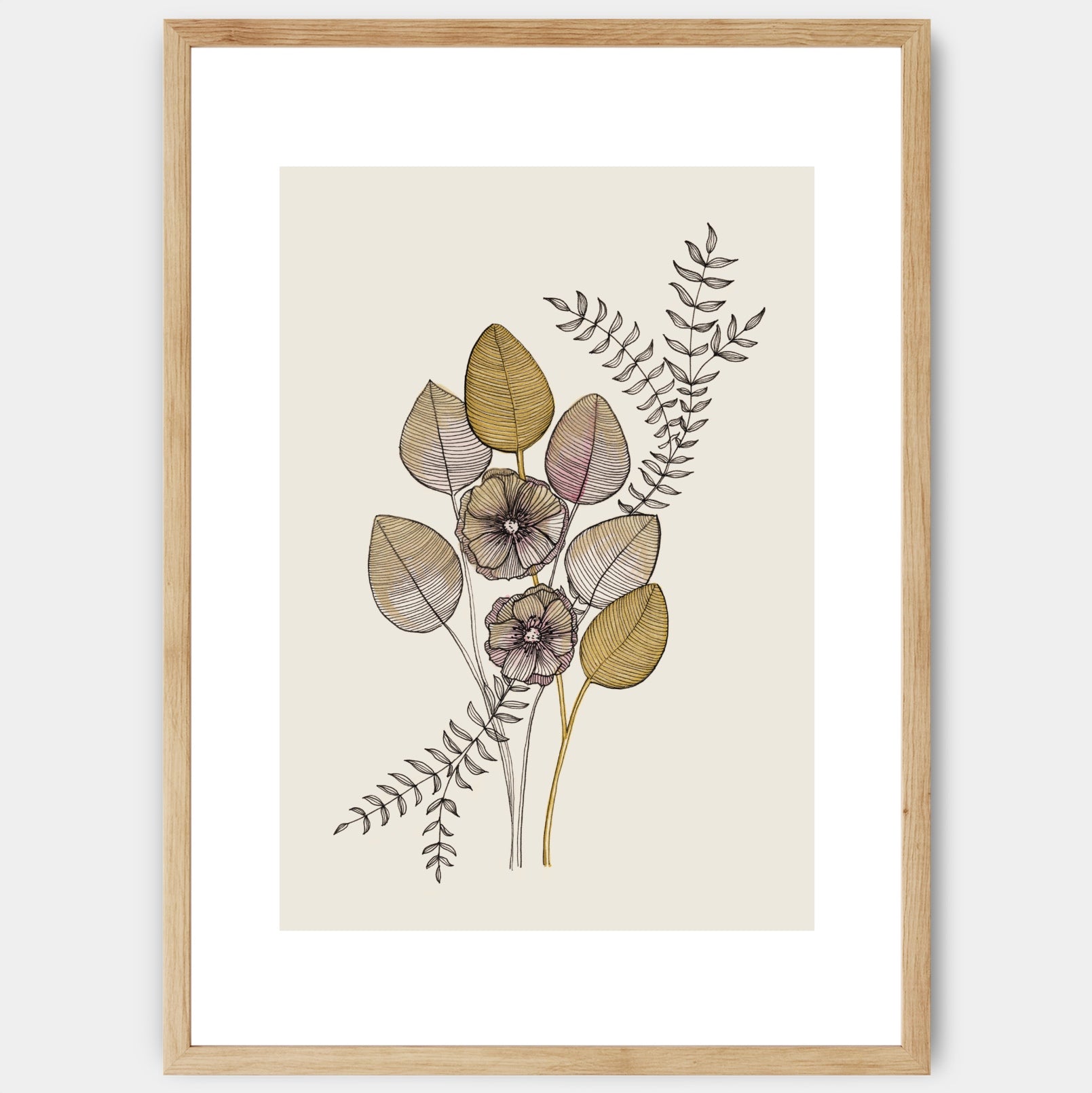 A floral poster in rose gold. An elegant white border is part of the print, designed to allow the print to be mounted with a standard mount. The poster is sold without a frame, with the option to order a thin wooden frame with a thickness of 1.2 cm. There are three color options to choose from - white , black and oak design.