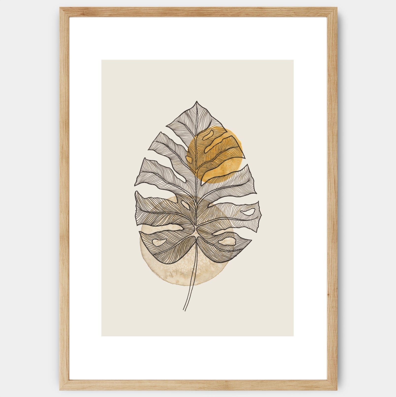 A poster with a monstera motif in a beige and gold design. An elegant white border is part of the print, designed so that the print can be supplemented with a standard passe-partout. The poster is sold without a frame, with the option to order a thin wooden frame with a thickness of 1.2 cm. There are three color options to choose from - white , black and oak design.
