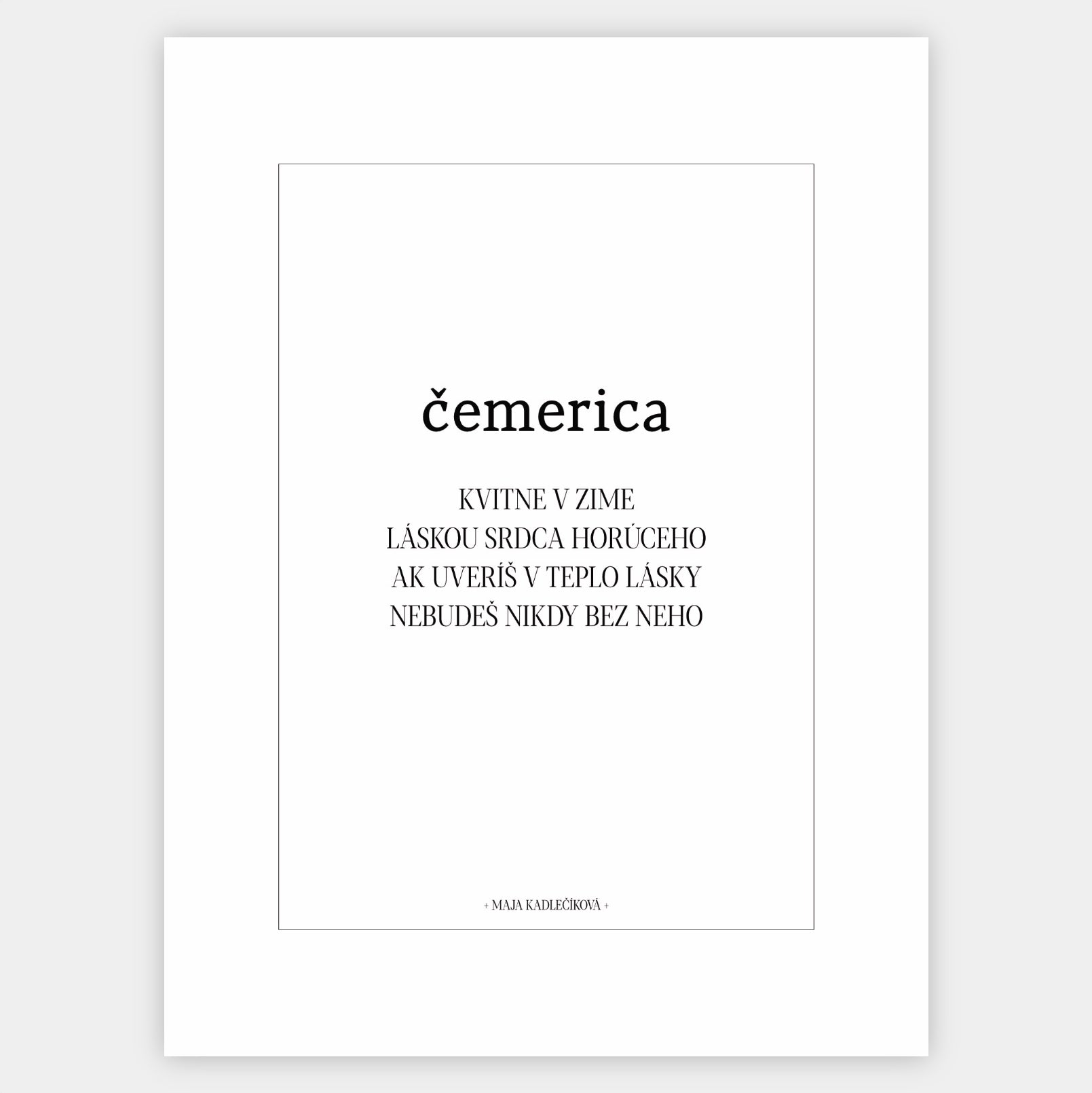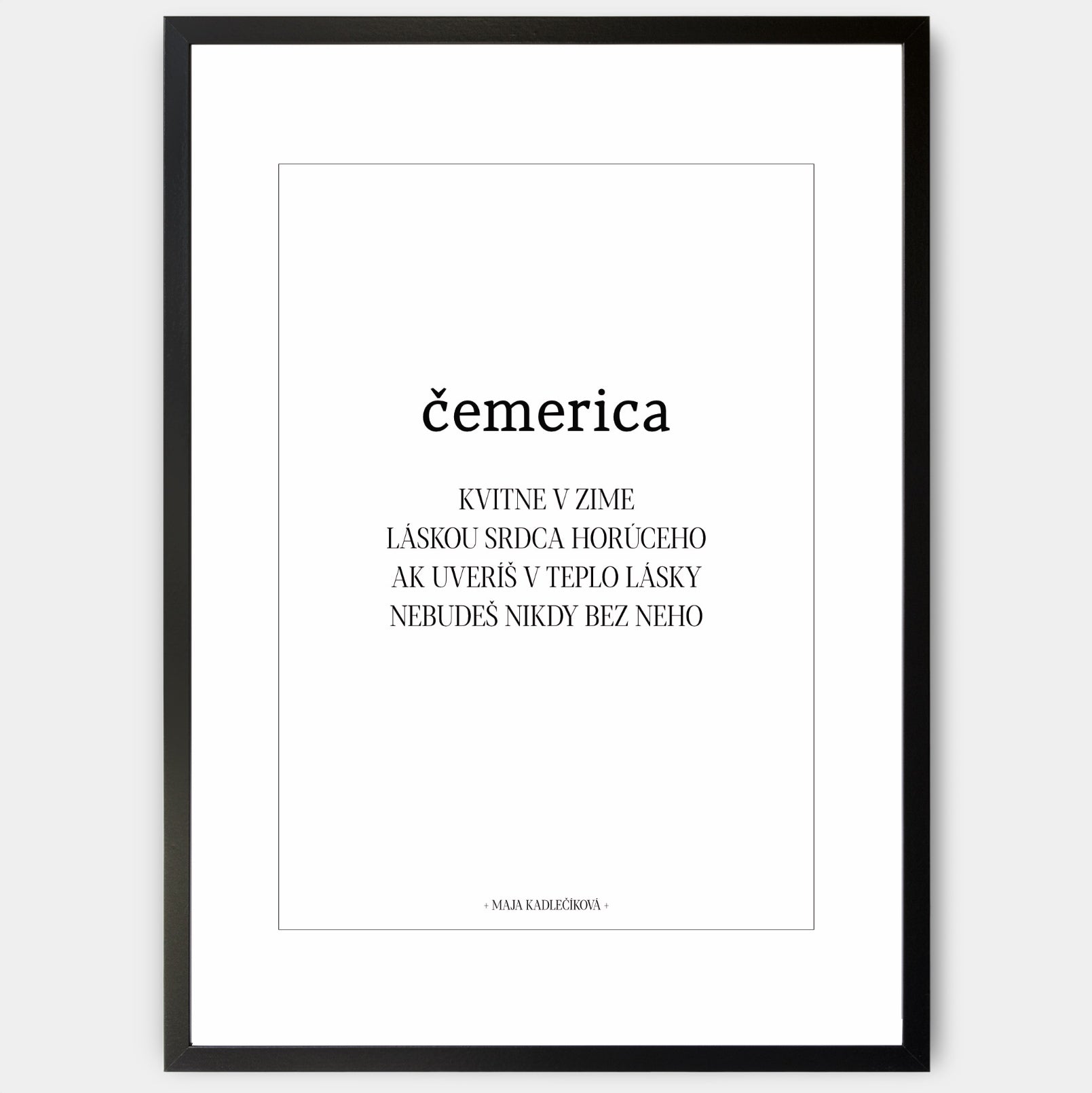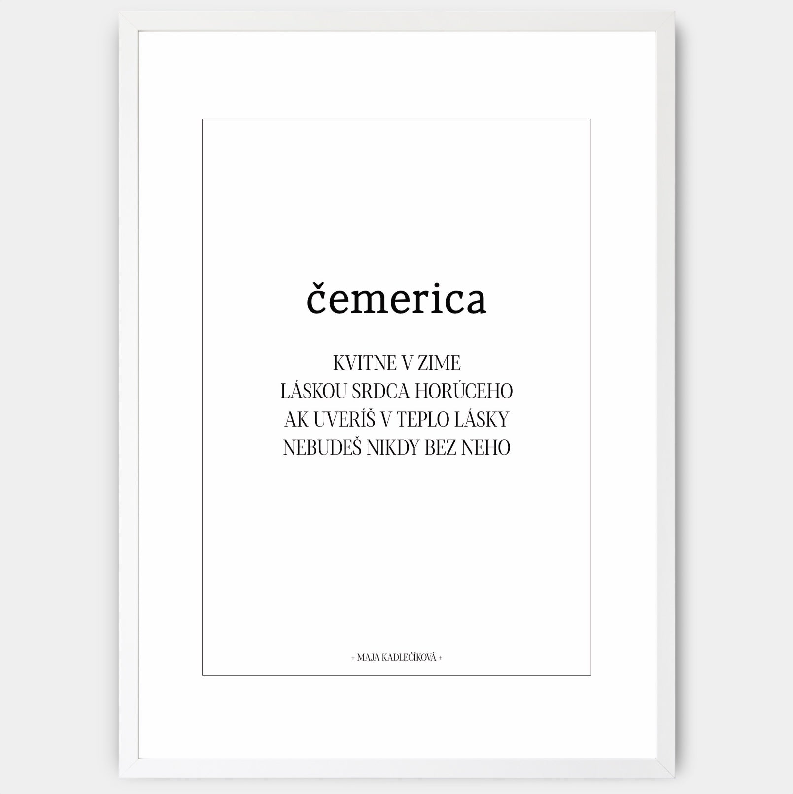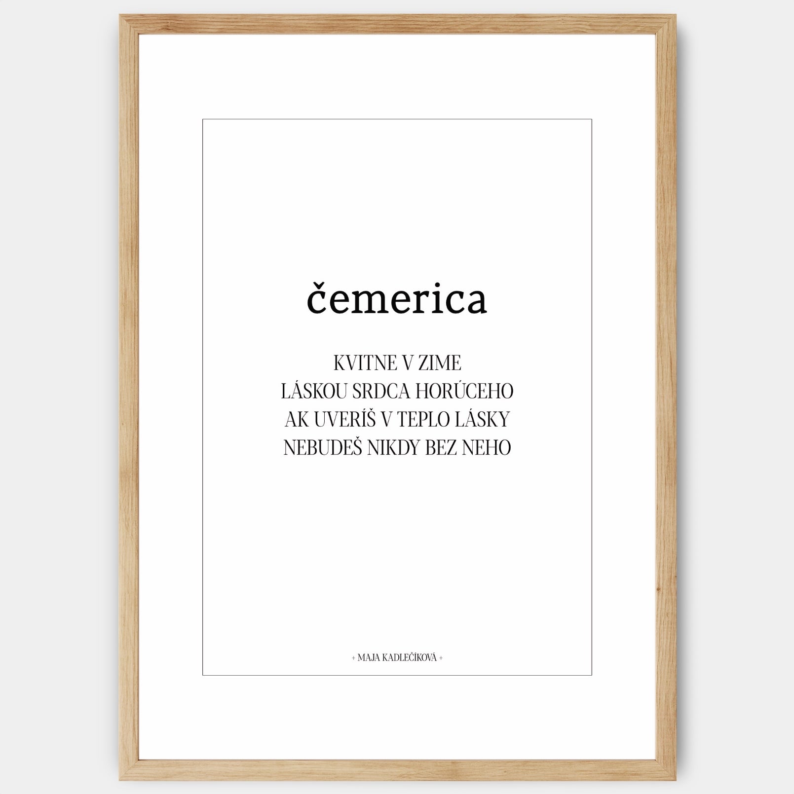 The poster with the poem "Çemerica" from the Night and Day collection is complemented by a poster of the same name with a visual of hellebore . It is designed so that it can be supplemented with a standard passe-partout. The poster is sold without a frame with the option to order a thin wooden frame 1.2 cm thick. There are three color options to choose from - white , black and oak design.