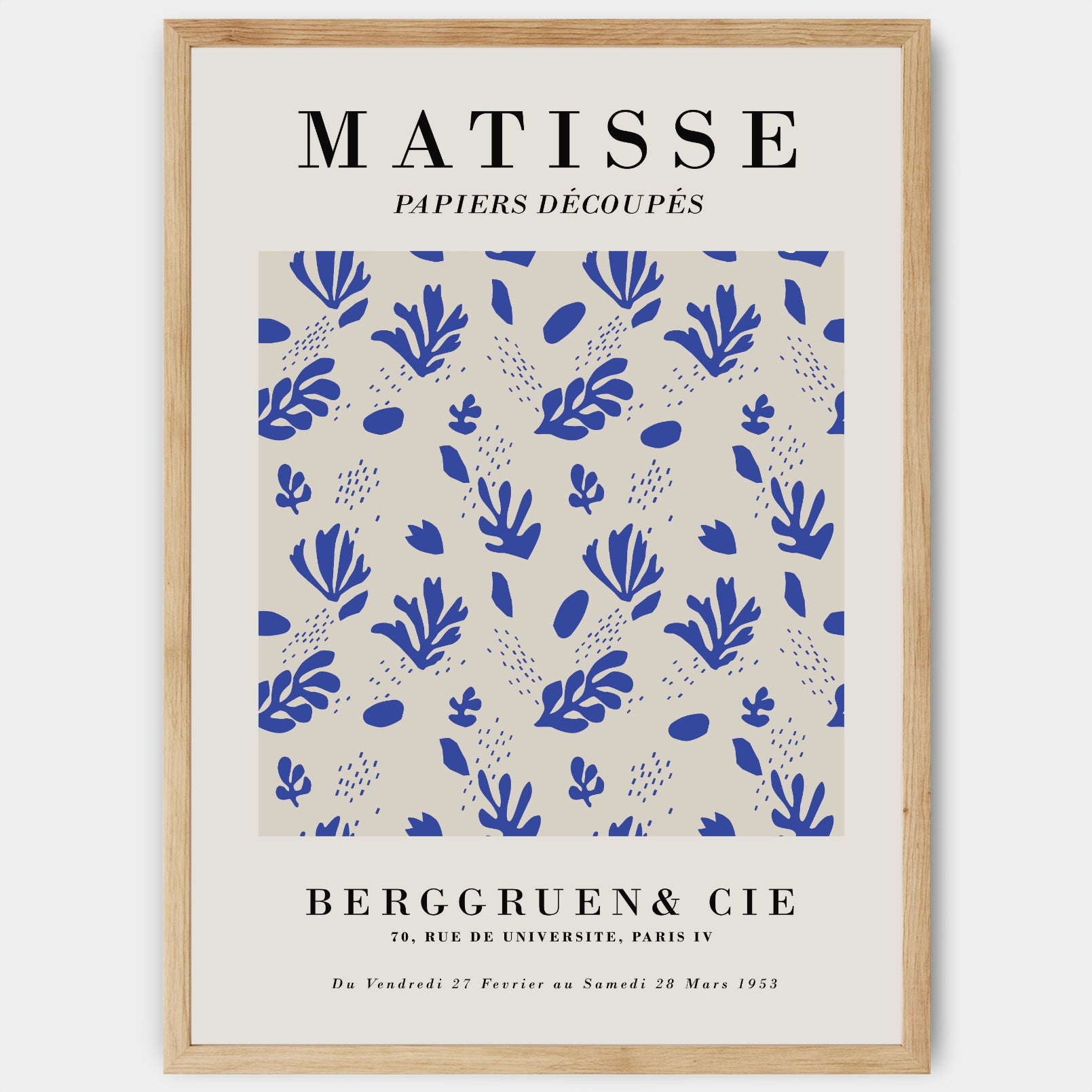 A remake of a 1953 exhibition poster with a floral motif by Henri Matisse. The poster is sold without a frame, with the option to order a thin wooden frame with a thickness of 1.2 cm. There are three color options to choose from - white , black and oak design.