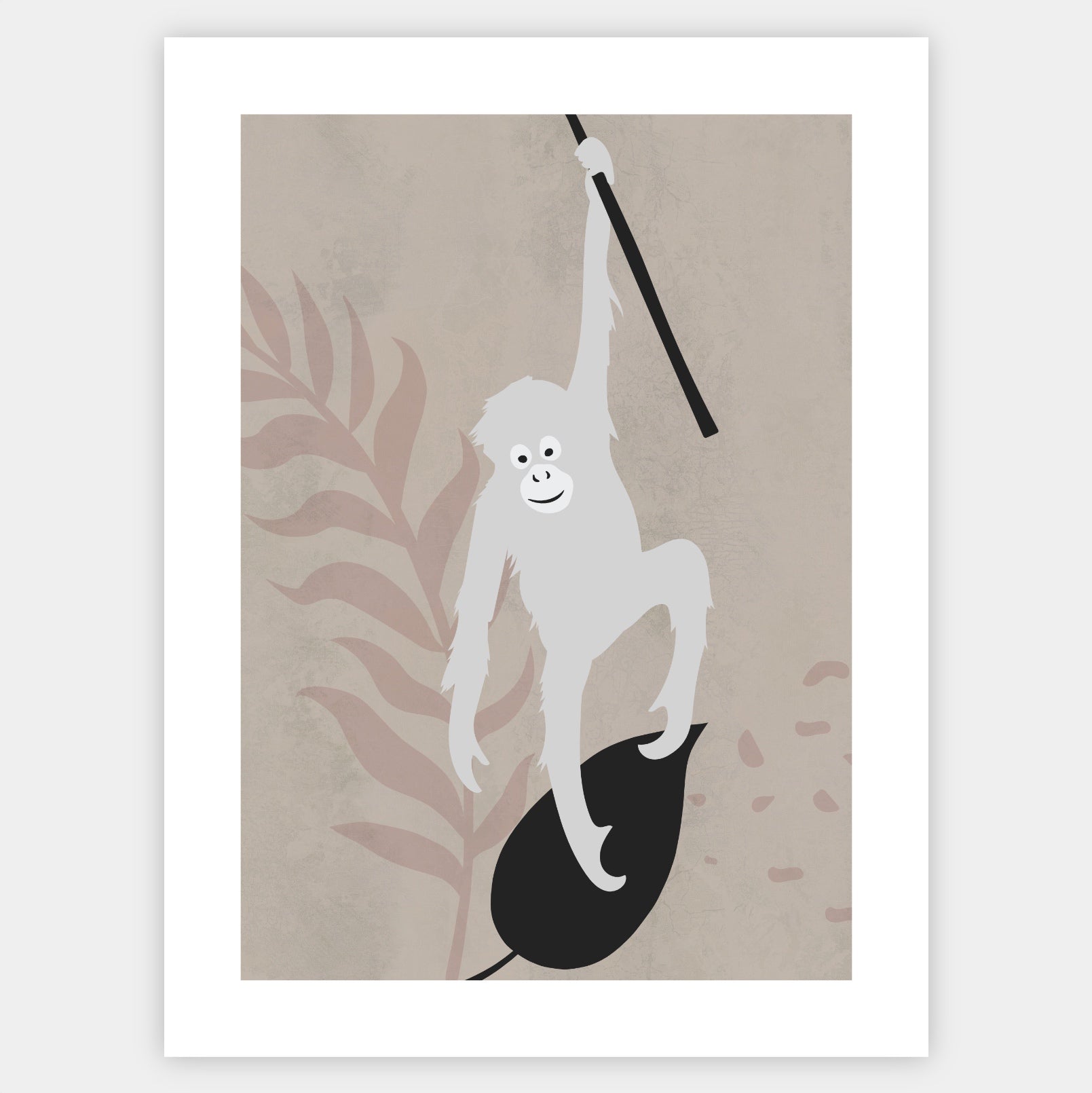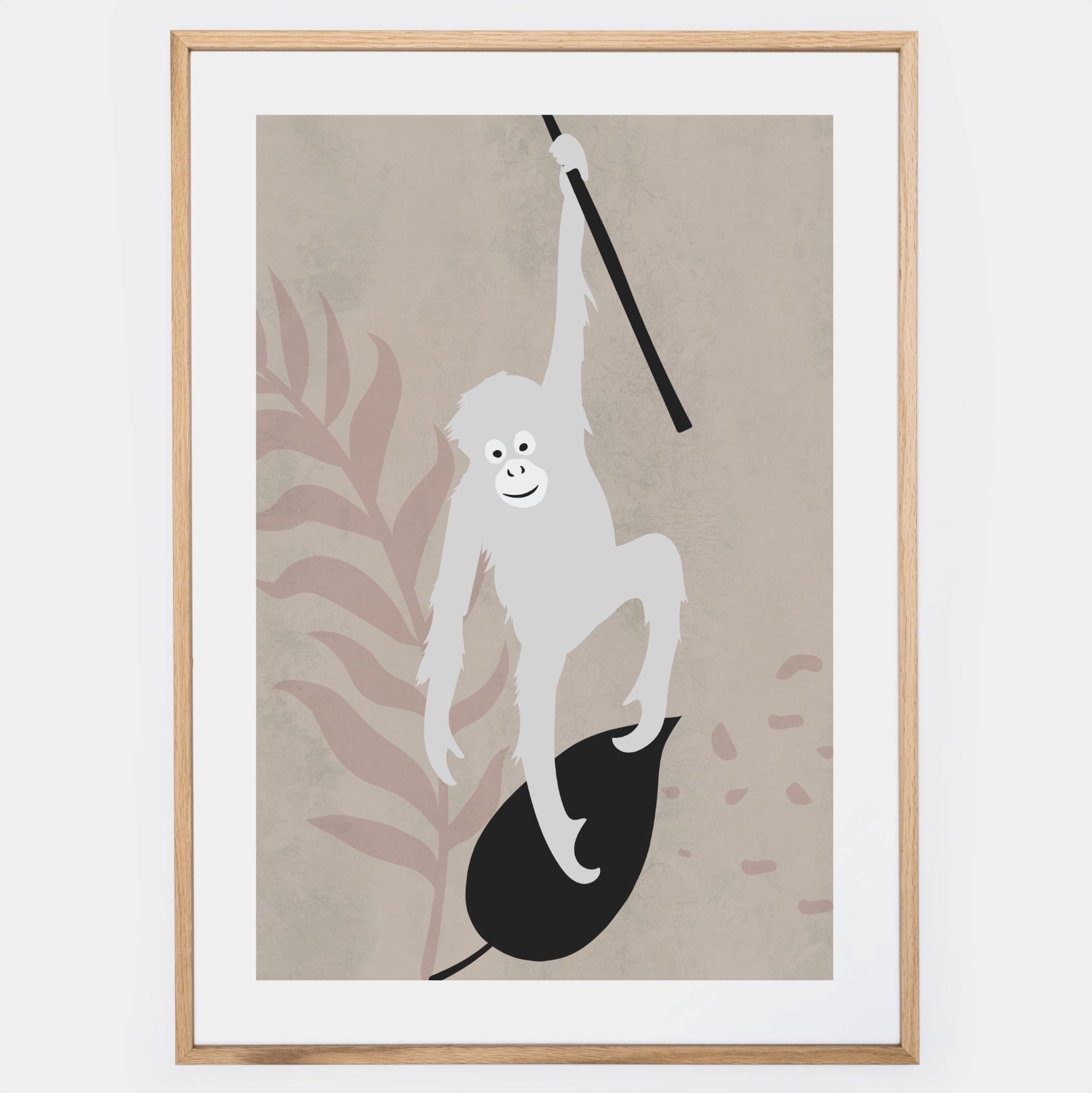 Poster with a graphic of a playing monkey. An elegant white border is part of the print. The poster is sold without a frame, with the option to order a thin wooden frame with a thickness of 1.2 cm. There are three color options to choose from - white , black and oak design.