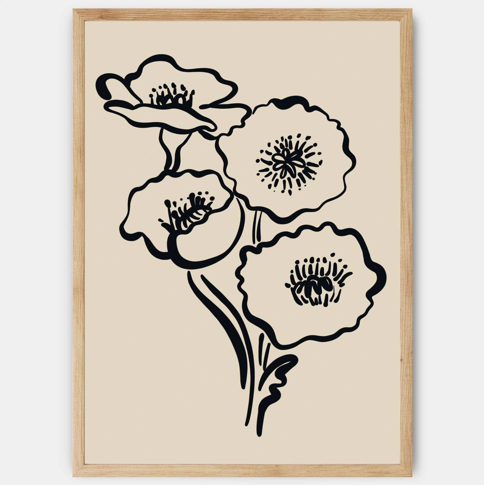Poster with a drawing of poppy flowers. The poster is sold without a frame, with the option to order a thin wooden frame with a thickness of 1.2 cm. There are three color options to choose from - white , black and oak design.