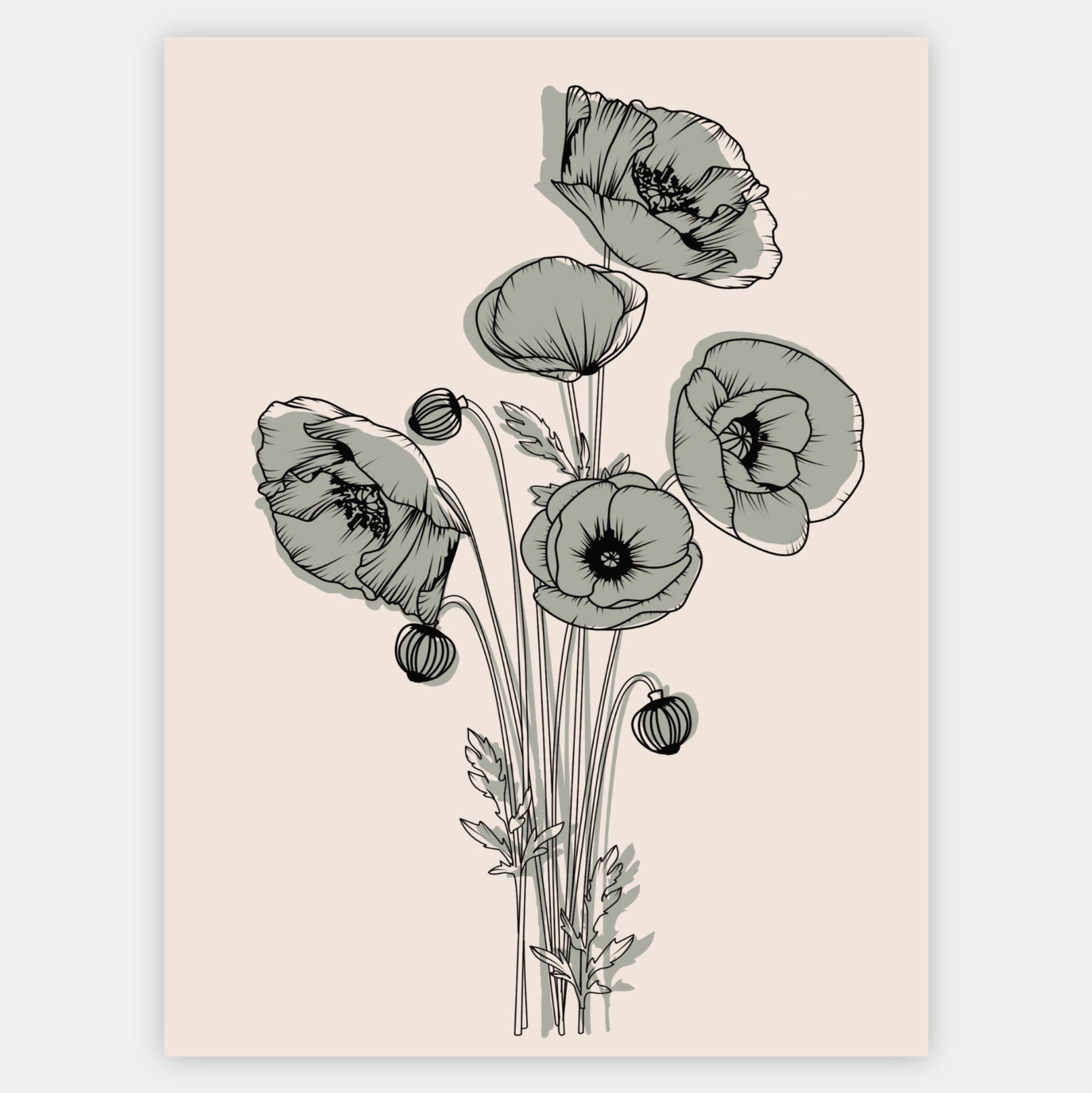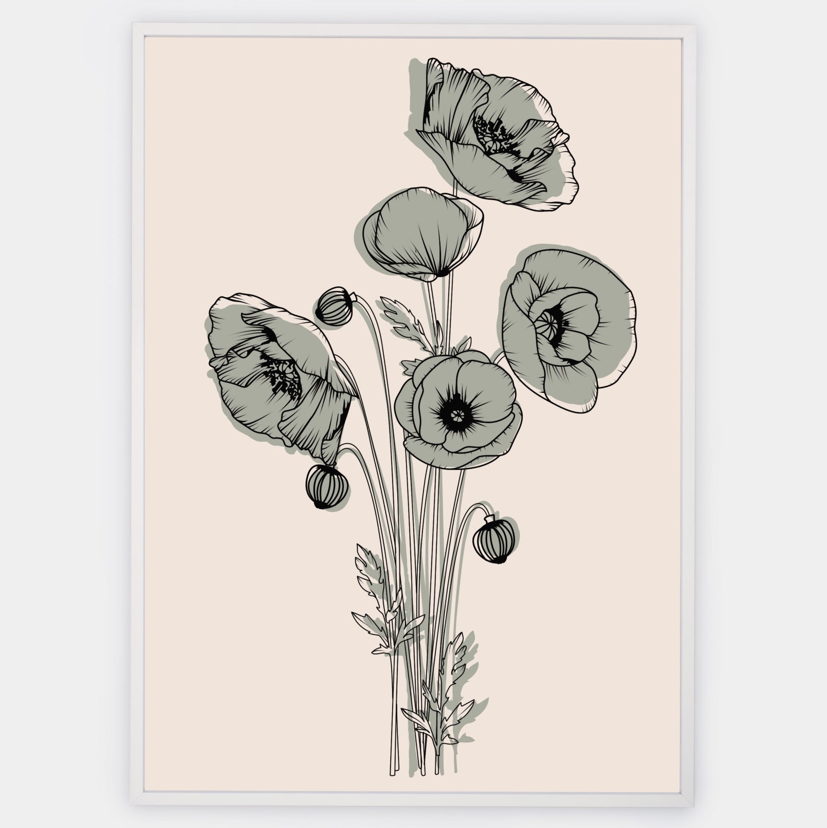Poster with a poppy flower graphic on a beige background. The poster is sold without a frame, with the option to order a thin wooden frame with a thickness of 1.2 cm. There are three color options to choose from - white , black and oak design.