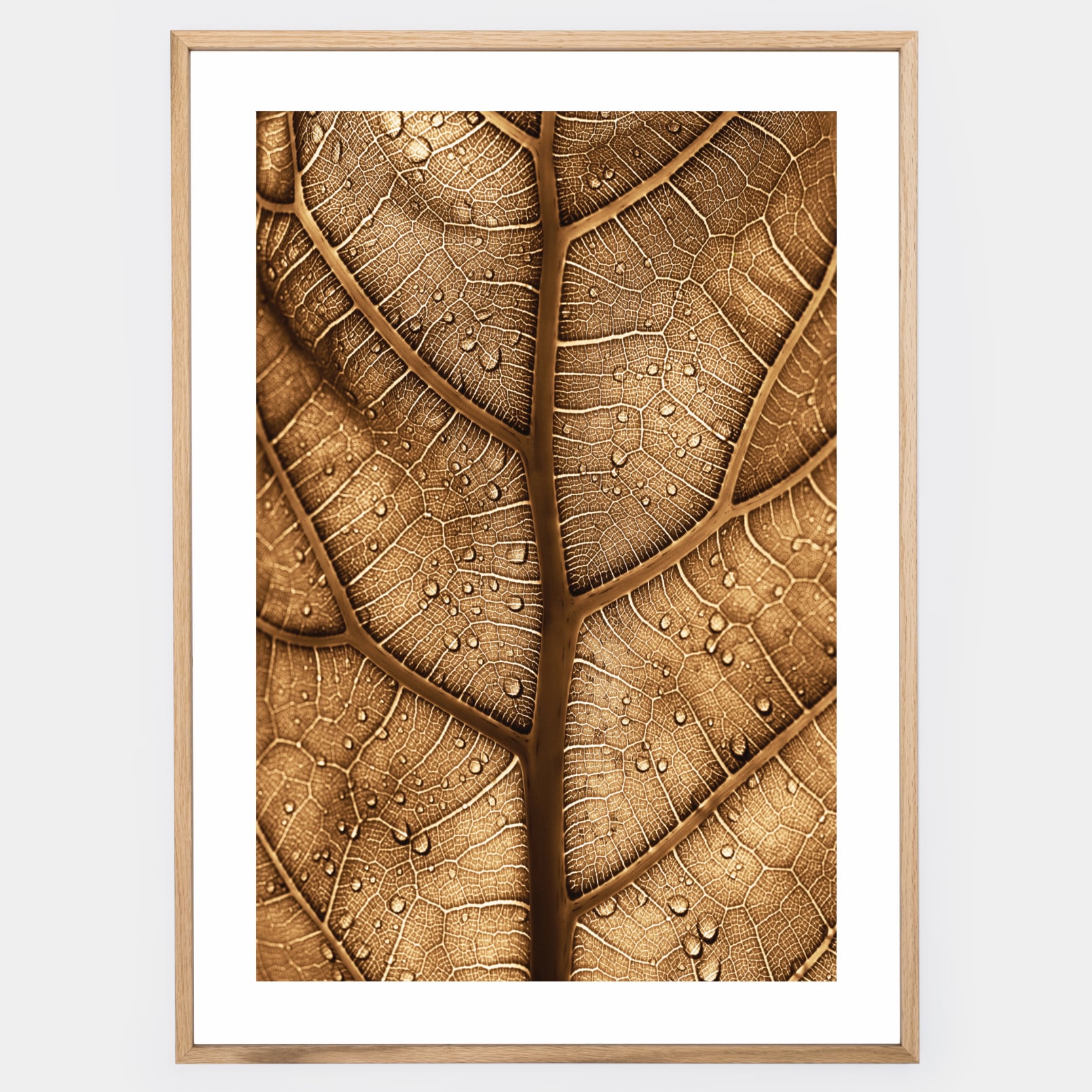 Boho poster with a photo of the underside of a brown leaf. An elegant white border is part of the print. The poster is sold without a frame, with the option to order a thin wooden frame with a thickness of 1.2 cm. There are three color options to choose from - white , black and oak design.