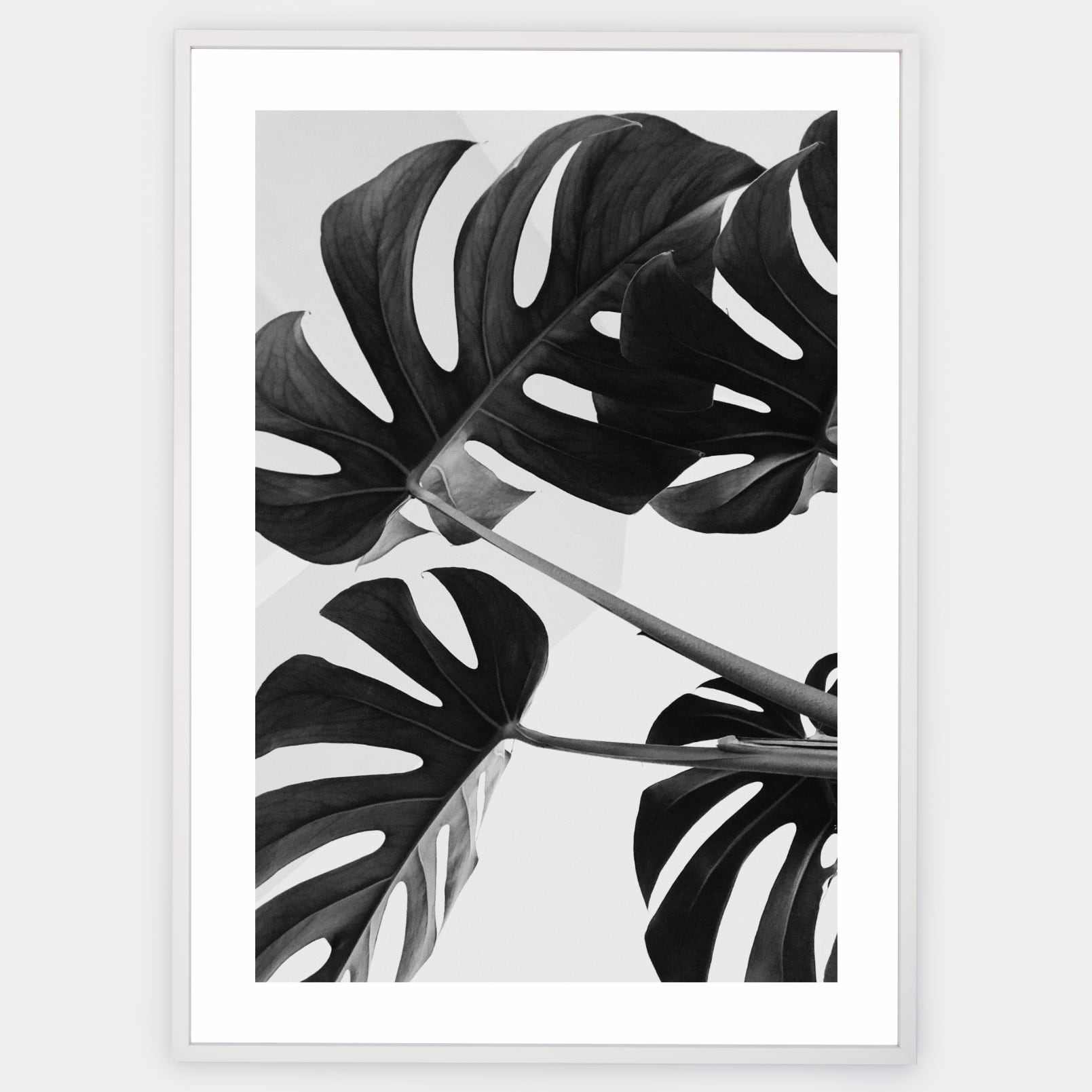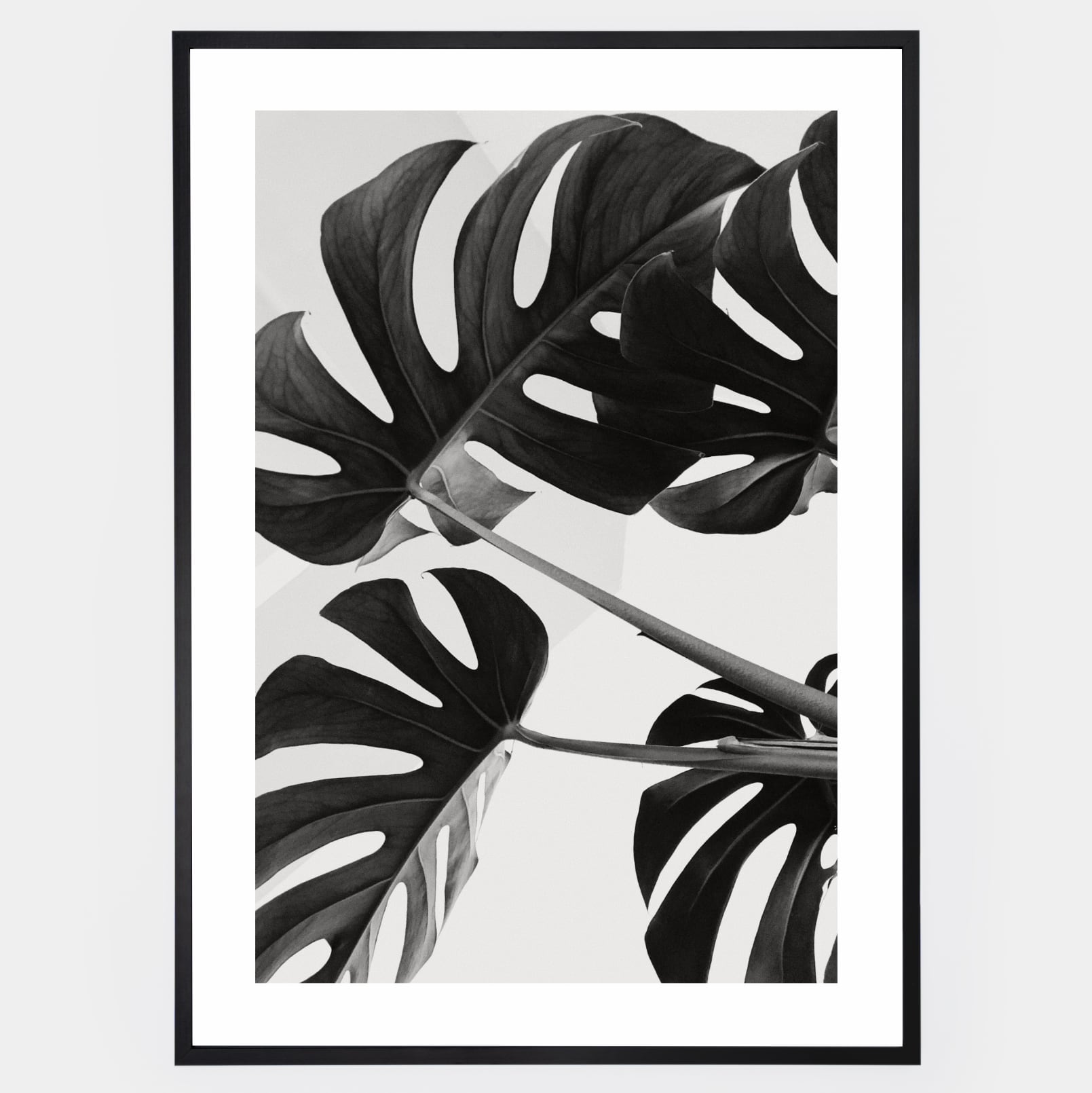 Boho poster with a black and white photo of monstera leaves. An elegant white border is part of the print. The poster is sold without a frame, with the option to order a thin wooden frame with a thickness of 1.2 cm. There are three color options to choose from - white , black and oak design.