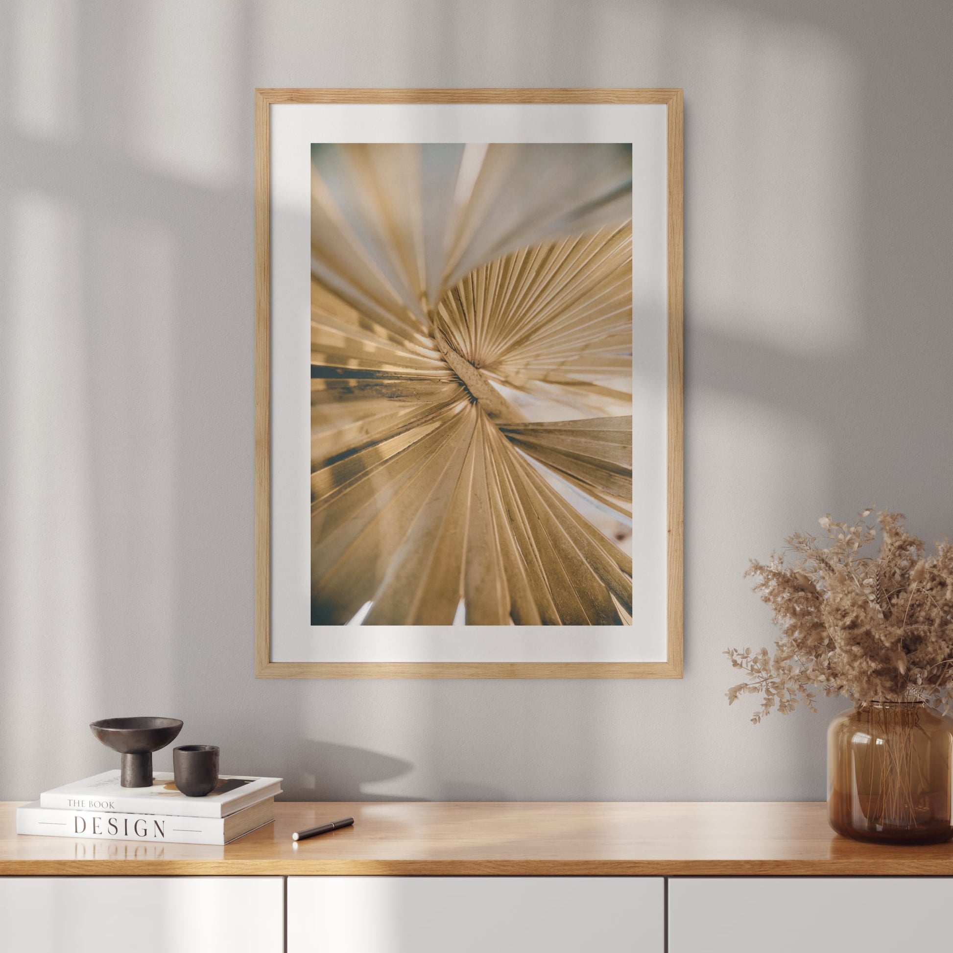 Boho poster with a photo of a dried palm leaf. An elegant white border is part of the print. The poster is sold without a frame, with the option to order a thin wooden frame with a thickness of 1.2 cm. There are three color options to choose from - white , black and oak design.