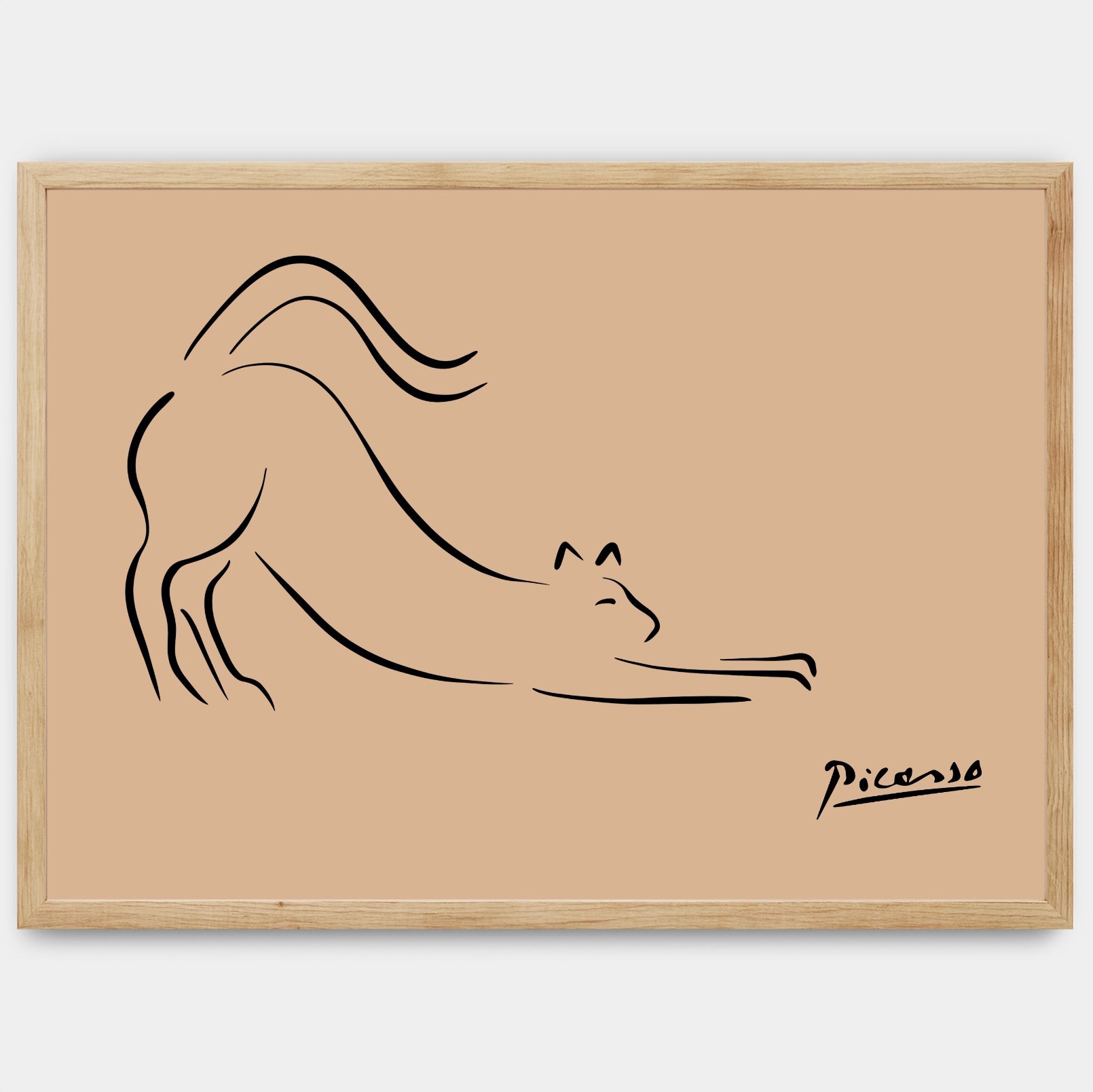 Poster with a minimalist cat drawing by Pablo Picasso. The poster is sold without a frame, with the option to order a thin wooden frame with a thickness of 1.2 cm. There are three color options to choose from - white , black and oak design.