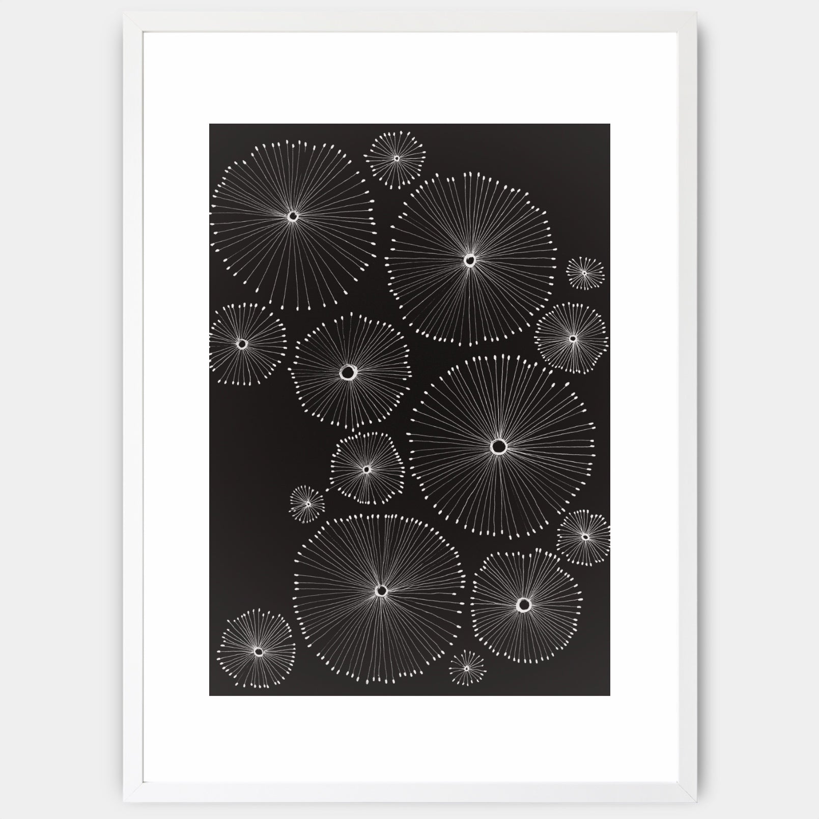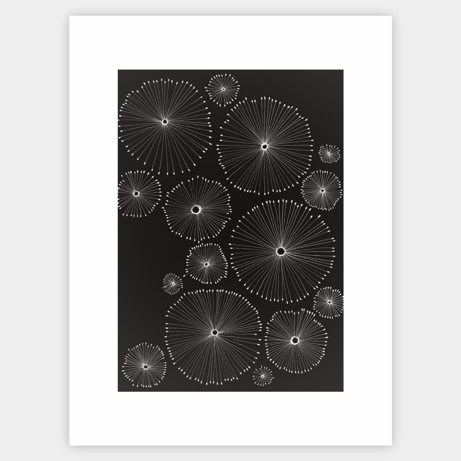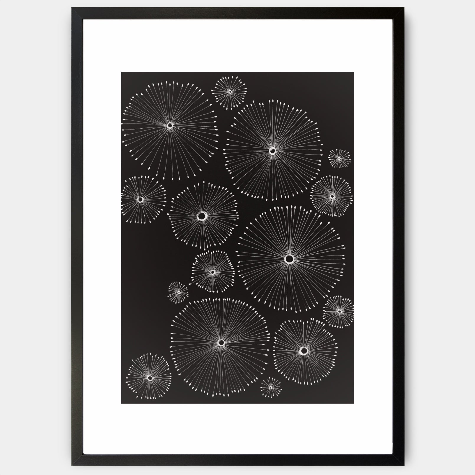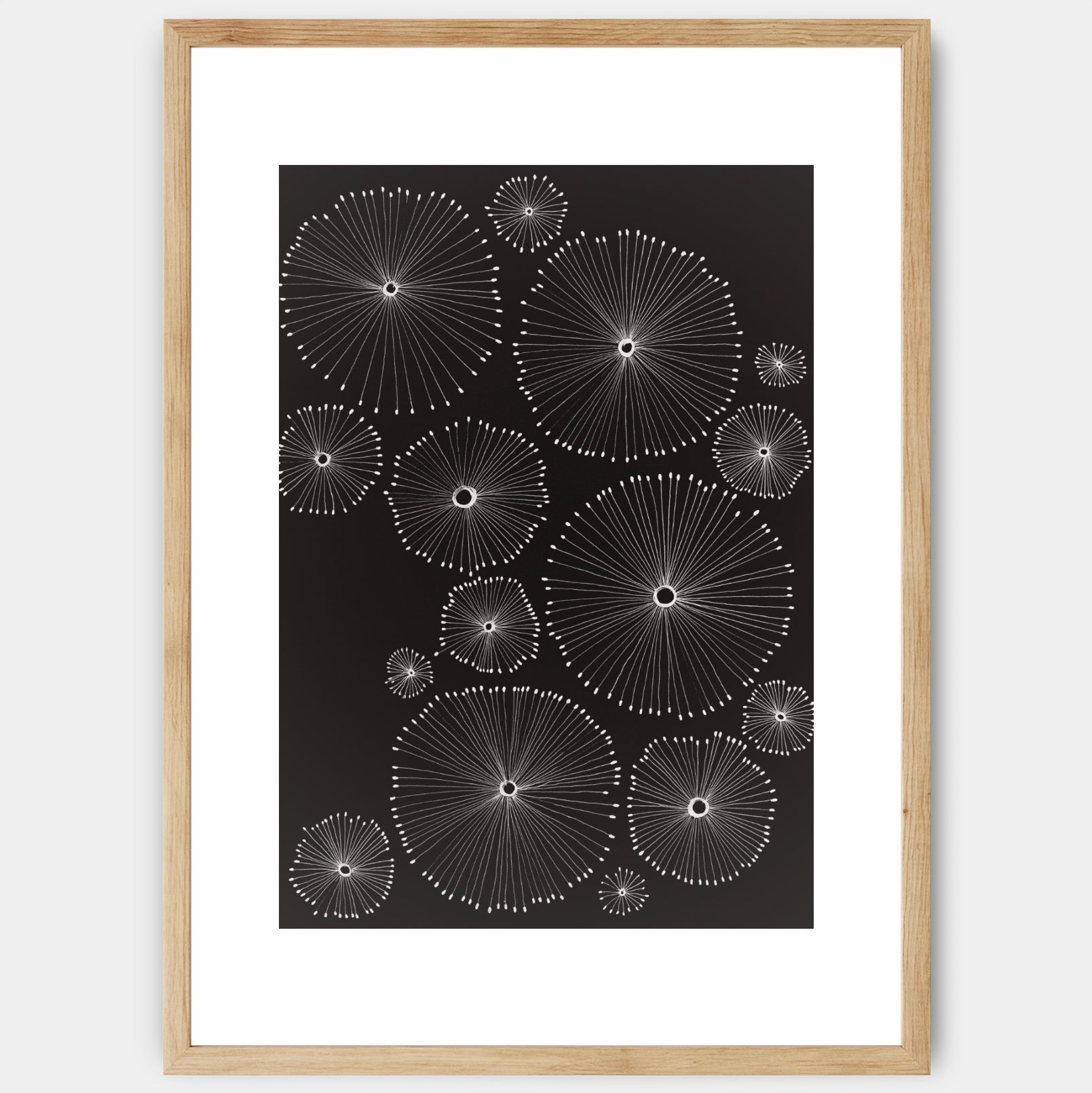 A poster with a motif of fireworks circles on a black background from the Night and Day collection. An elegant white border is part of the print, designed so that the print can be supplemented with a standard passe-partout. The poster is sold without a frame, with the option to order a thin wooden frame with a thickness of 1.2 cm. There are three color options to choose from - white , black and oak design.