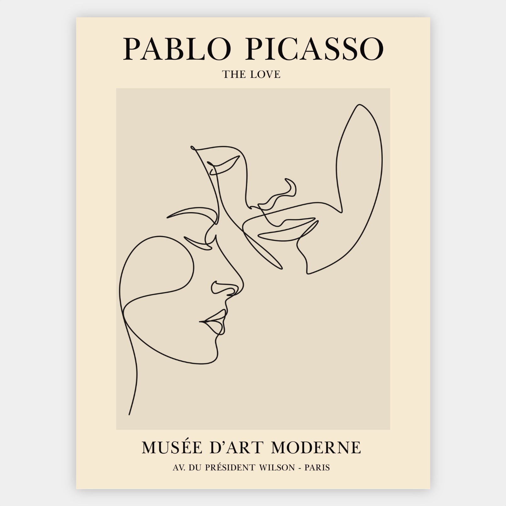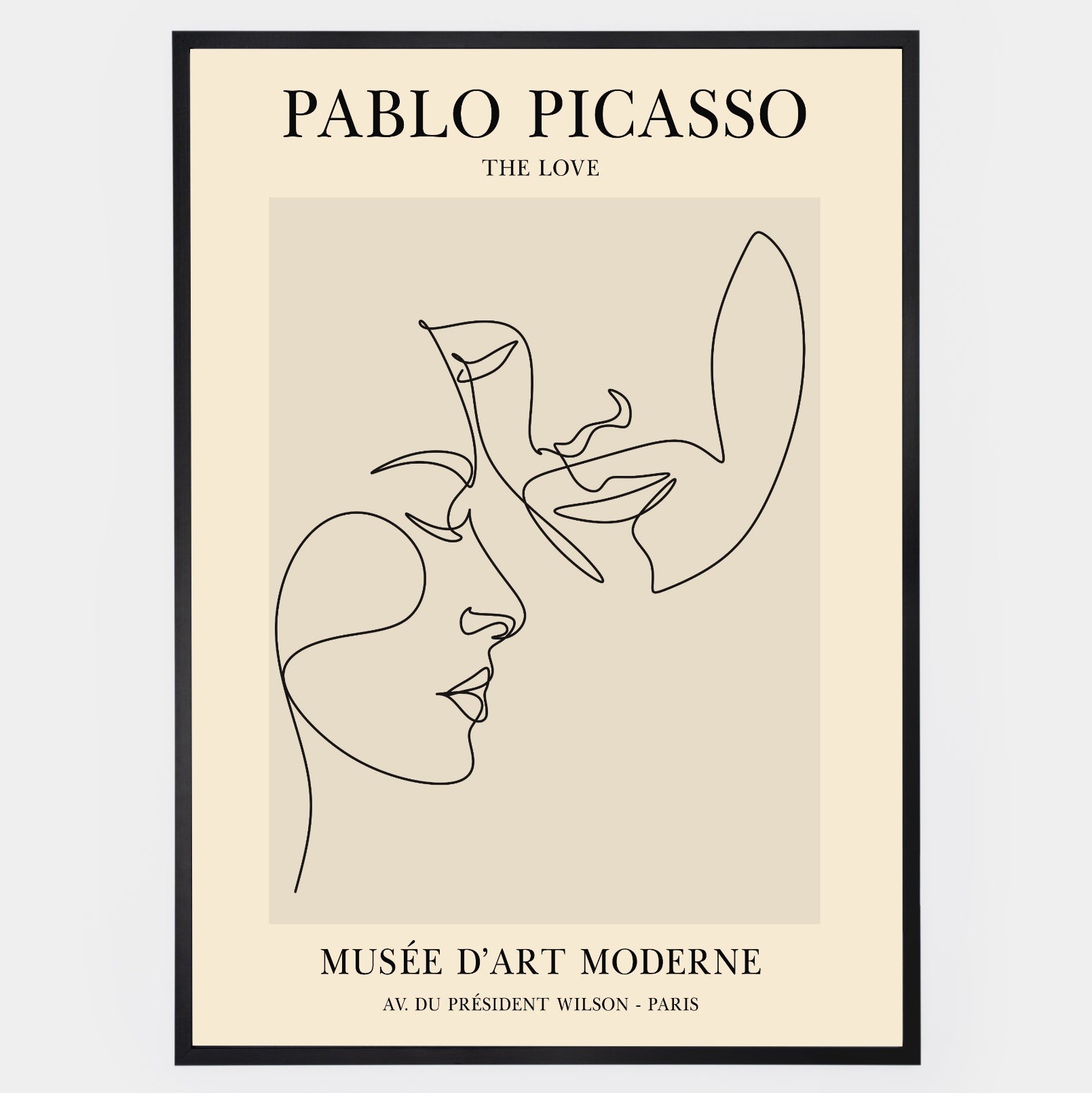 A poster of a minimalist drawing of touching faces based on a motif by Pablo Picasso. The poster is sold without a frame, with the option to order a thin wooden frame with a thickness of 1.2 cm. There are three color options to choose from - white , black and oak design.