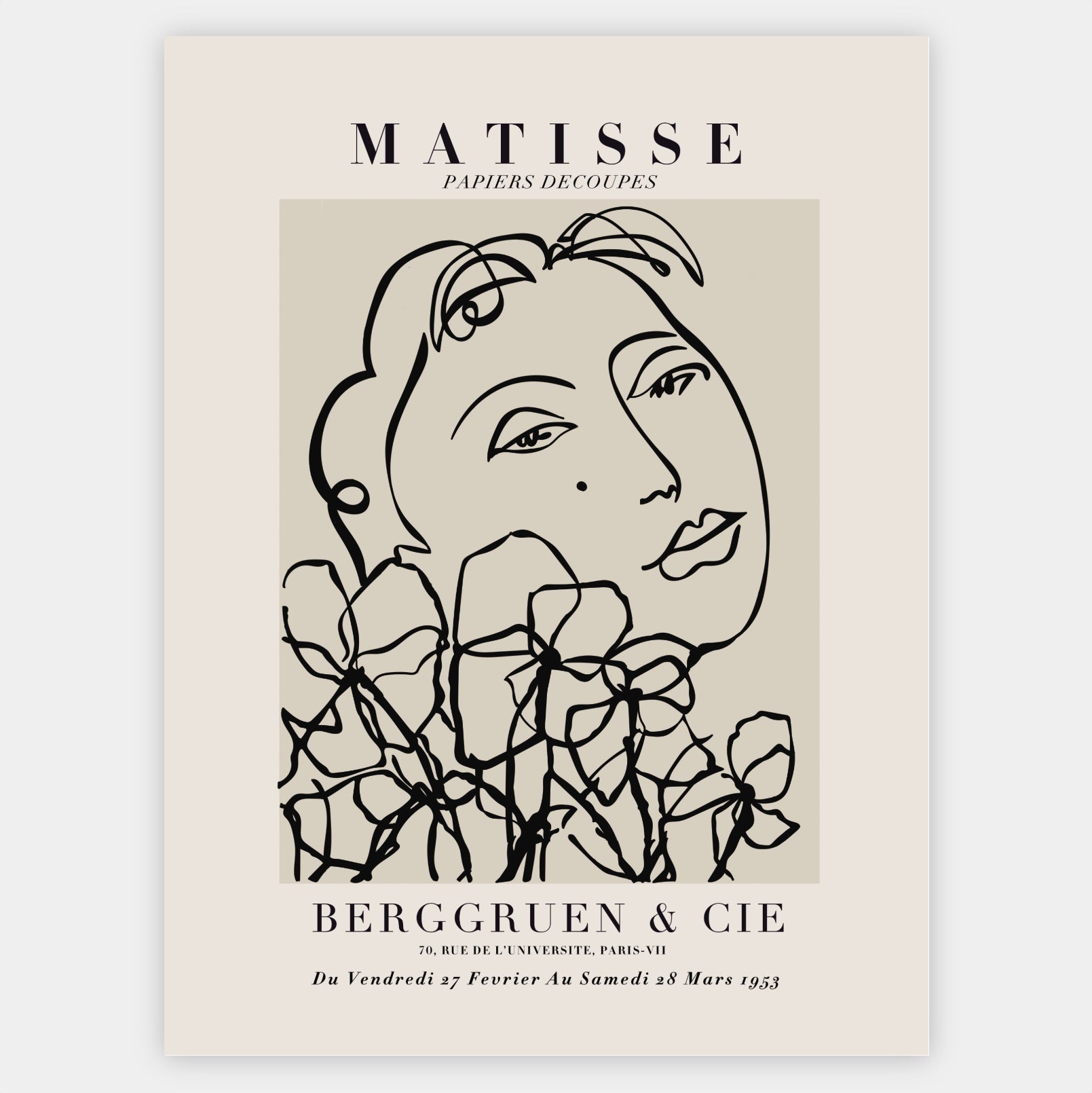 A remake of an exhibition poster featuring the drawing Woman with Flowers by Henri Matisse from 1953. The poster is sold without a frame, with the option to order a thin wooden frame with a thickness of 1.2 cm. There are three color options to choose from - white , black and oak design.