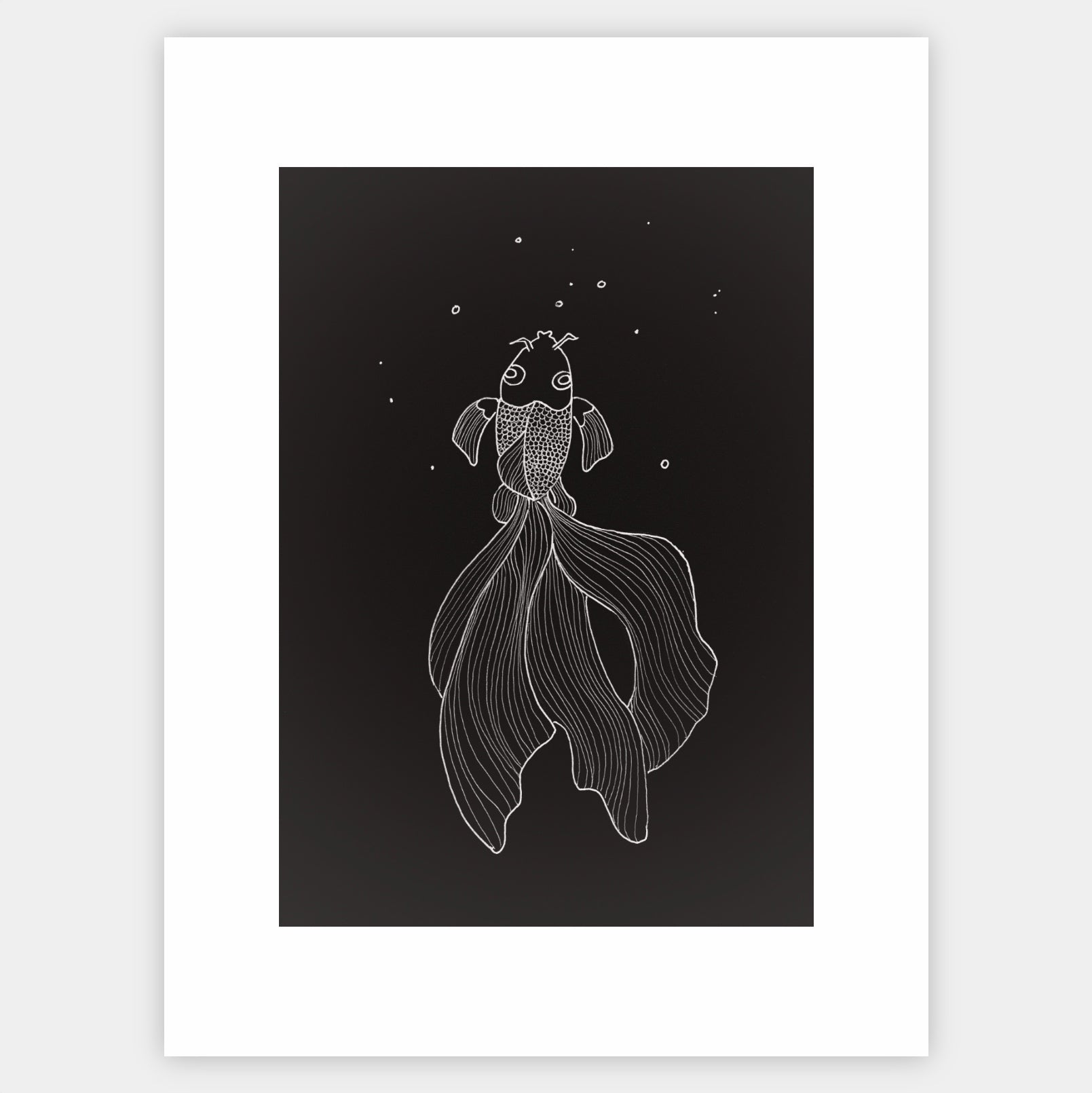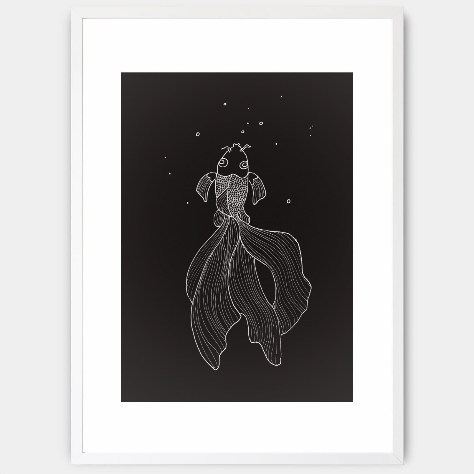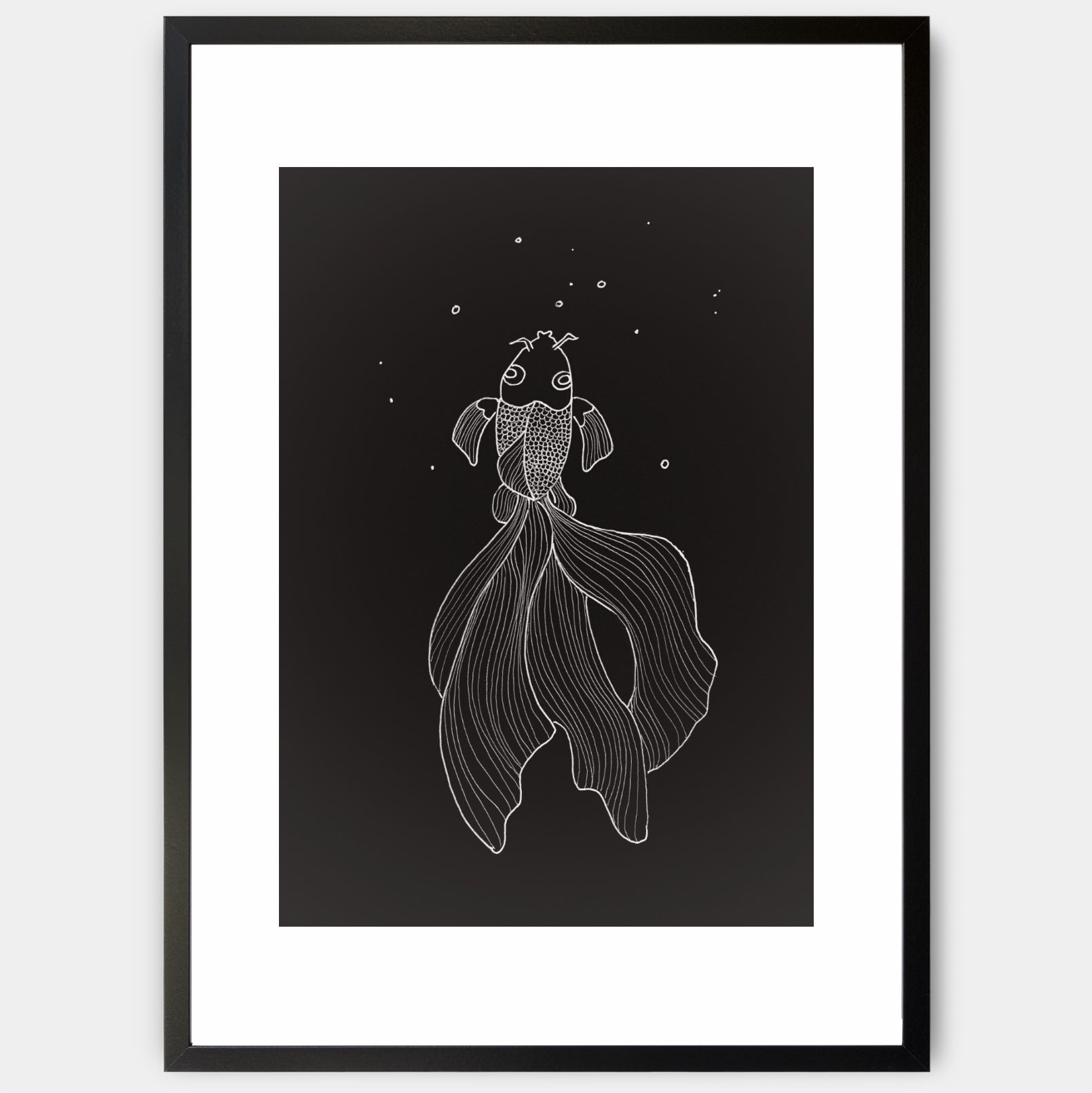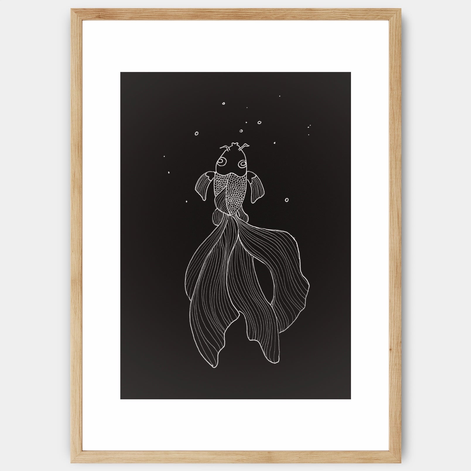 A poster with a fish motif on a black background from the Night and Day collection. An elegant white border is part of the print, designed so that the print can be supplemented with a standard passe-partout. The poster is sold without a frame, with the option to order a thin wooden frame with a thickness of 1.2 cm. There are three color options to choose from - white , black and oak design.
