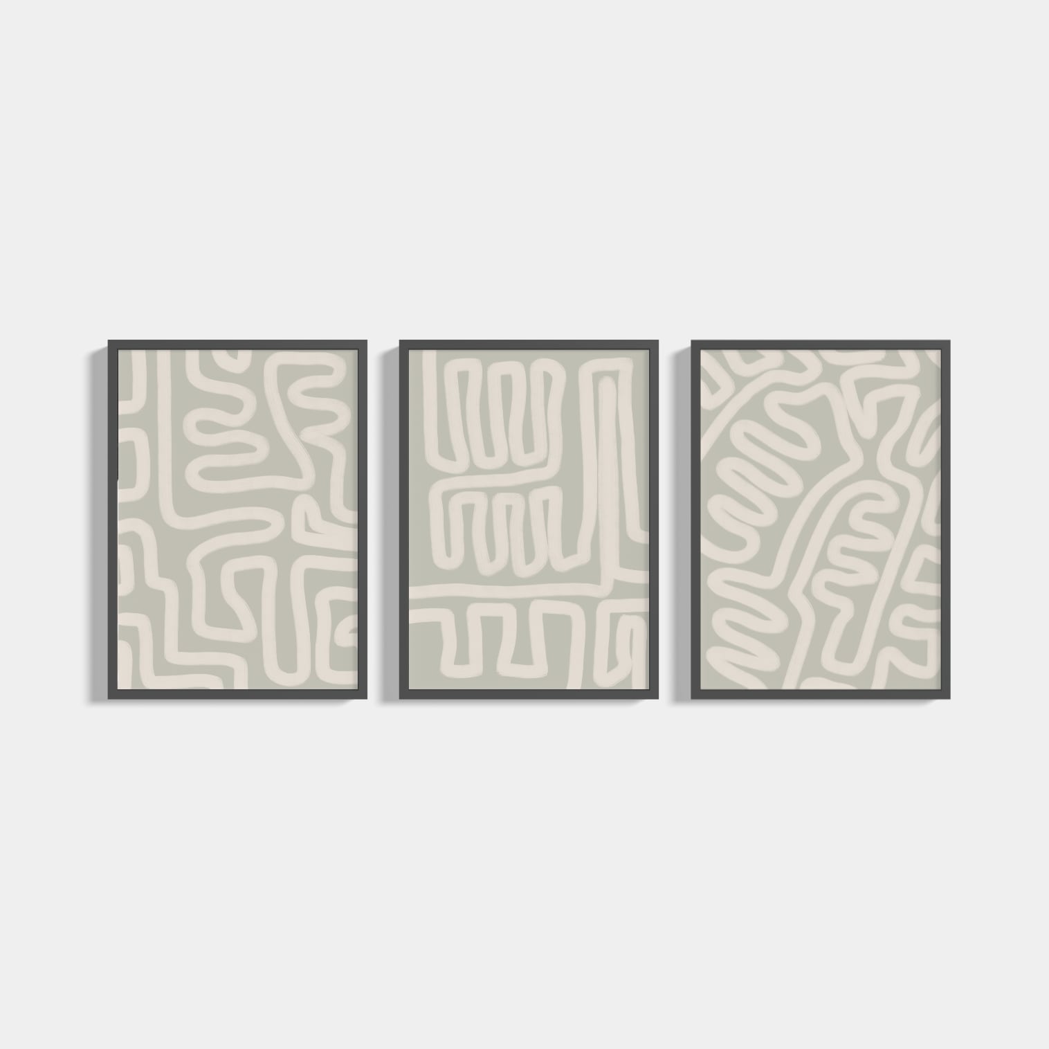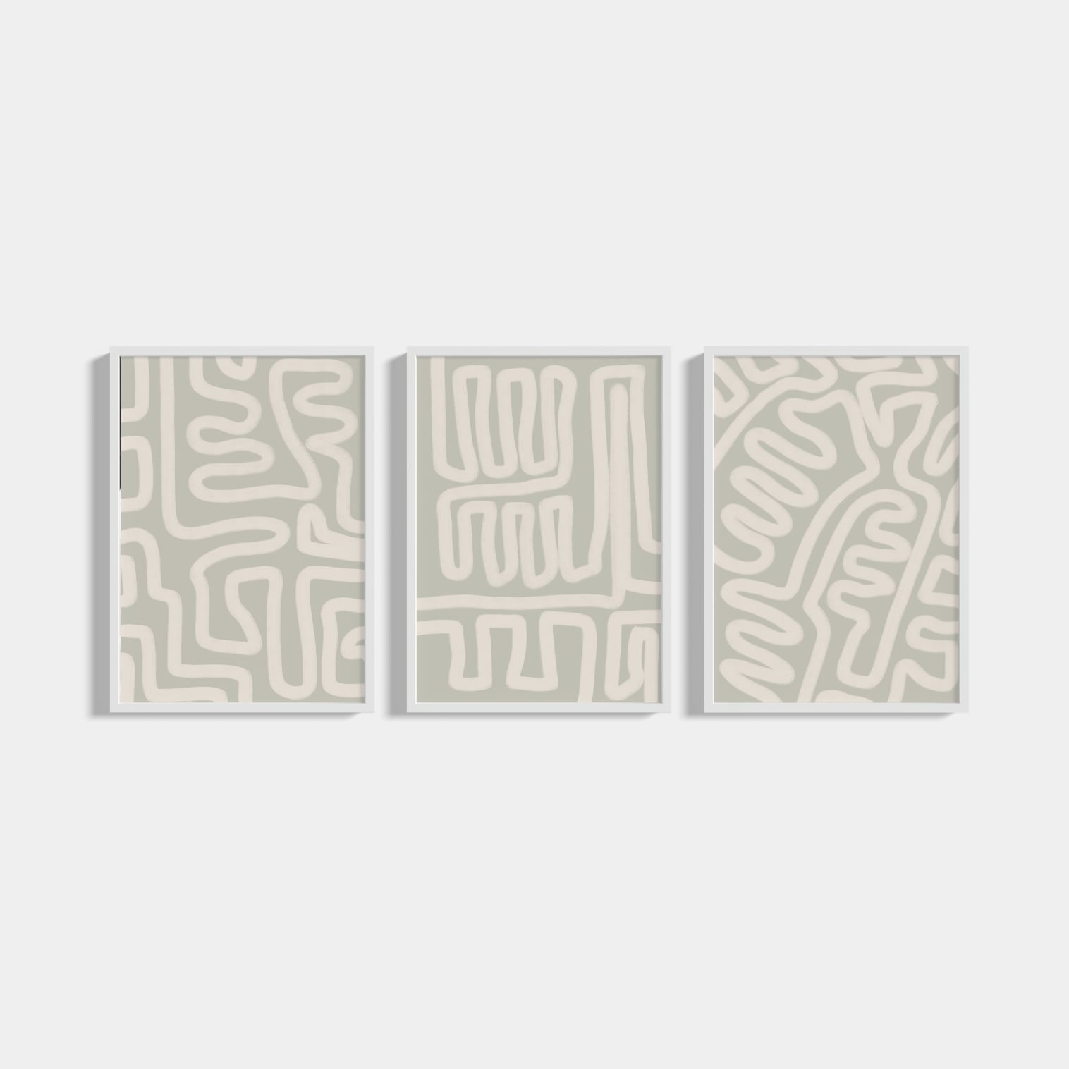 Set of three posters from the Maze series in natural green. Contains 3 posters measuring 50x70cm, without frames. The posters can be purchased with white, black or oak frames .