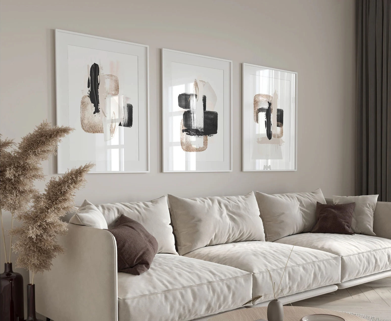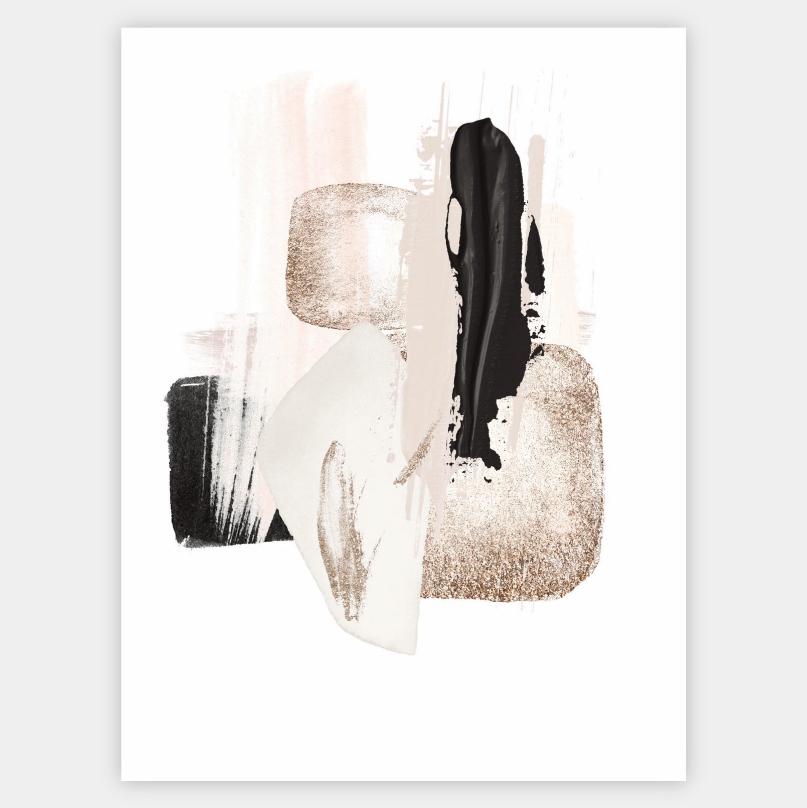 Plakát s abstraktní grafikou různých tvarů se zlatou "Shapes with Gold" No. Poster se prodává bez rámu s možností doobjednat tenký dřevěný rám o tloušťce 1,2 cm. Na výběr jsou tři barevná provedení - bílý , černý a dubový design.