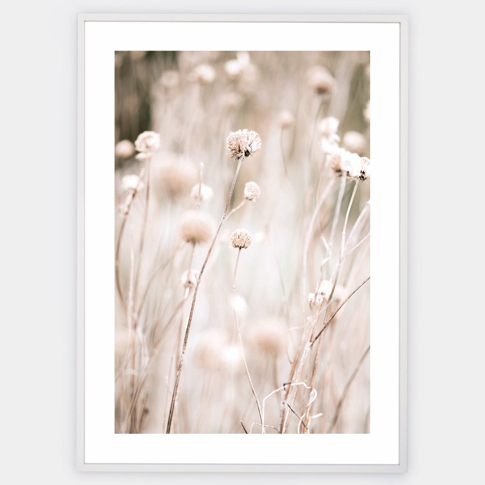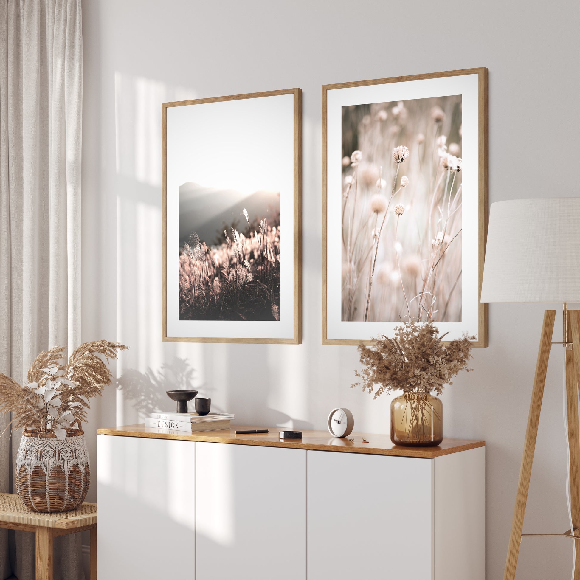 Boho plakát s fotografií podzimní louky. Elegantní bílý okraj je součástí printu. Poster se prodává bez rámu s možností doobjednat tenký dřevěný rám o tloušťce 1,2 cm. Na výběr jsou tři barevná provedení - bílý , černý a dubový design.