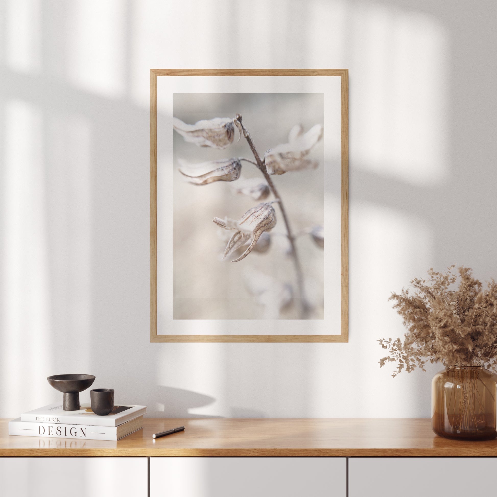 Boho plakát s fotografií suchého květu. Elegantní bílý okraj je součástí printu. Poster se prodává bez rámu s možností doobjednat tenký dřevěný rám o tloušťce 1,2 cm. Na výběr jsou tři barevná provedení - bílý , černý a dubový design.
