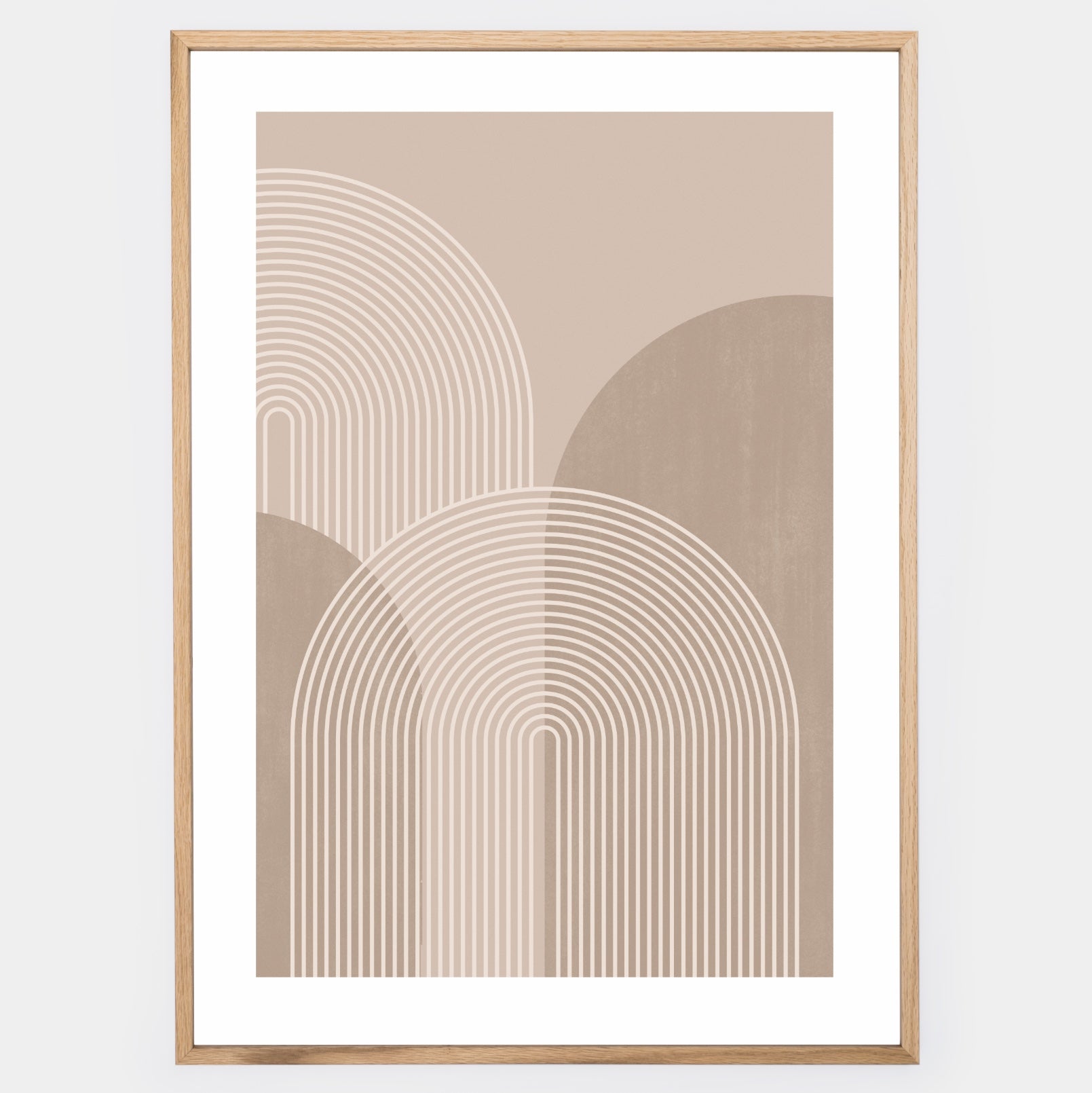 Boho plakát s geometrickými tvary v béžových odstínech No. 1. Poster se prodává bez rámu s možností doobjednat tenký dřevěný rám o tloušťce 1,2 cm. Na výběr jsou tři barevná provedení - bílý , černý a dubový design.