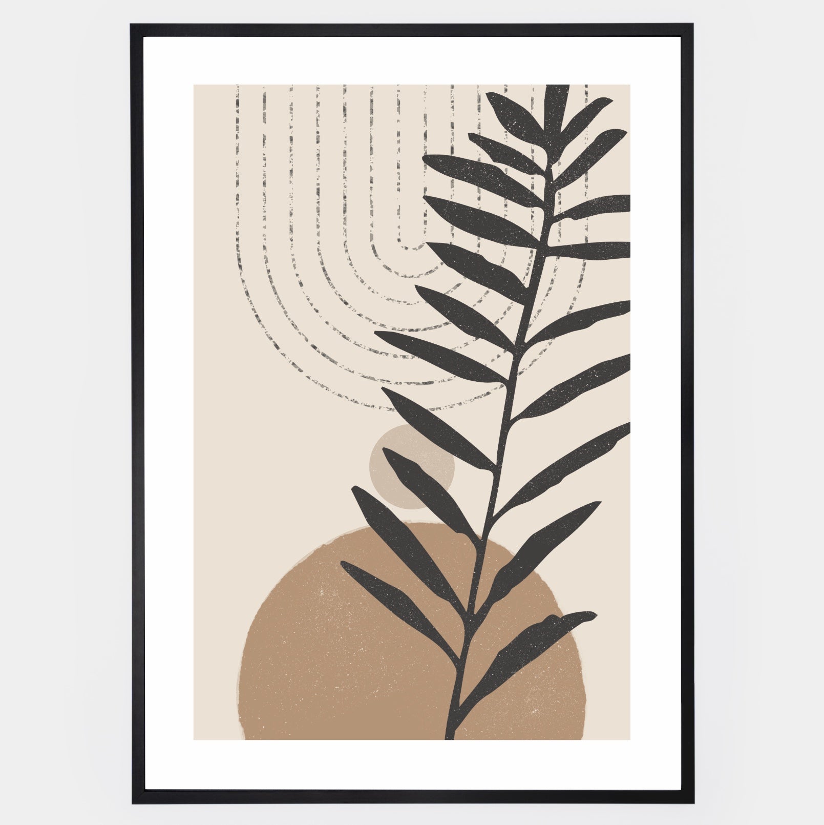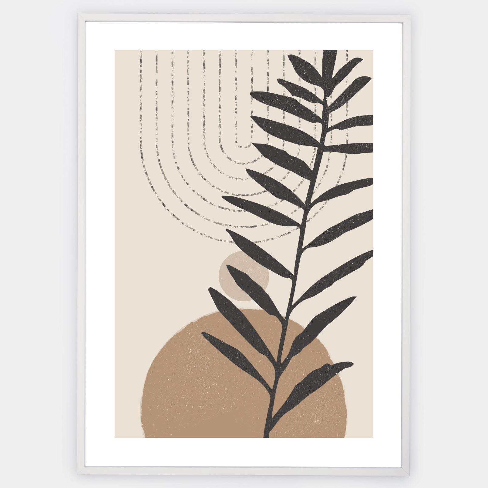 Boho plakát s oblými geometrickými tvary v béžových odstínech se siluetou palmového listu. Elegantní bílý okraj je součástí printu. Poster se prodává bez rámu s možností doobjednat tenký dřevěný rám o tloušťce 1,2 cm. Na výběr jsou tři barevná provedení - bílý , černý a dubový design.