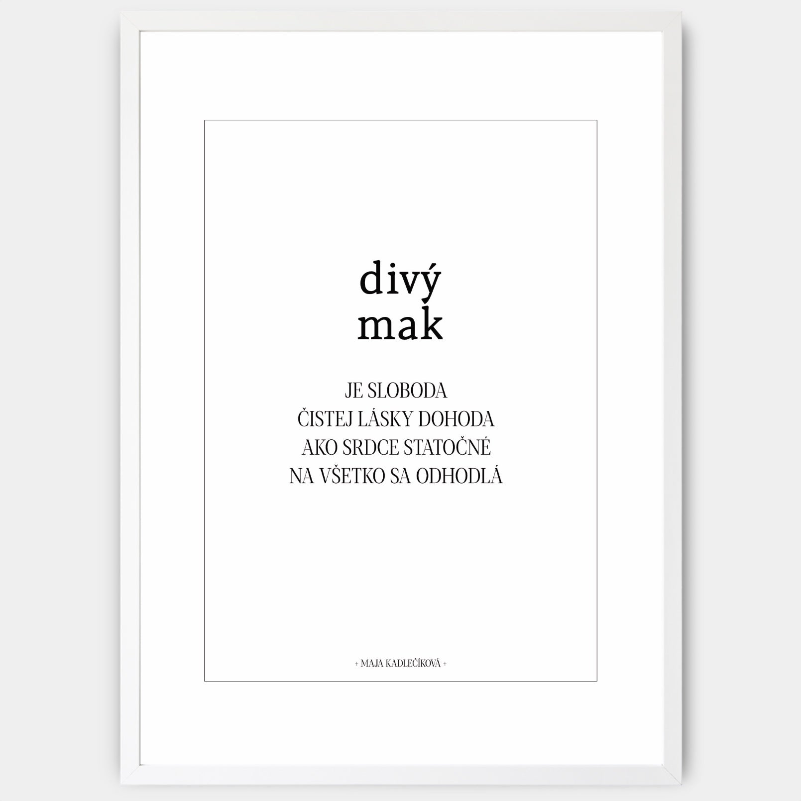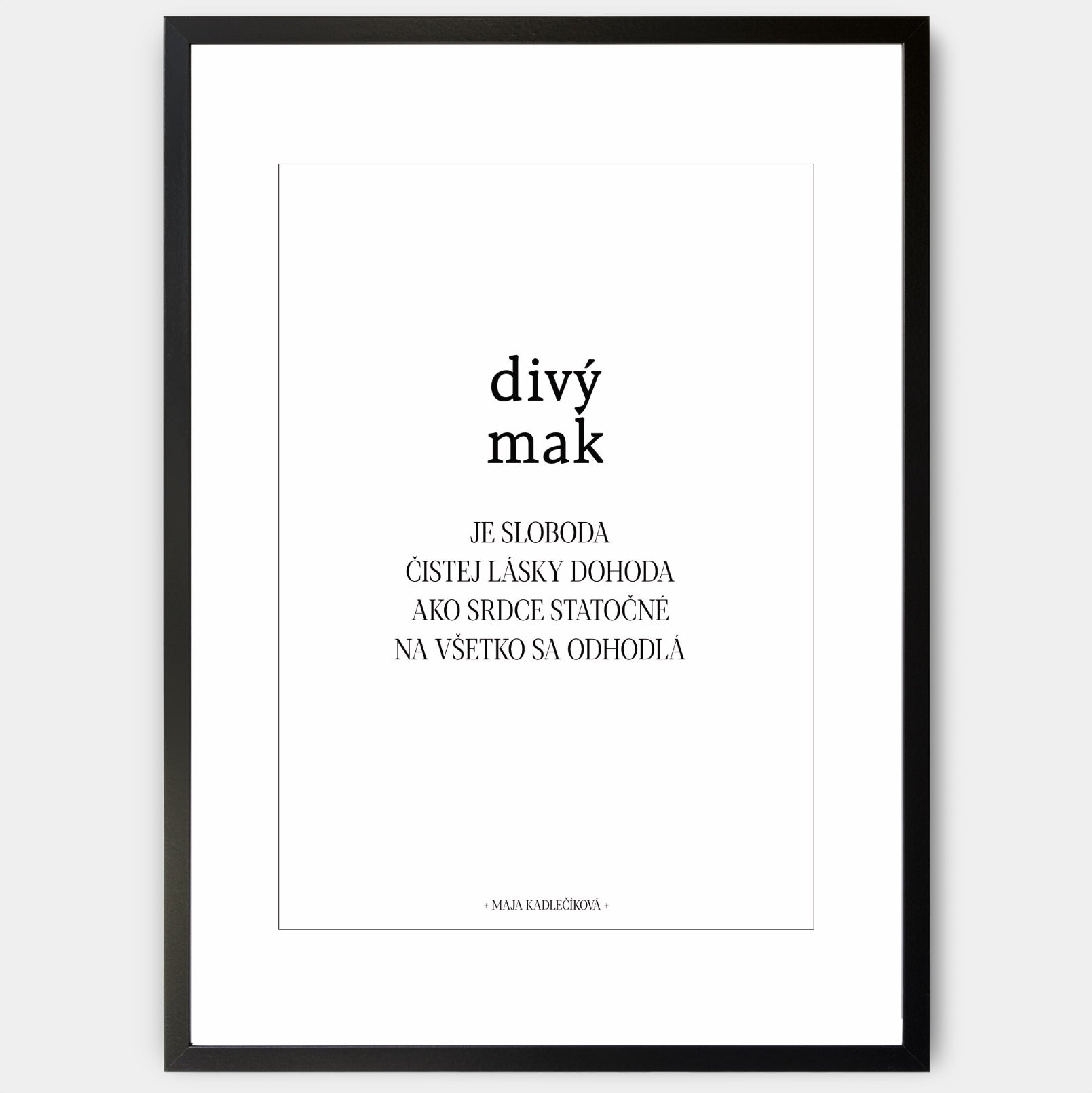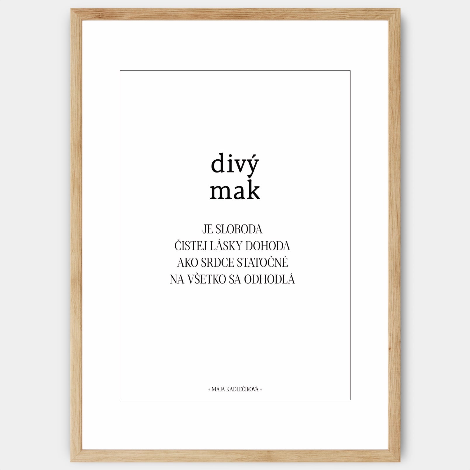 Plakát s básní "Divý mák" z kolekce Noc a Den doplňuje stejnojmenný plakát s vizuálem divokých máků . Je navržen tak, aby jej bylo možné doplnit o standardní paspartu. Poster se prodává bez rámu s možností doobjednat tenký dřevěný rám o tloušťce 1,2 cm. Na výběr jsou tři barevná provedení - bílý , černý a dubový design.