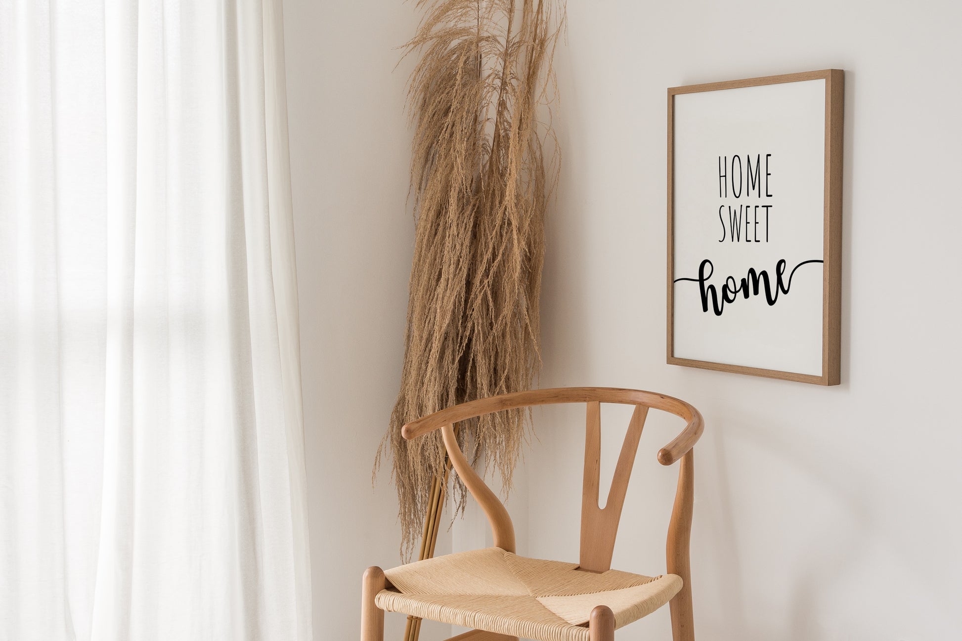 Plakát s moderním kaligrafickým nápisem Home sweet home. Poster se prodává bez rámu s možností doobjednat tenký dřevěný rám o tloušťce 1,2 cm. Na výběr jsou tři barevná provedení - bílý , černý a dubový design.