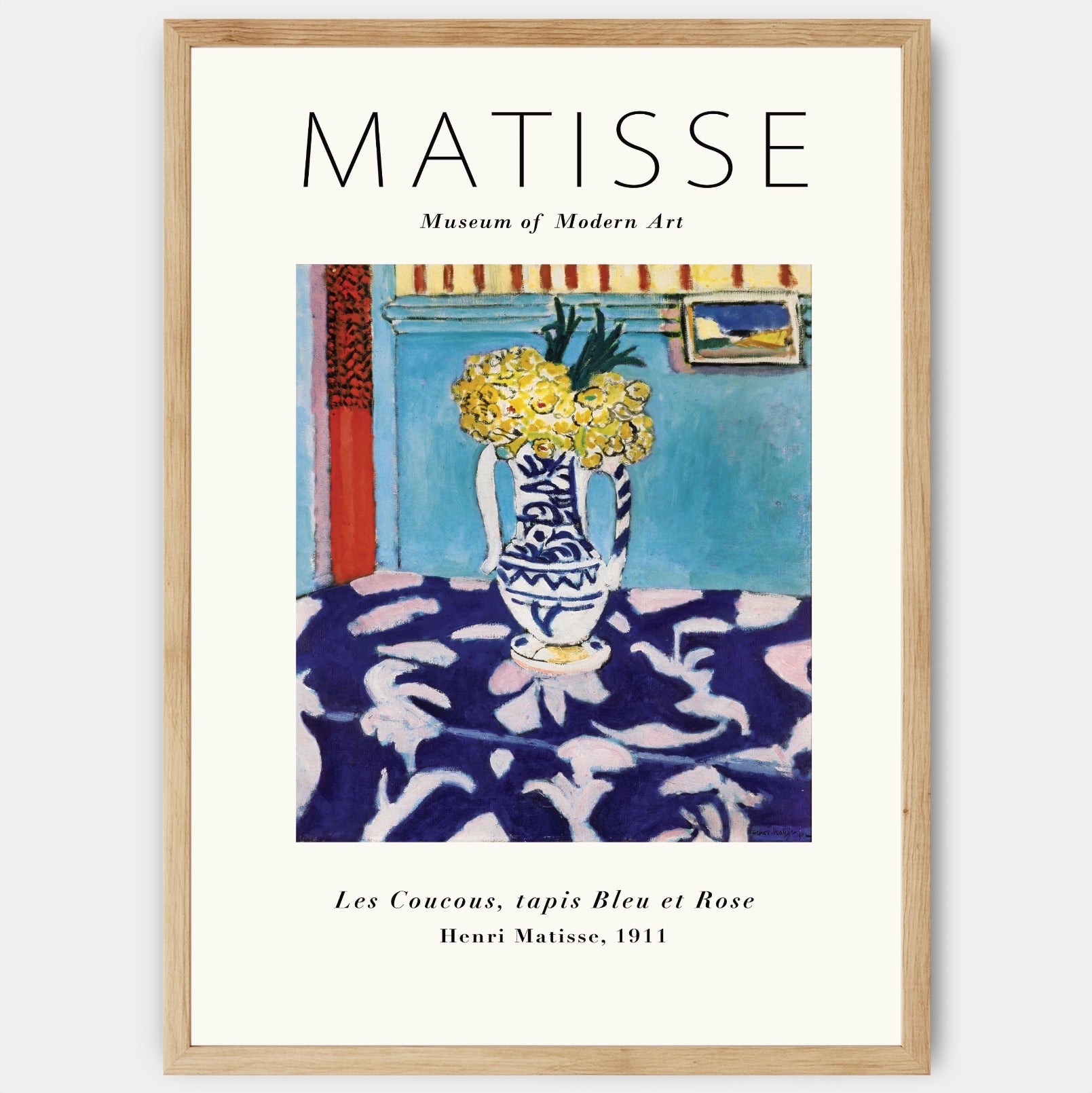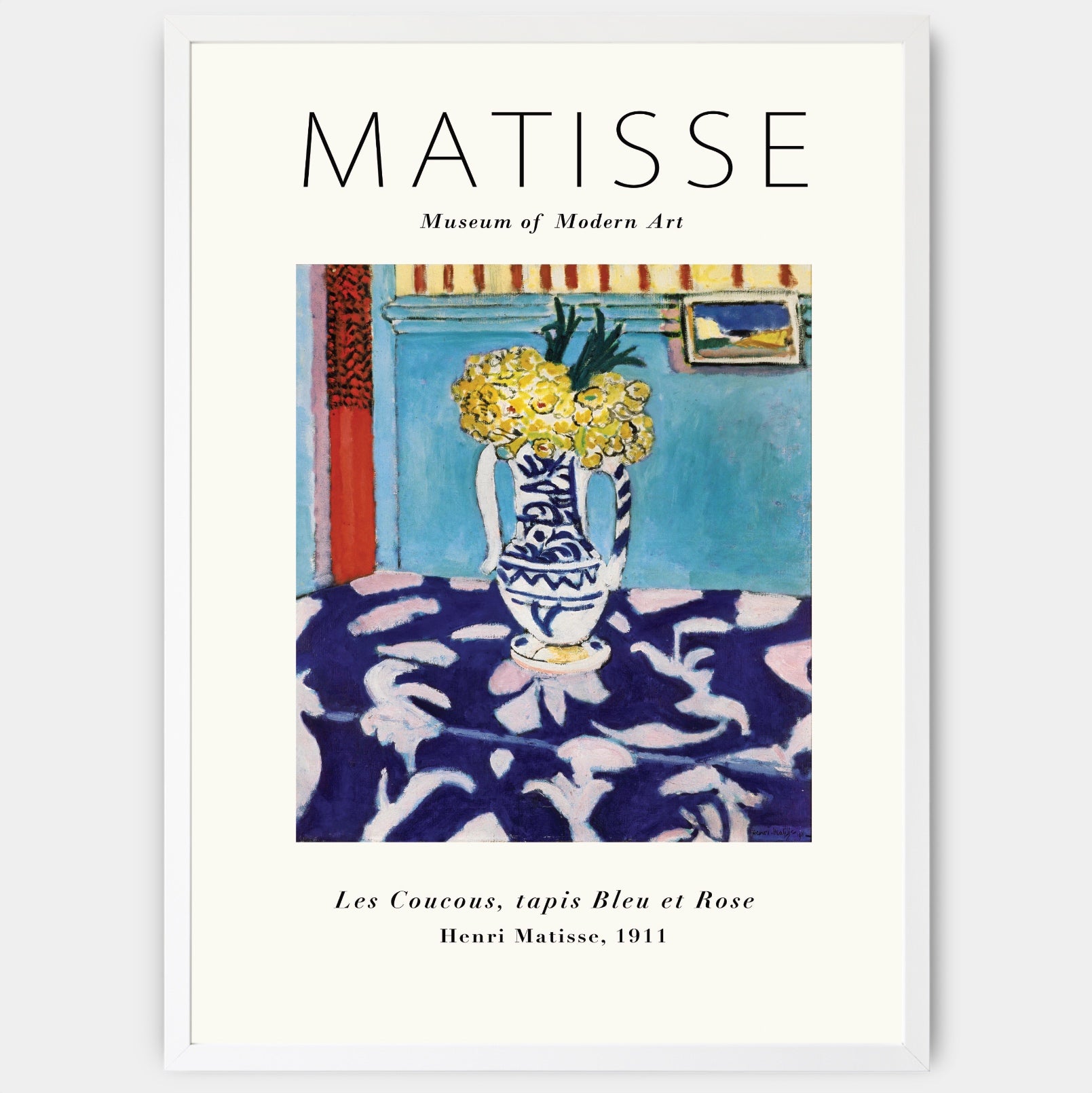 Plakát s motivem díla Henriho Matissa Les Coucous z roku 1911. Poster se prodává bez rámu s možností doobjednat tenký dřevěný rám o tloušťce 1,2 cm. Na výběr jsou tři barevná provedení - bílý , černý a dubový design.