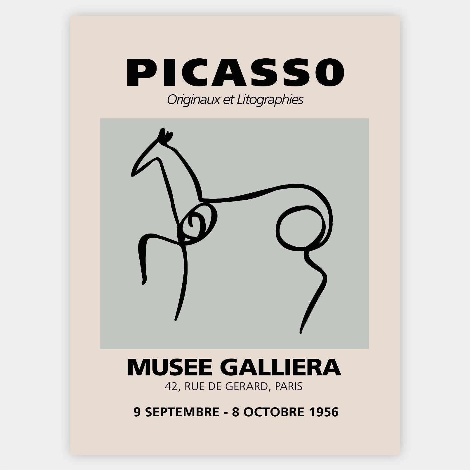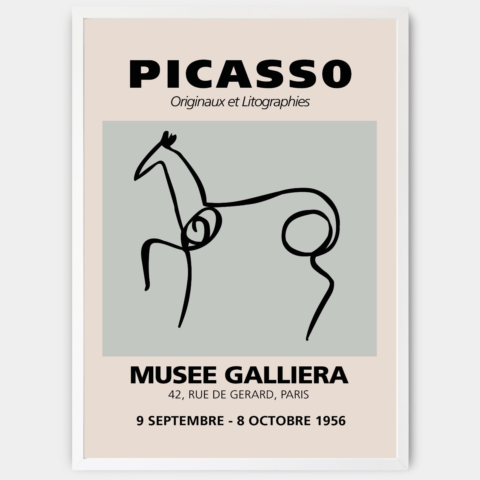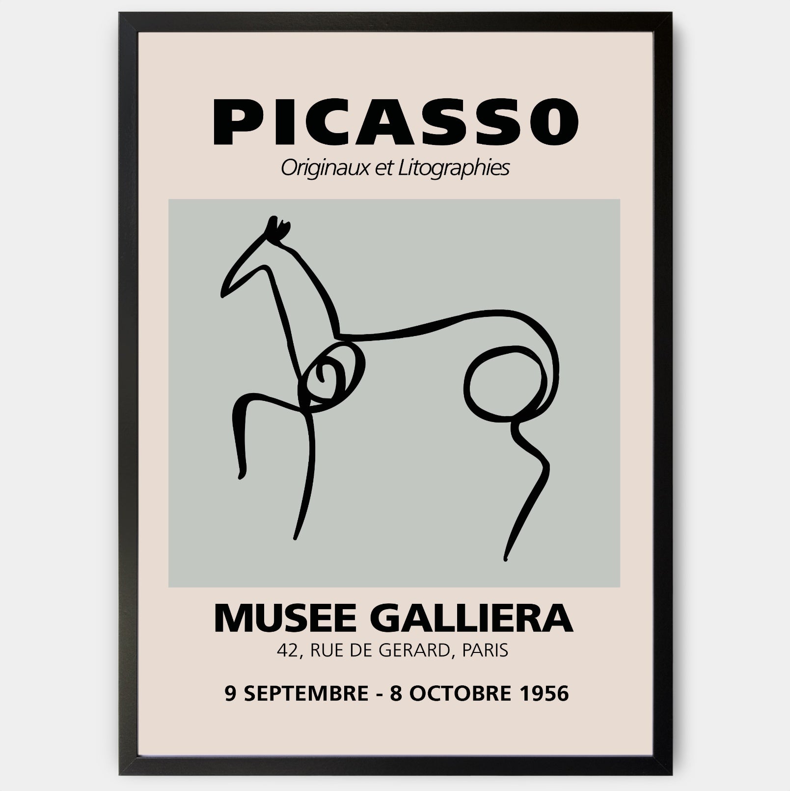 Výstavní plakát s motivem minimalistické kresby koně od Pabla Picassa z roku 1956. Poster se prodává bez rámu s možností doobjednat tenký dřevěný rám o tloušťce 1,2 cm. Na výběr jsou tři barevná provedení - bílý , černý a dubový design.