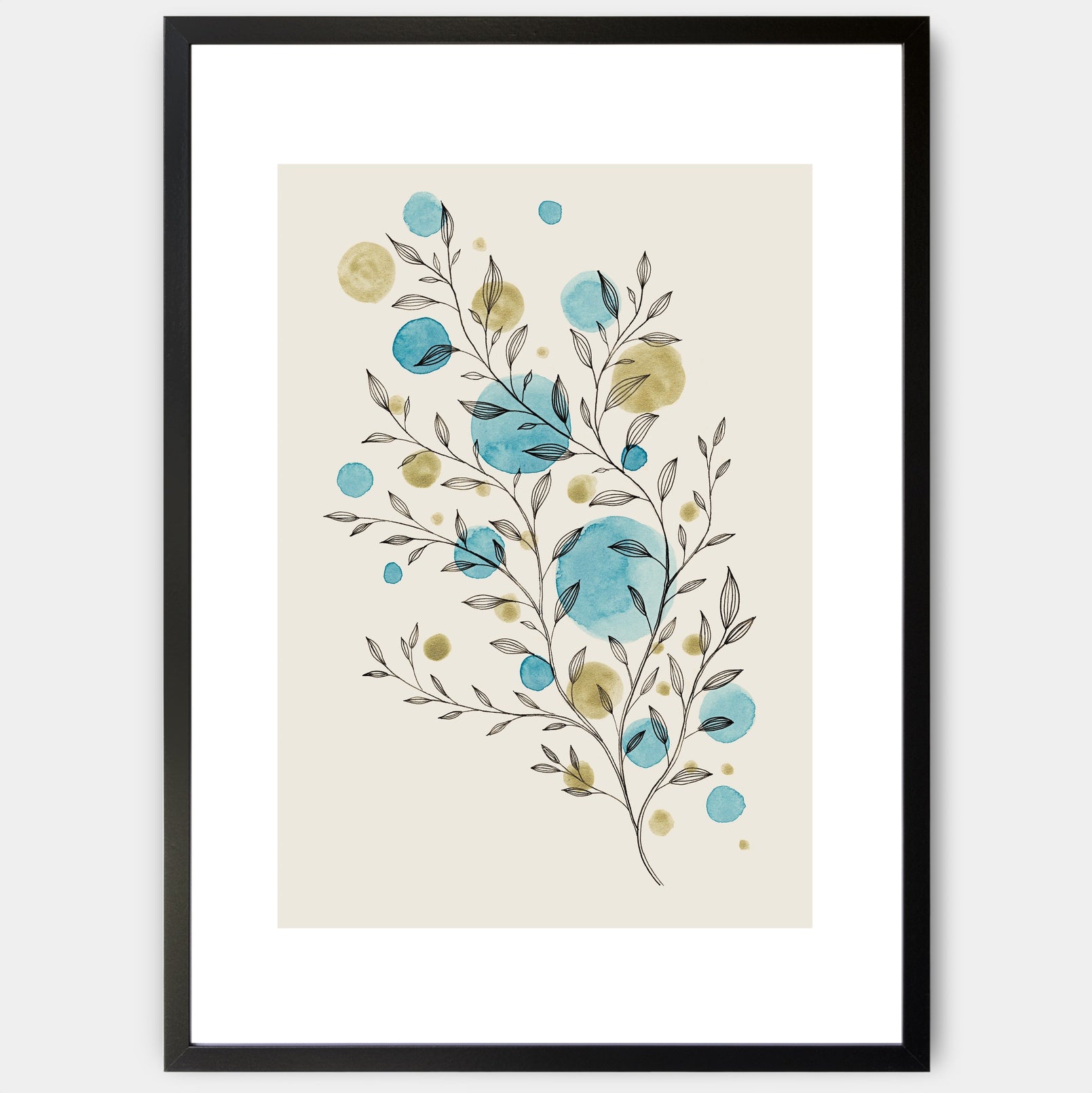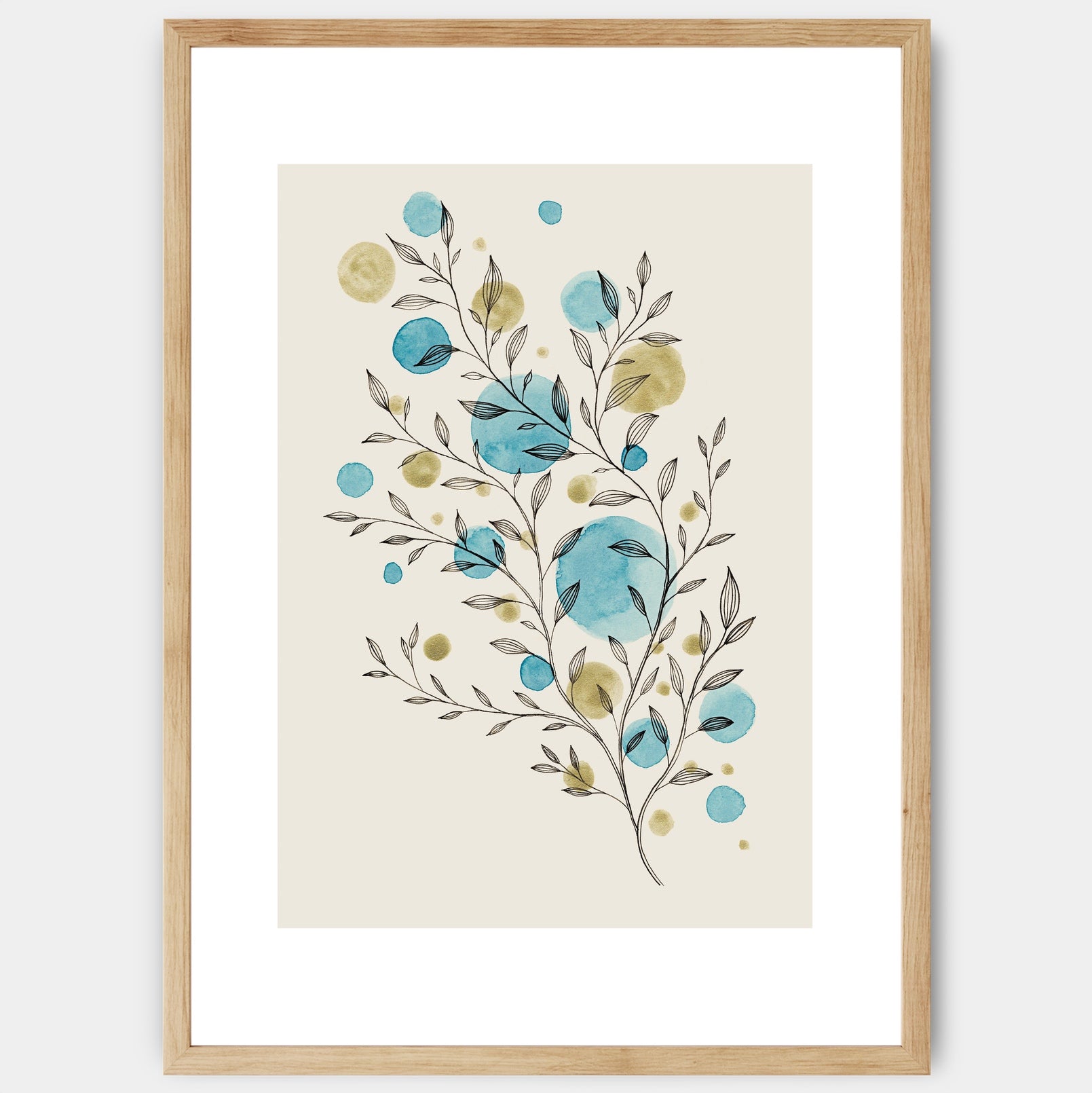 Plakát s květinovým motivem v modro-zlatém provedení. Elegantní bílý okraj je součástí printu, je navržen tak, aby bylo možno print doplnit o standardní paspartu. Poster se prodává bez rámu s možností doobjednat tenký dřevěný rám o tloušťce 1,2 cm. Na výběr jsou tři barevná provedení - bílý , černý a dubový design.