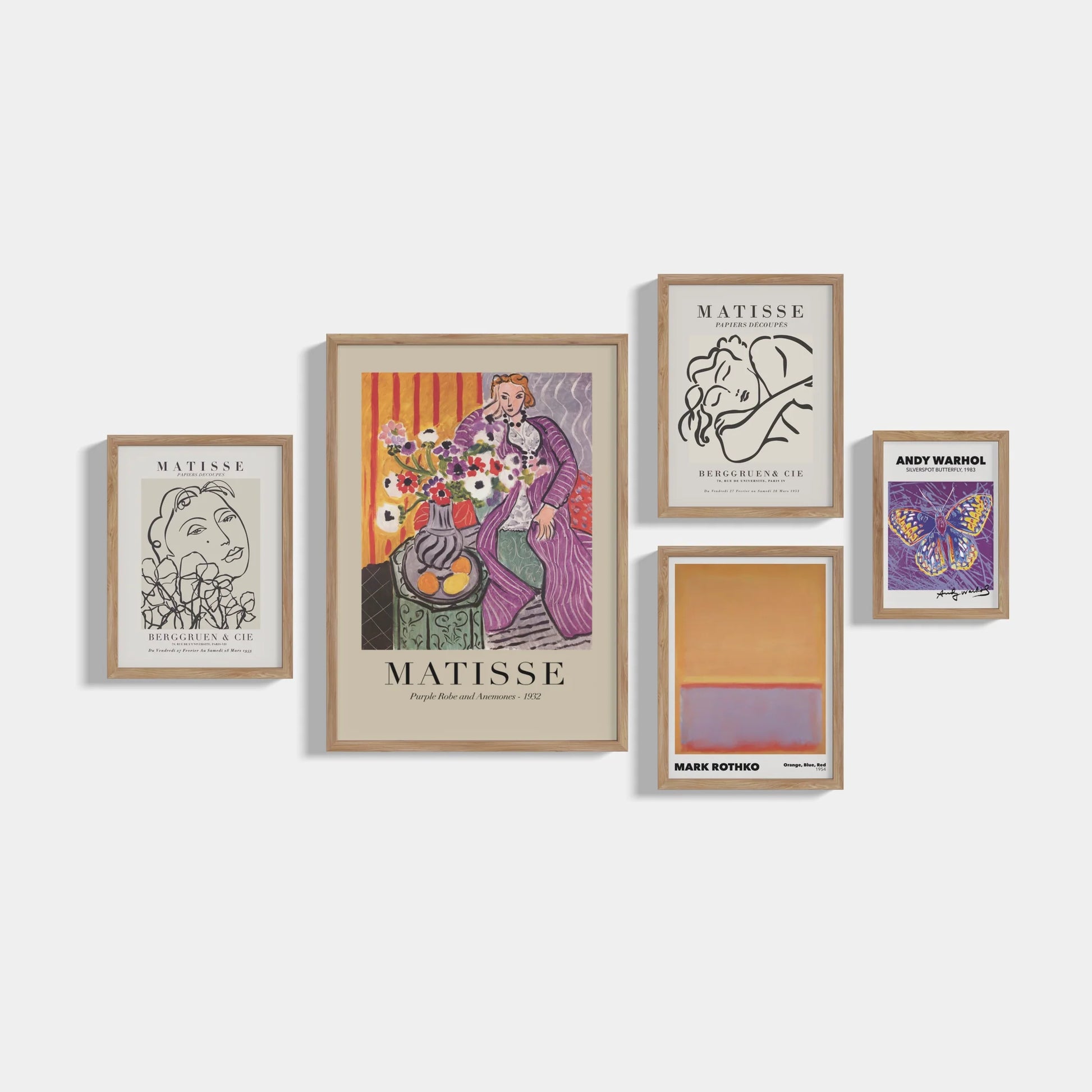 Sestava pěti eklektických plakátů s díly světových umělců. Obsahuje 1 plakát o rozměru 50x70cm, 3 plakáty 30x40 cm a 1 plakát 20x30 cm, bez rámů. K plakátům lze dokoupit bílé, černé nebo dubové rámy .