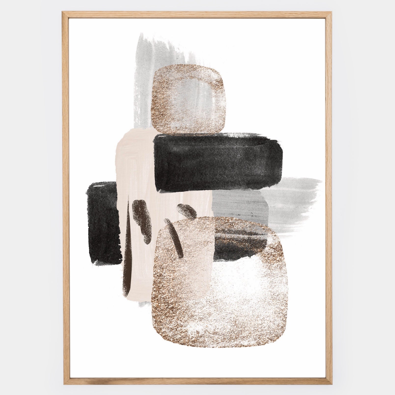 Plagát s abstraktnou grafikou "Neutral Gold" No. 3. Poster sa predáva bez rámu s možnosťou doobjednať tenký drevený rám o hrúbke 1,2 cm. Na výber sú tri farebné prevedenia - biely, čierny a dubový dizajn.
