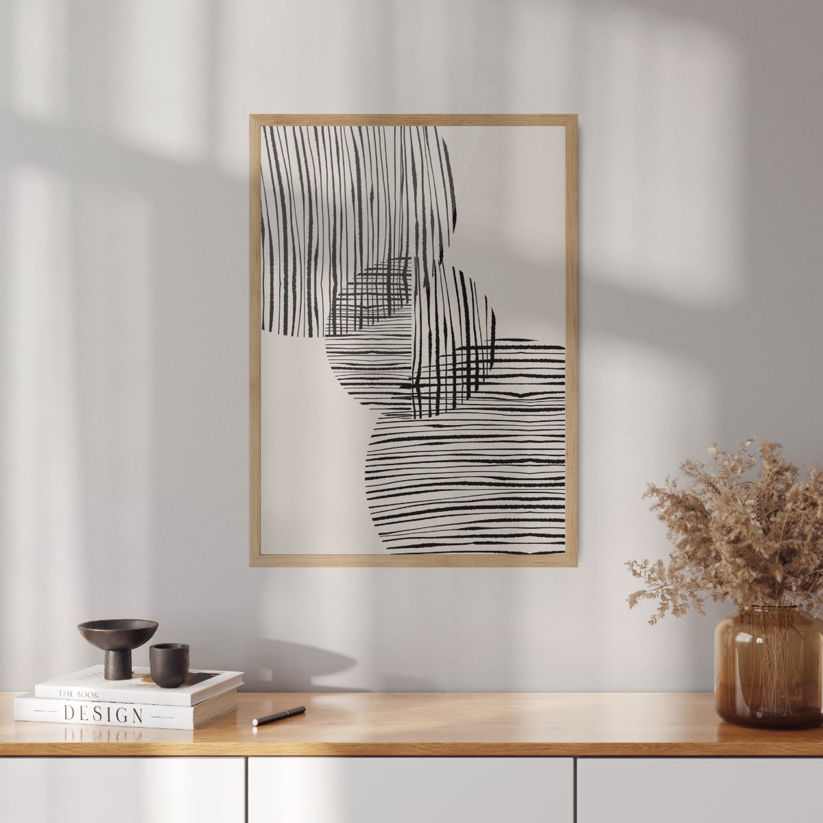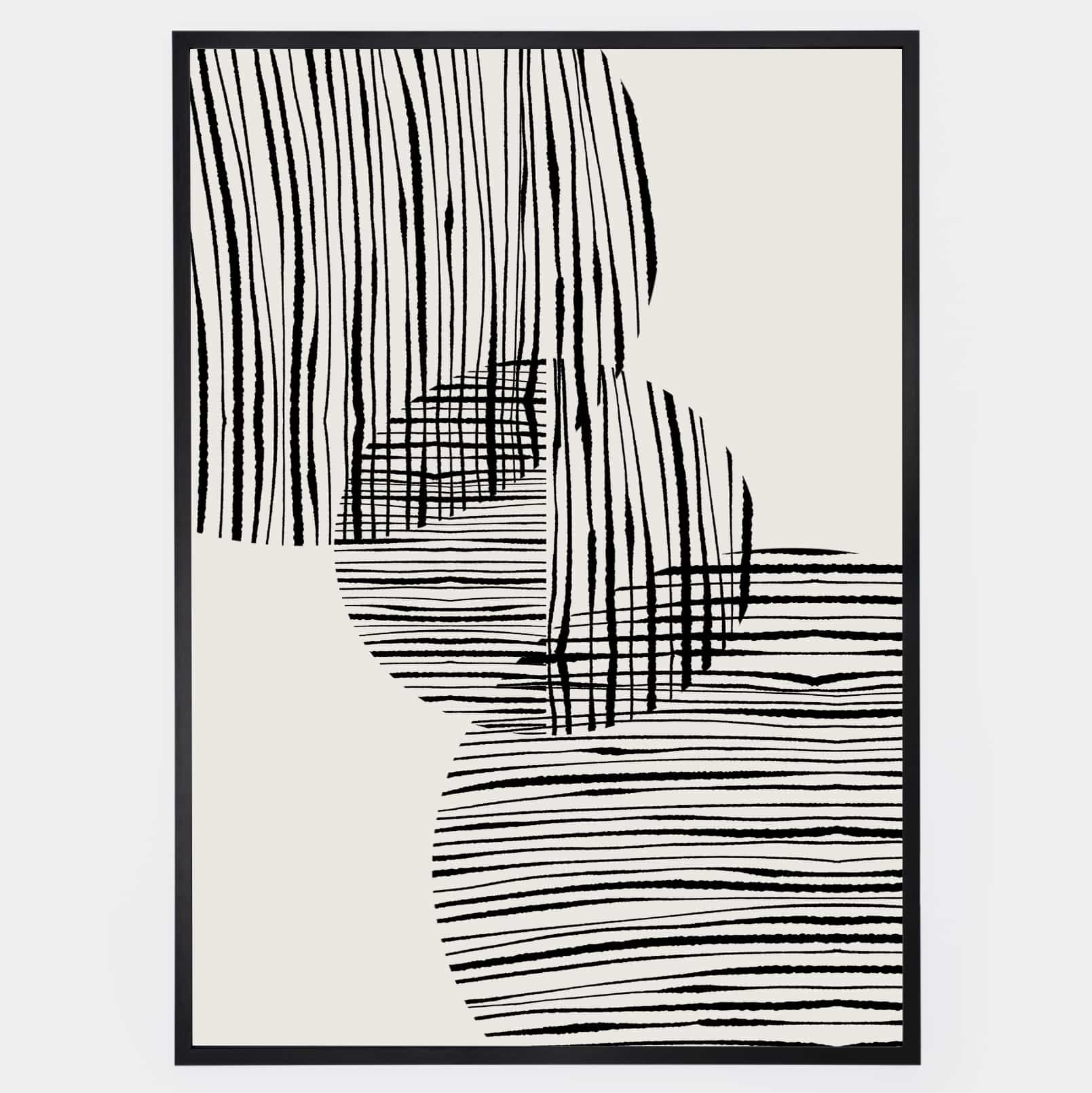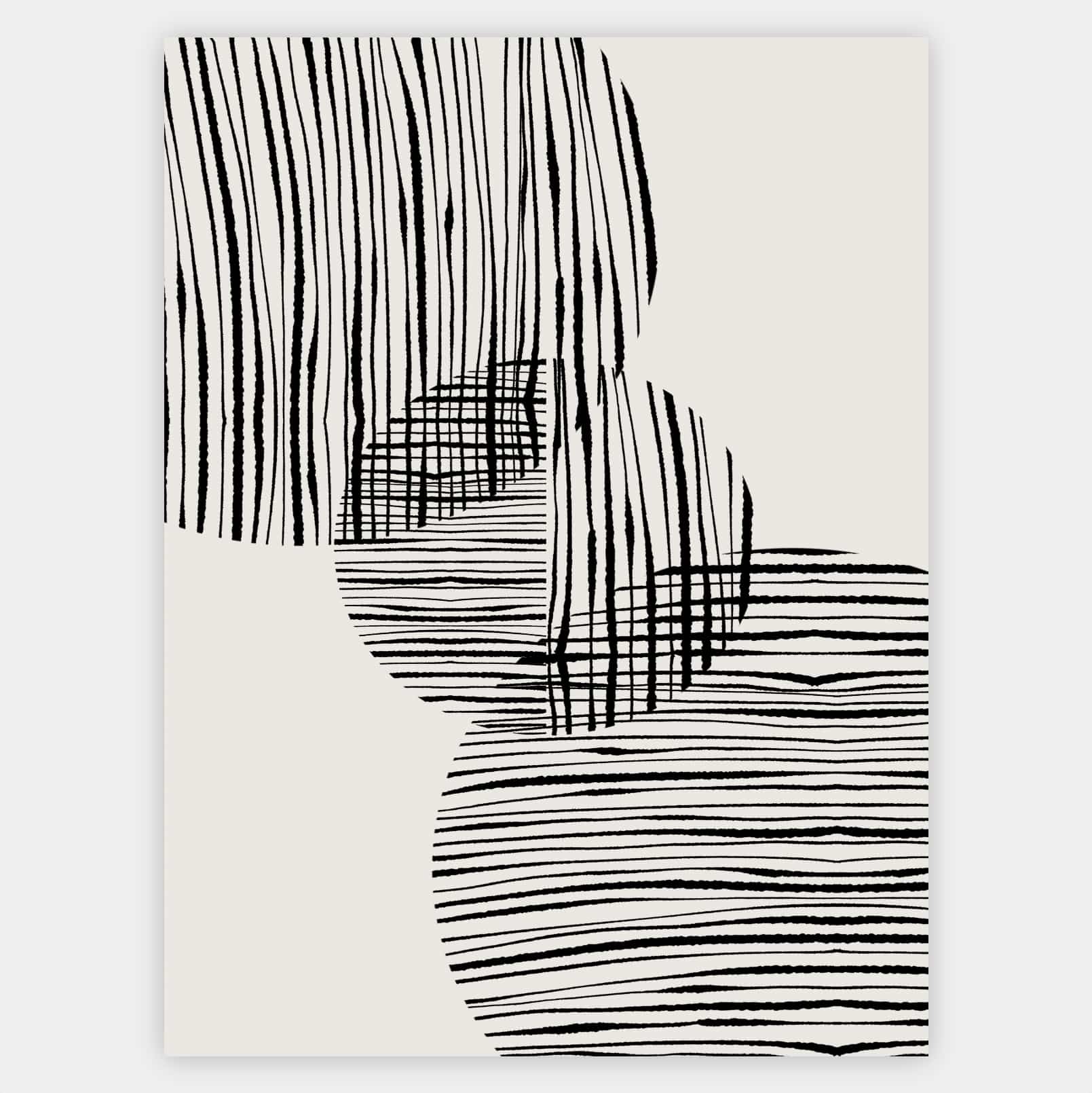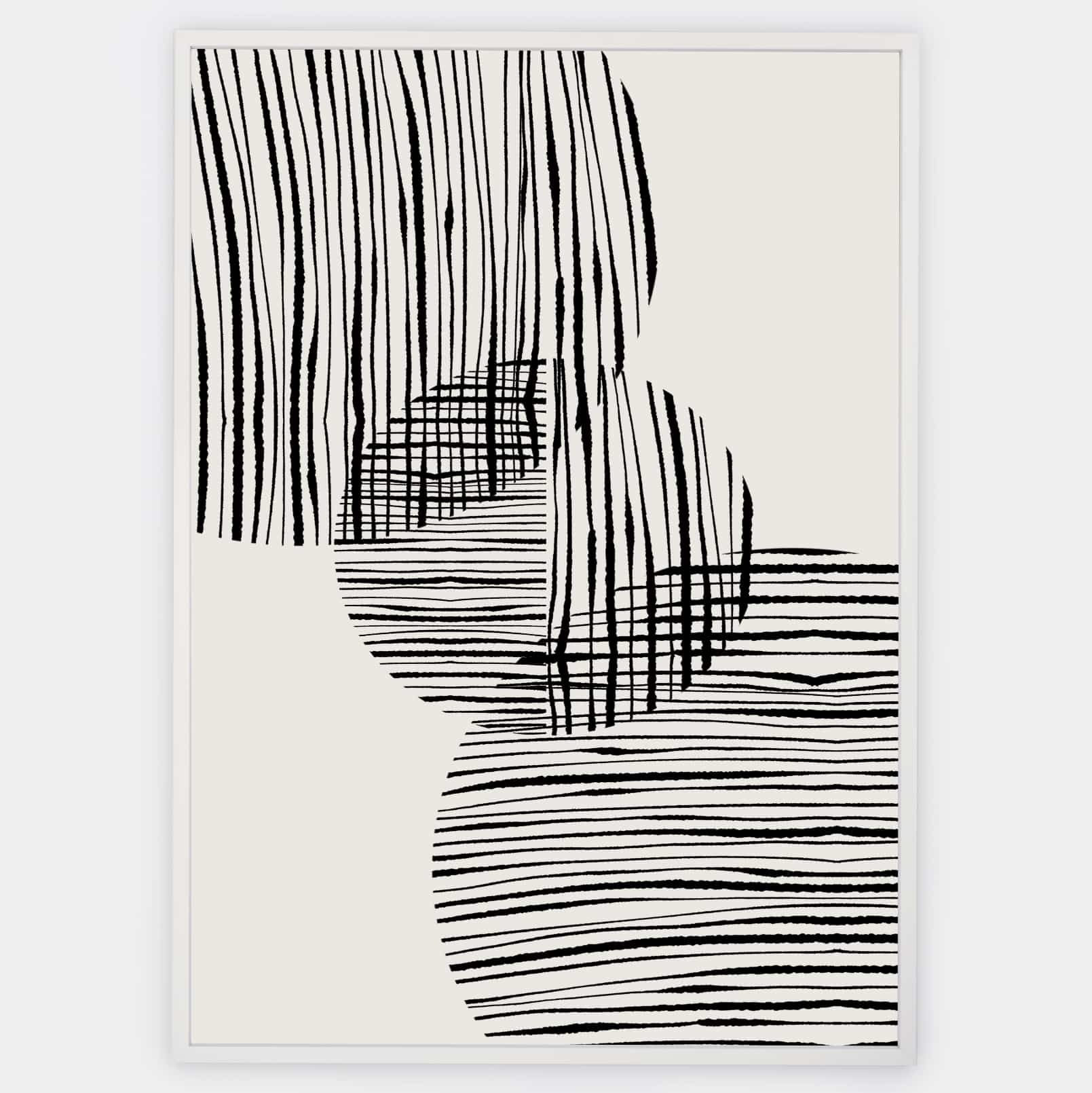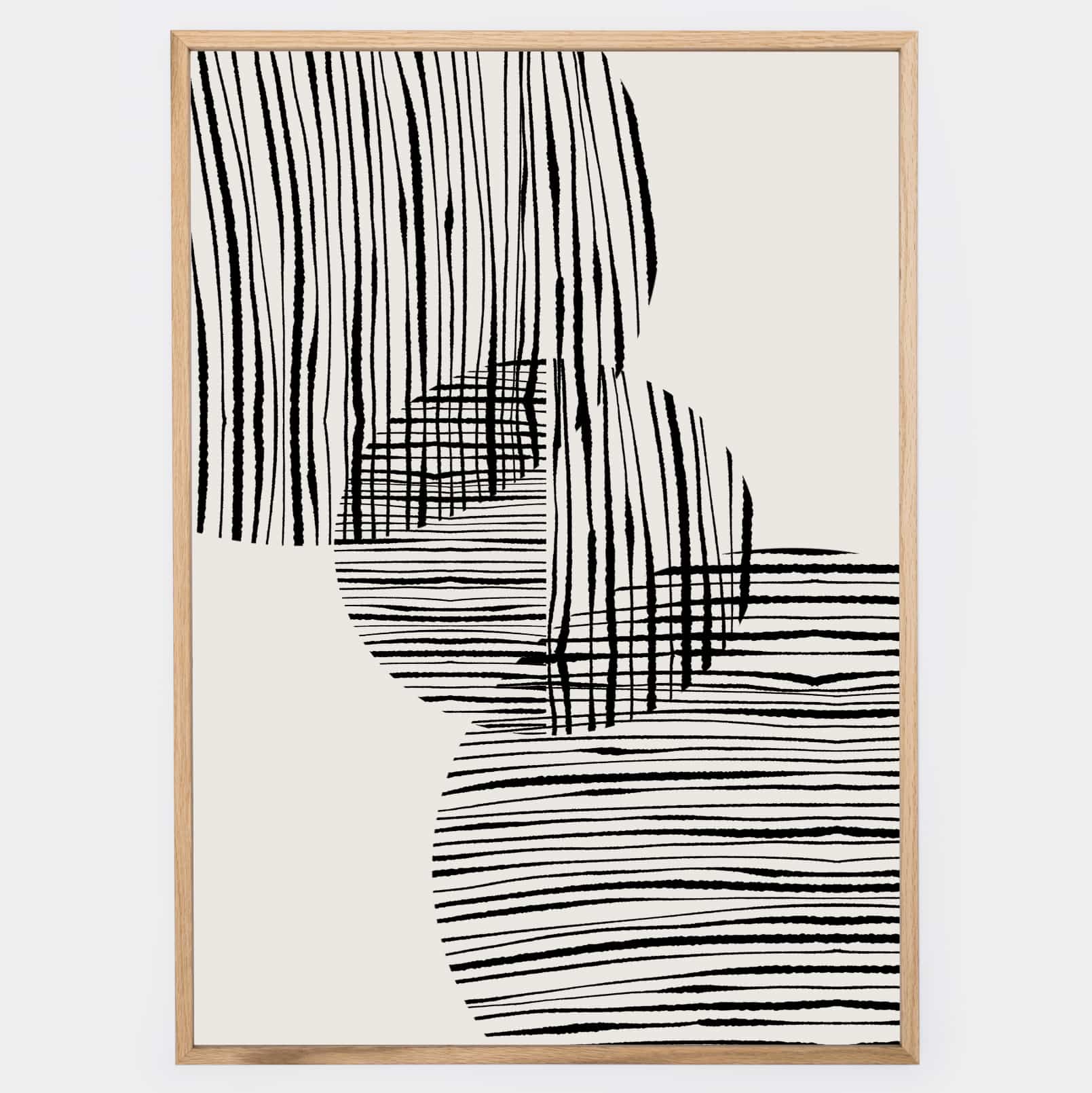 Boho plagát s grafikou "Fabric circles" No. 1 na béžovom podklade. Poster sa predáva bez rámu s možnosťou doobjednať tenký drevený rám o hrúbke 1,2 cm. Na výber sú tri farebné prevedenia - biely, čierny a dubový dizajn.