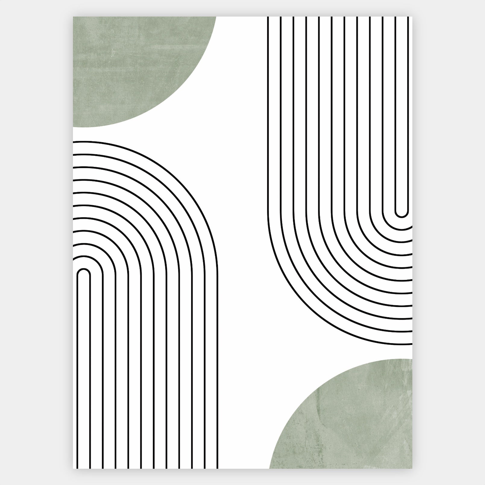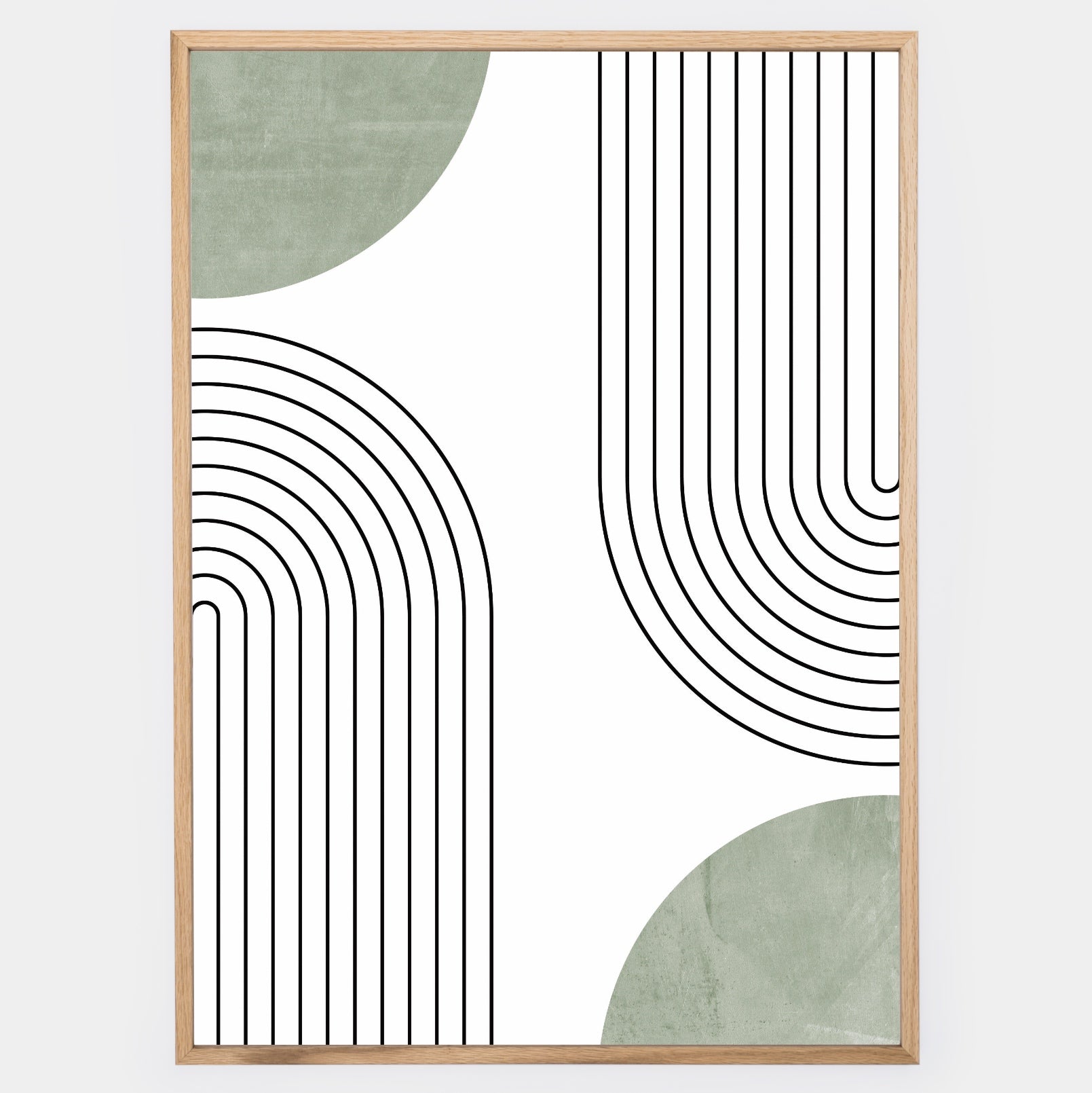 Boho plagát s grafikou oblúkov a kruhu "Green" 2. Poster sa predáva bez rámu s možnosťou doobjednať tenký drevený rám o hrúbke 1,2 cm. Na výber sú tri farebné prevedenia - bielyčierny a dubový dizajn.
