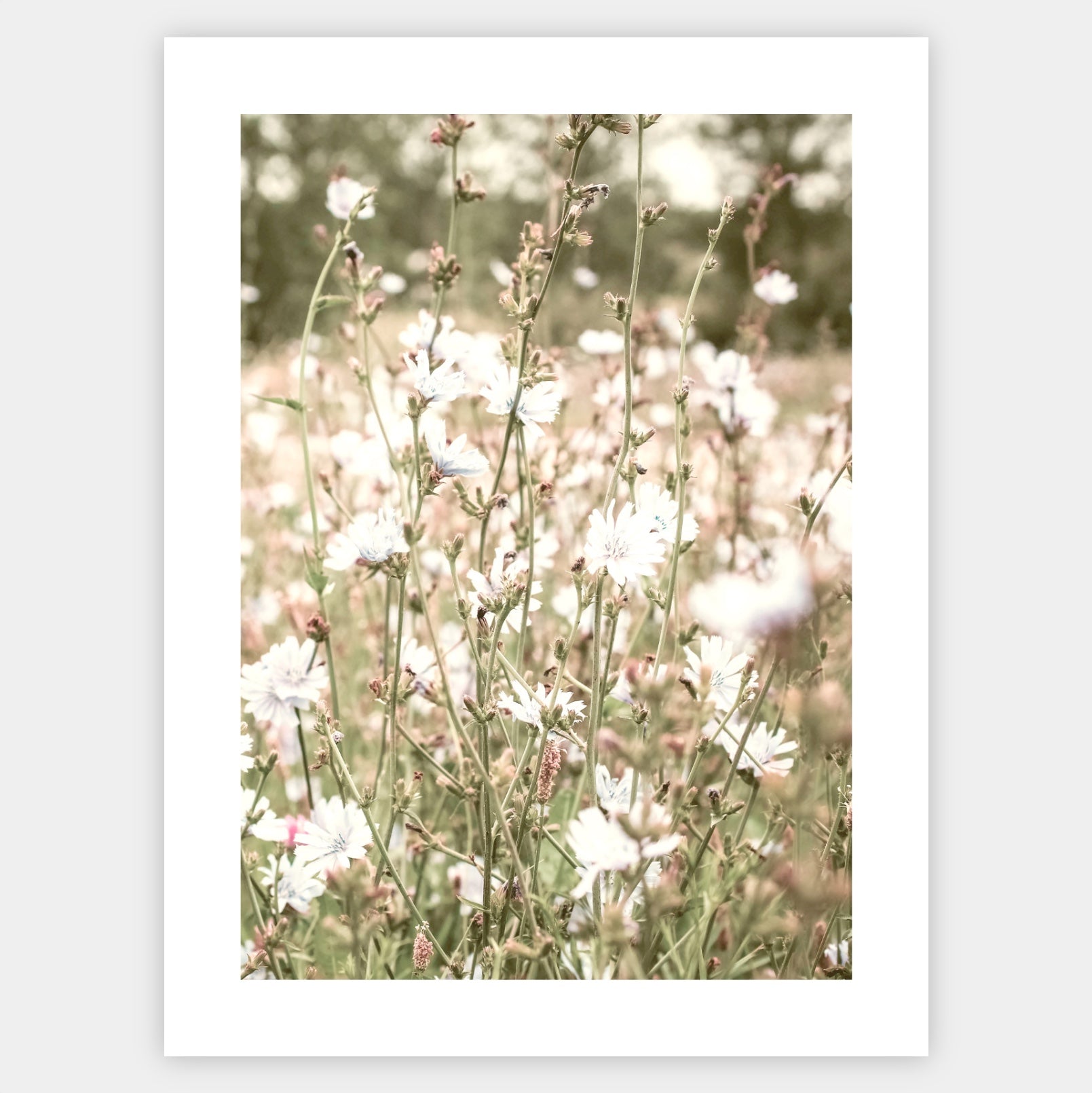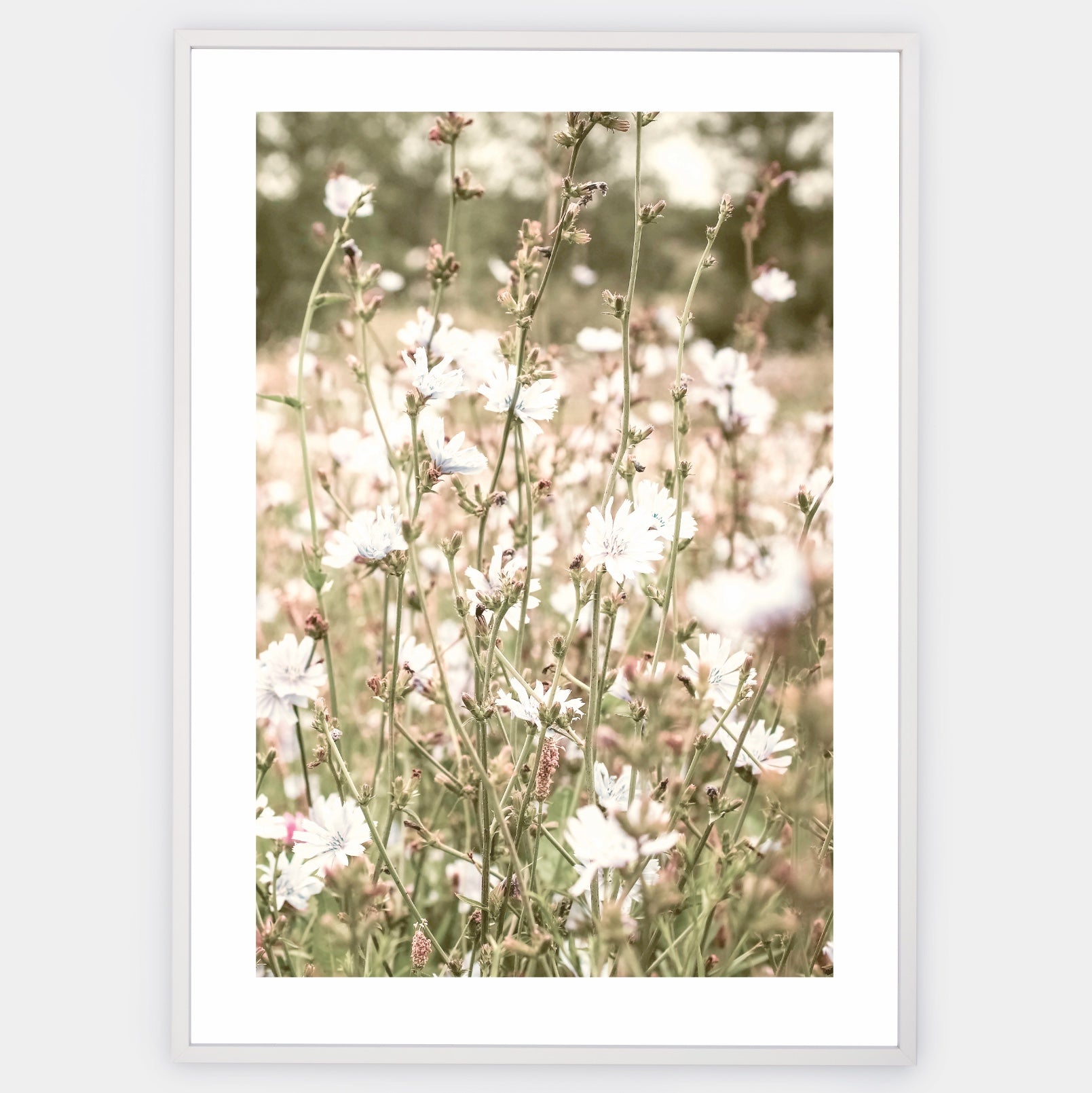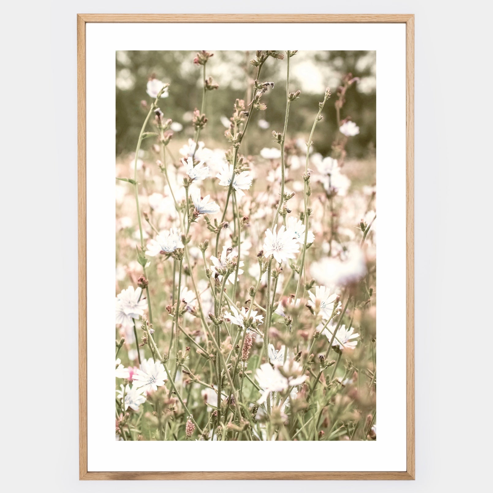 Boho plagát s fotografiou kvitnúcej lúky. Elegantný biely okraj je súčasťou printu. Poster sa predáva bez rámu s možnosťou doobjednať tenký drevený rám o hrúbke 1,2 cm. Na výber sú tri farebné prevedenia - biely, čierny a dubový dizajn.