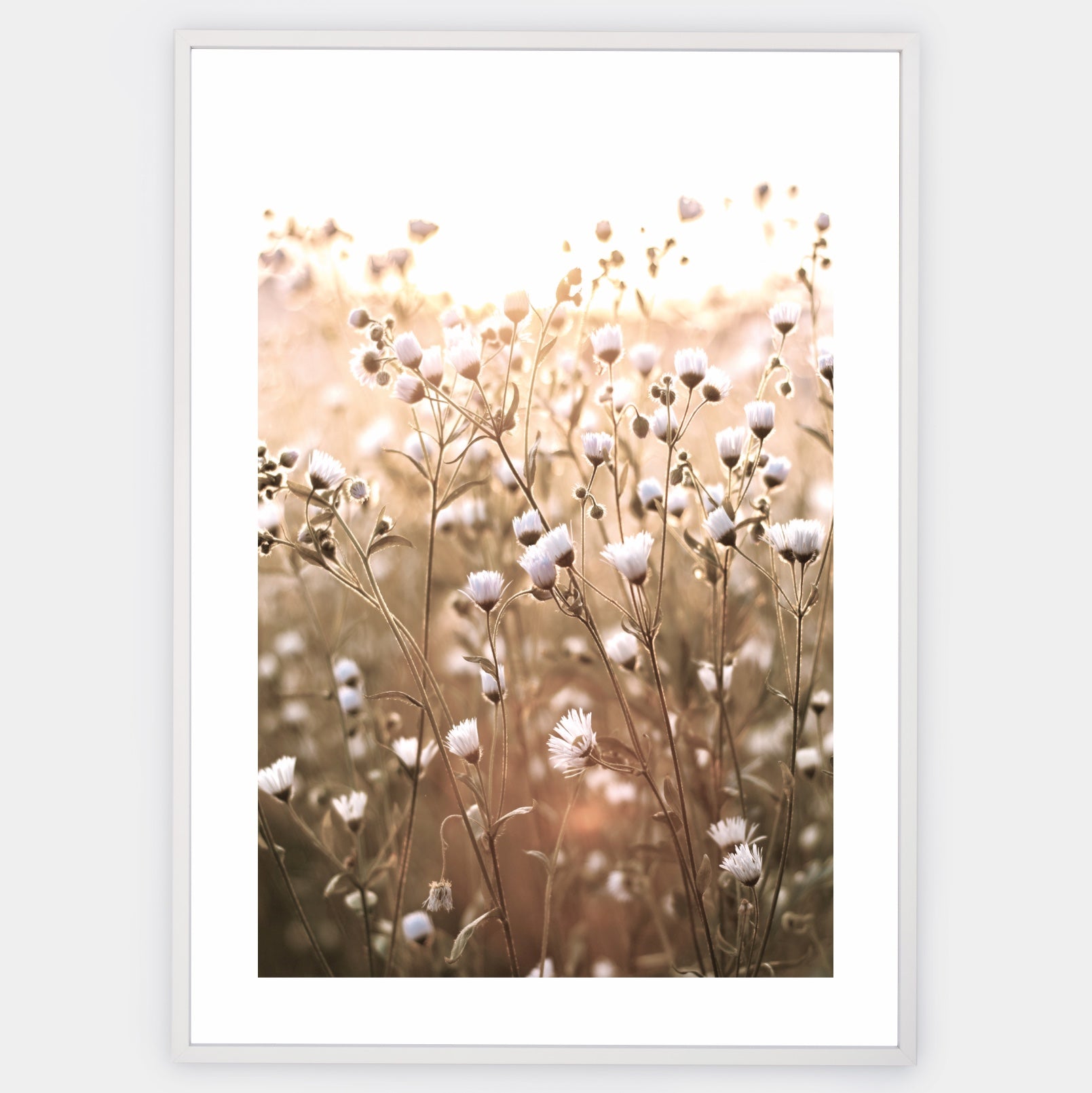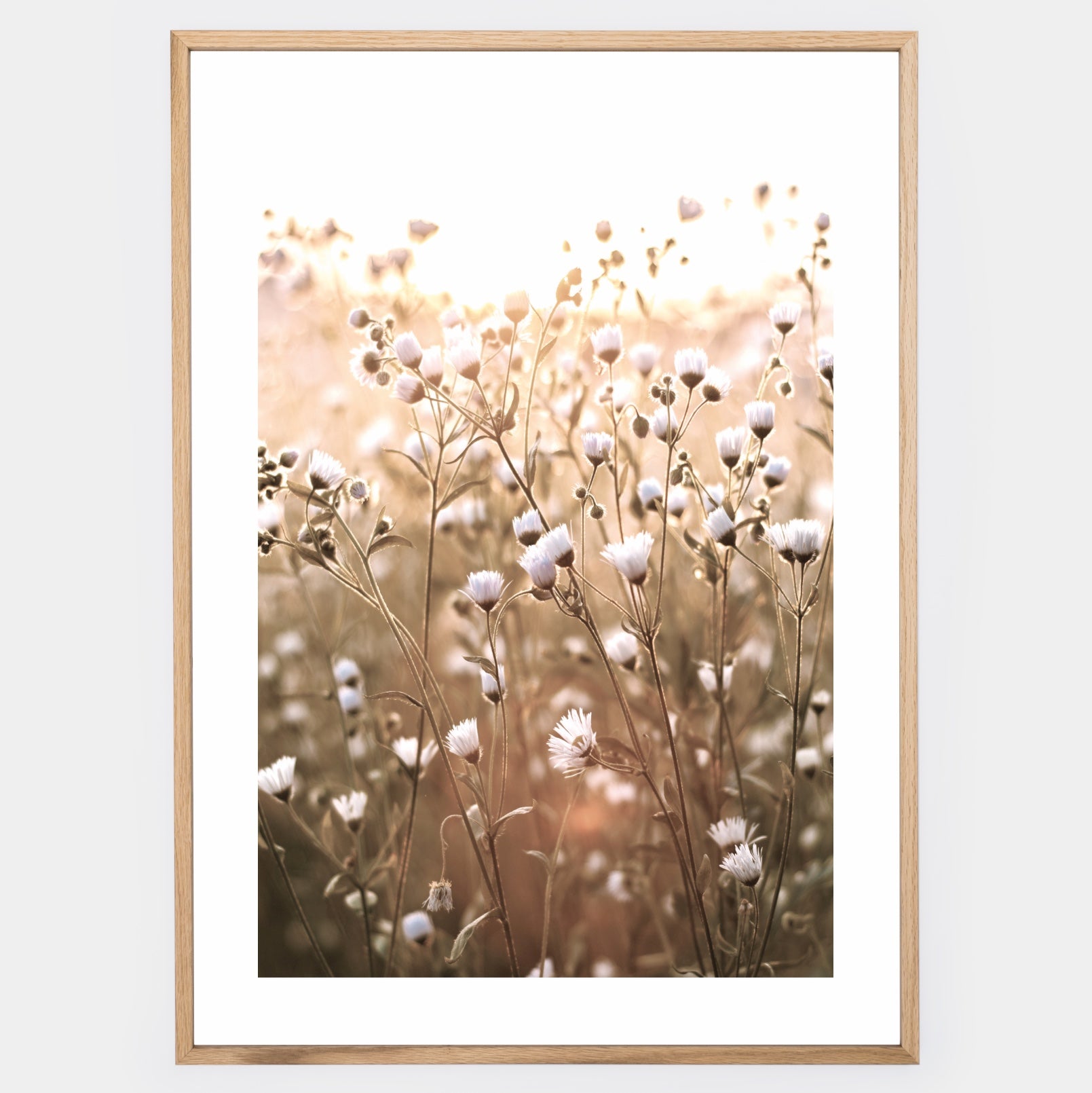 Boho plagát s fotografiou lúčnych kvetov. Elegantný biely okraj je súčasťou printu. Poster sa predáva bez rámu s možnosťou doobjednať tenký drevený rám o hrúbke 1,2 cm. Na výber sú tri farebné prevedenia - biely, čierny a dubový dizajn.