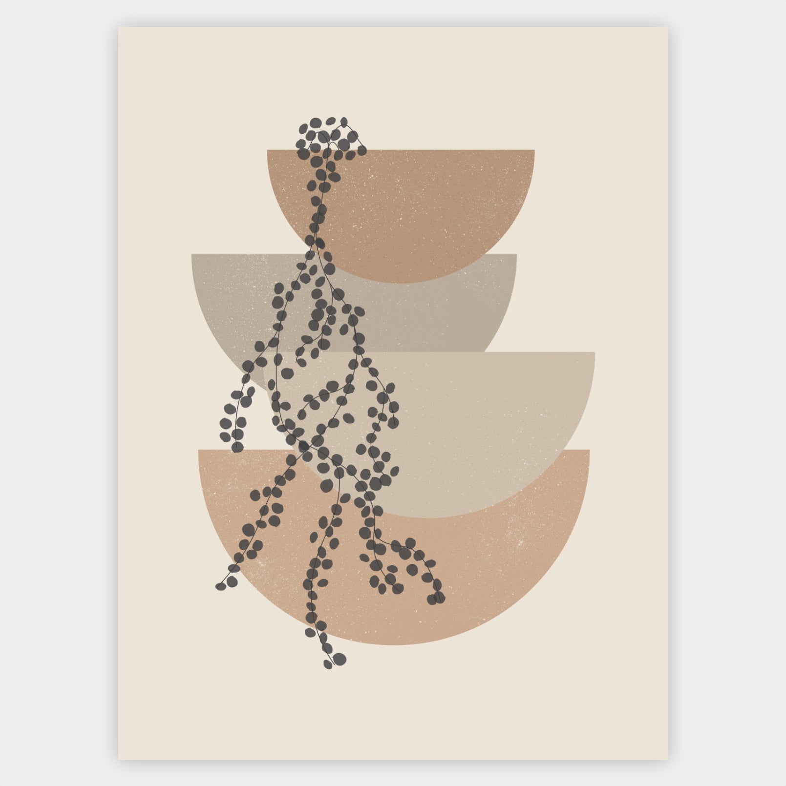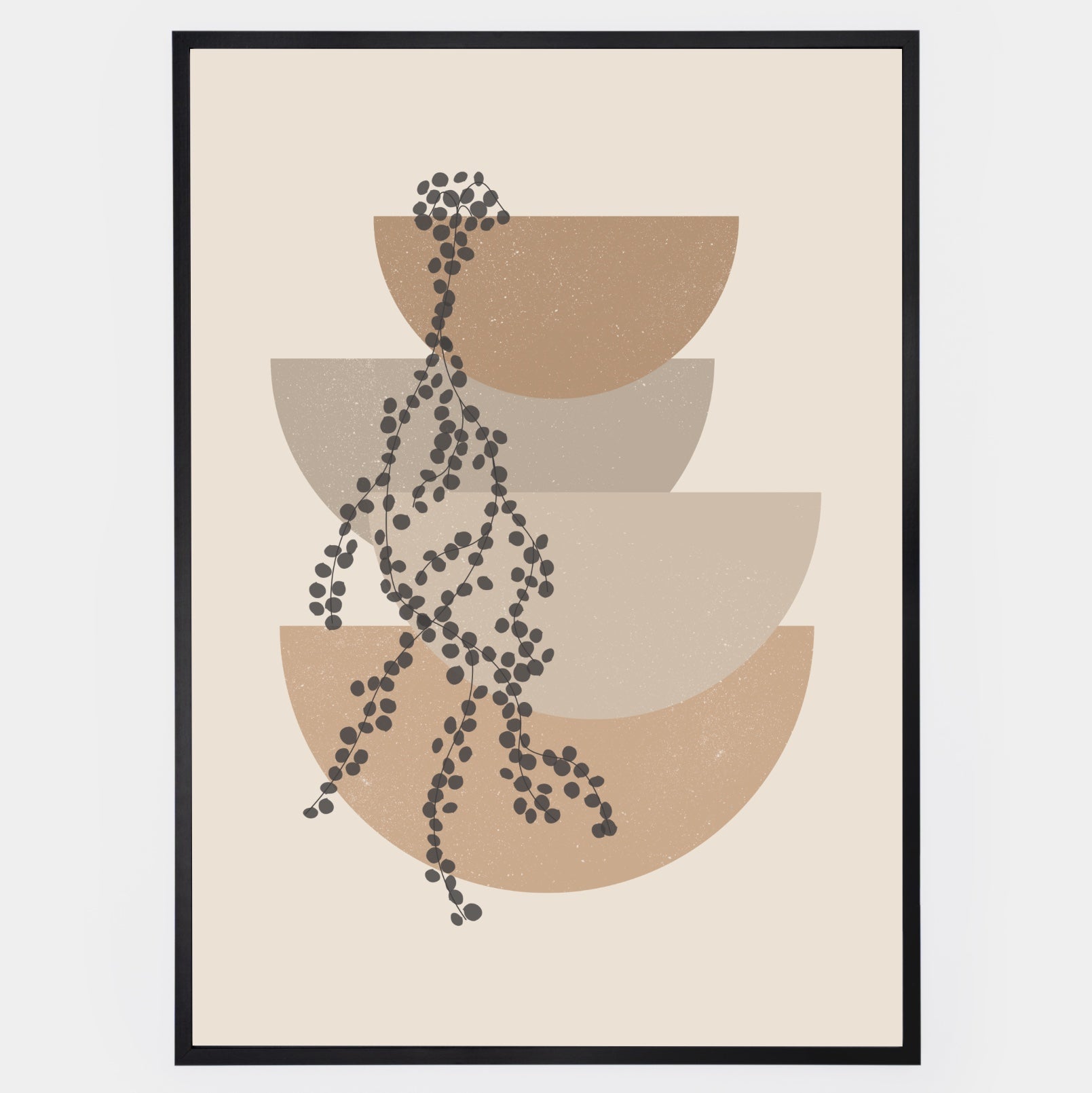 Boho plagát s geometrickými tvarmi a ťahavou rastlinou v béžových odtieňoch. Poster sa predáva bez rámu s možnosťou doobjednať tenký drevený rám o hrúbke 1,2 cm. Na výber sú tri farebné prevedenia - biely, čierny a dubový dizajn.