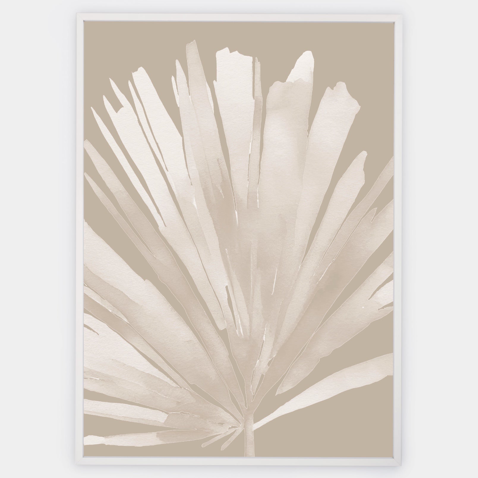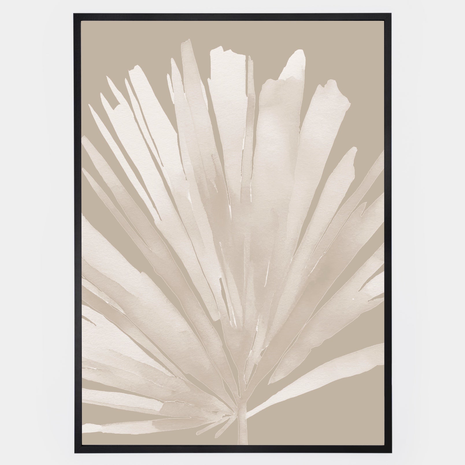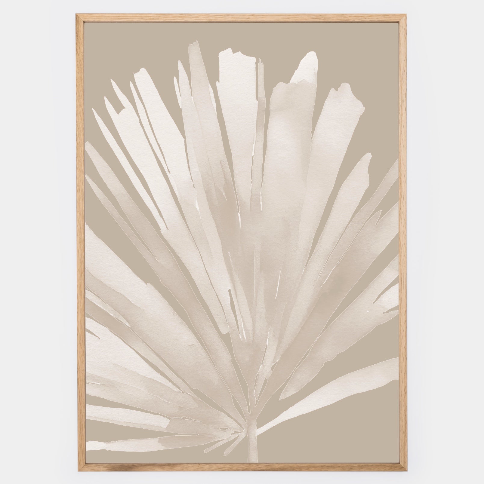 Boho plagát s akvarelovou maľbou palmového listu na béžovom podklade 2. Poster sa predáva bez rámu s možnosťou doobjednať tenký drevený rám o hrúbke 1,2 cm. Na výber sú tri farebné prevedenia - bielyčierny a dubový dizajn.