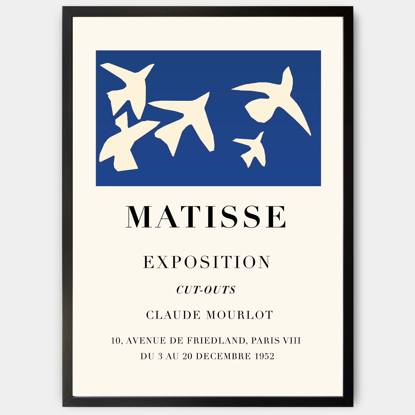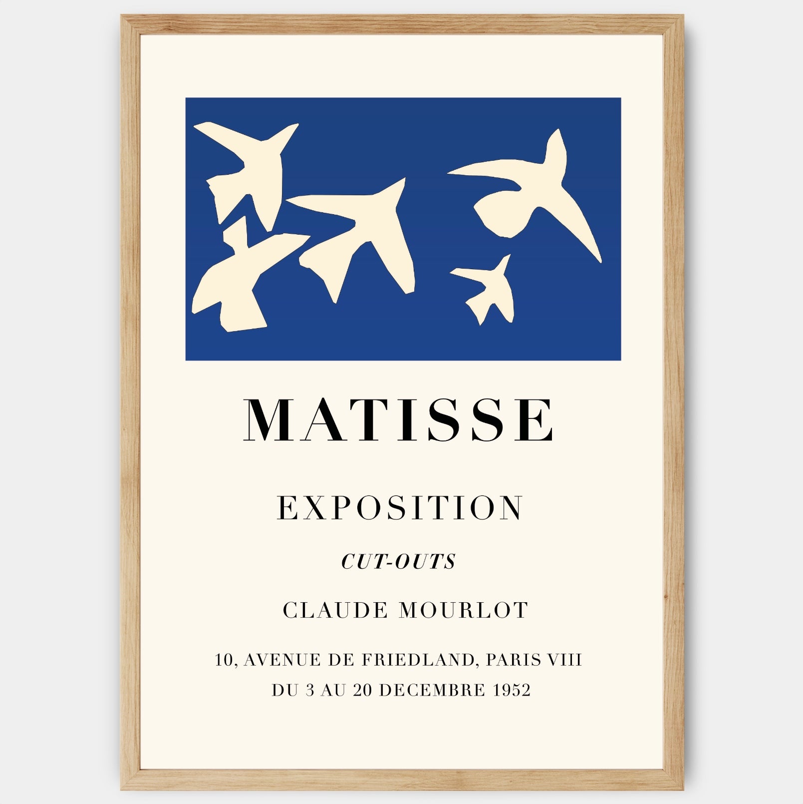 Remake výstavného plagátu s motívom diela Henriho Matissa z roku 1952. Poster sa predáva bez rámu s možnosťou doobjednať tenký drevený rám o hrúbke 1,2 cm. Na výber sú tri farebné prevedenia - biely, čierny a dubový dizajn.