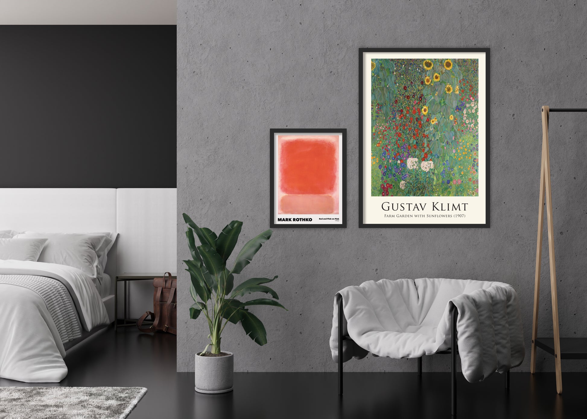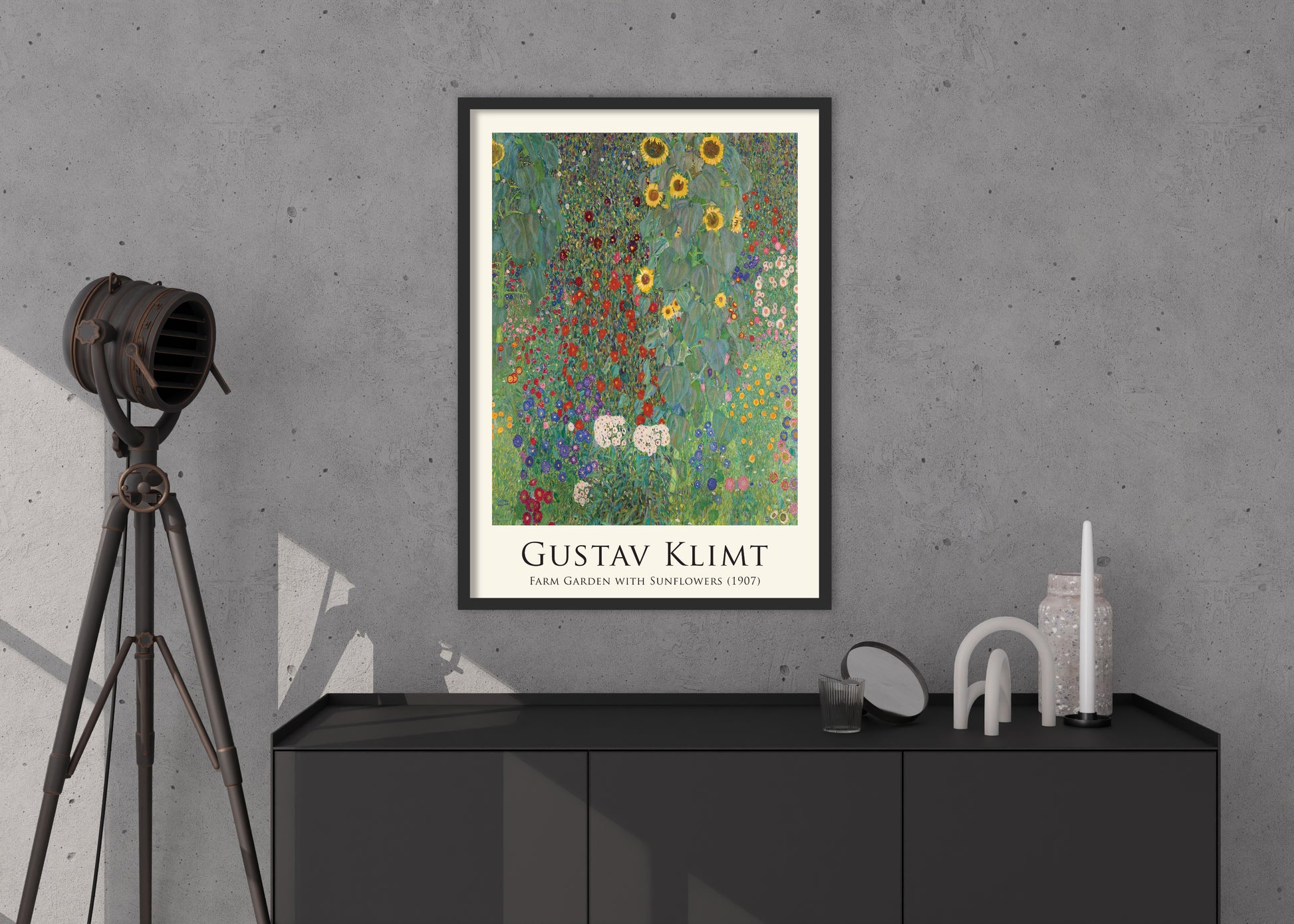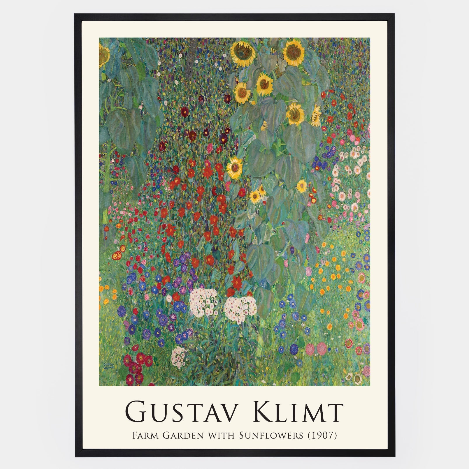 Plagát s motívom diela od Gustava Klimta s názvom "Farm Garden with Sunflowers". Poster sa predáva bez rámu s možnosťou doobjednať tenký drevený rám o hrúbke 1,2 cm. Na výber sú tri farebné prevedenia - biely, čierny a dubový dizajn.