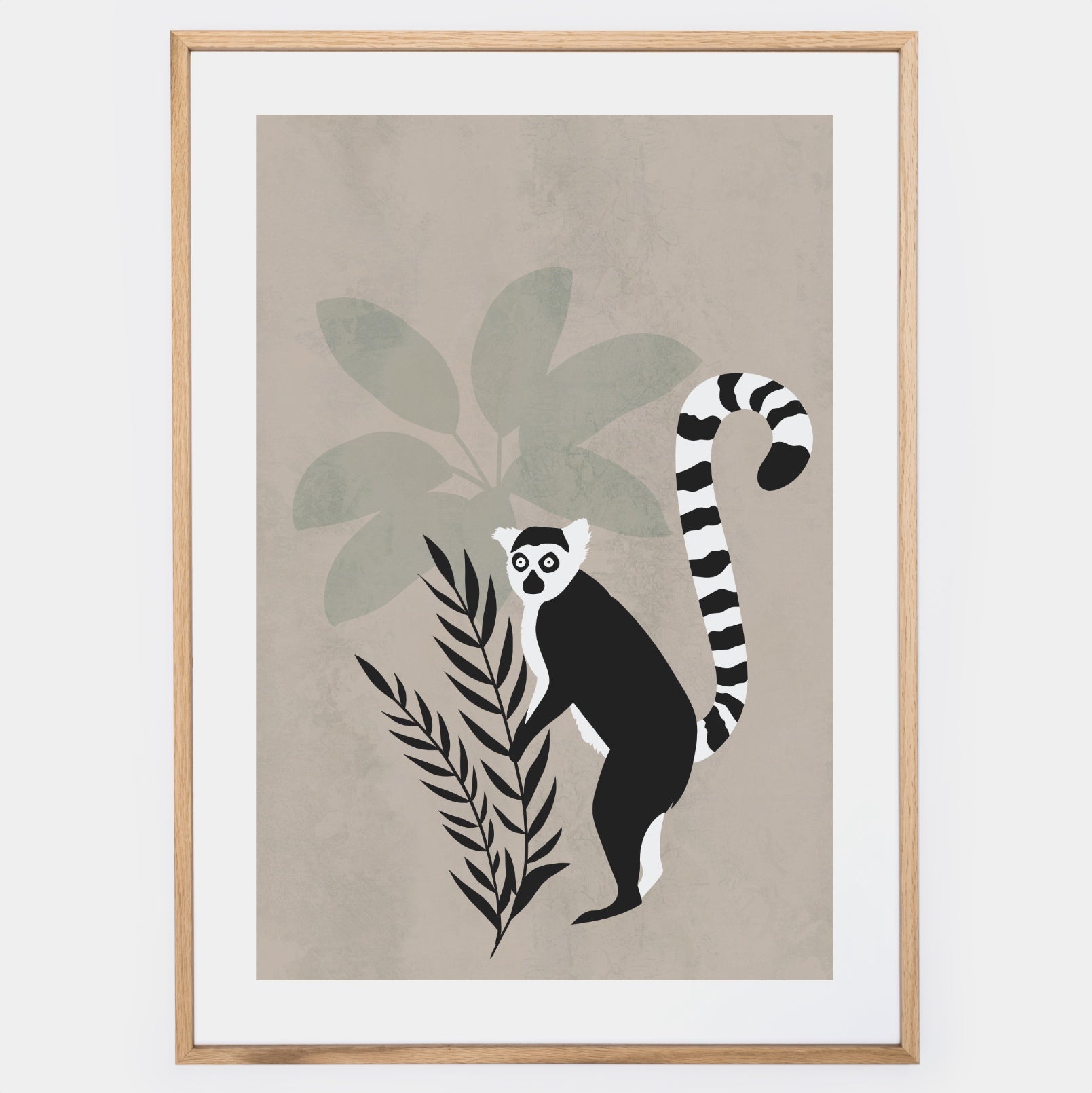 Plagát s grafikou stojacieho lemura. Elegantný biely okraj je súčasťou printu. Poster sa predáva bez rámu s možnosťou doobjednať tenký drevený rám o hrúbke 1,2 cm. Na výber sú tri farebné prevedenia - bielyčierny a dubový dizajn.