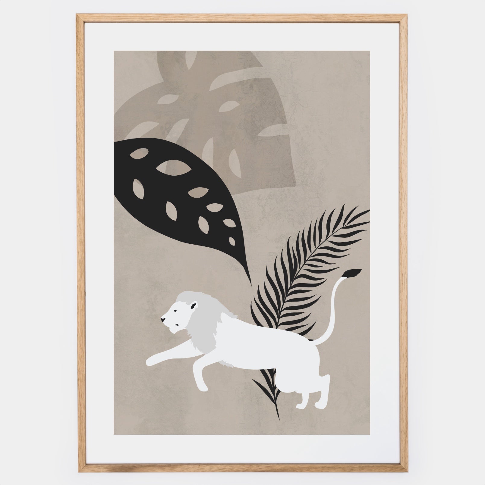 Plagát s grafikou skáčuceho leva. Elegantný biely okraj je súčasťou printu. Poster sa predáva bez rámu s možnosťou doobjednať tenký drevený rám o hrúbke 1,2 cm. Na výber sú tri farebné prevedenia - bielyčierny a dubový dizajn.
